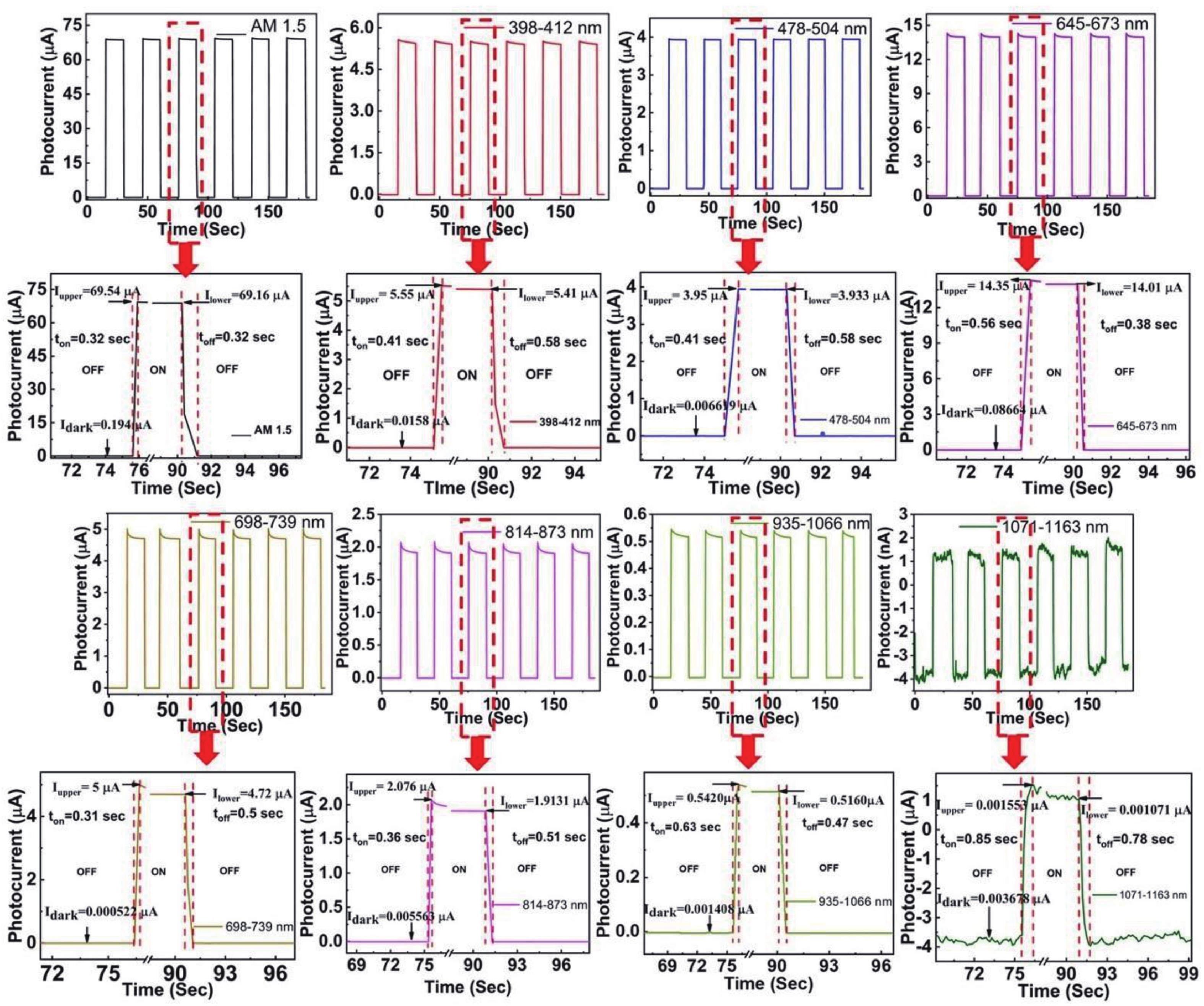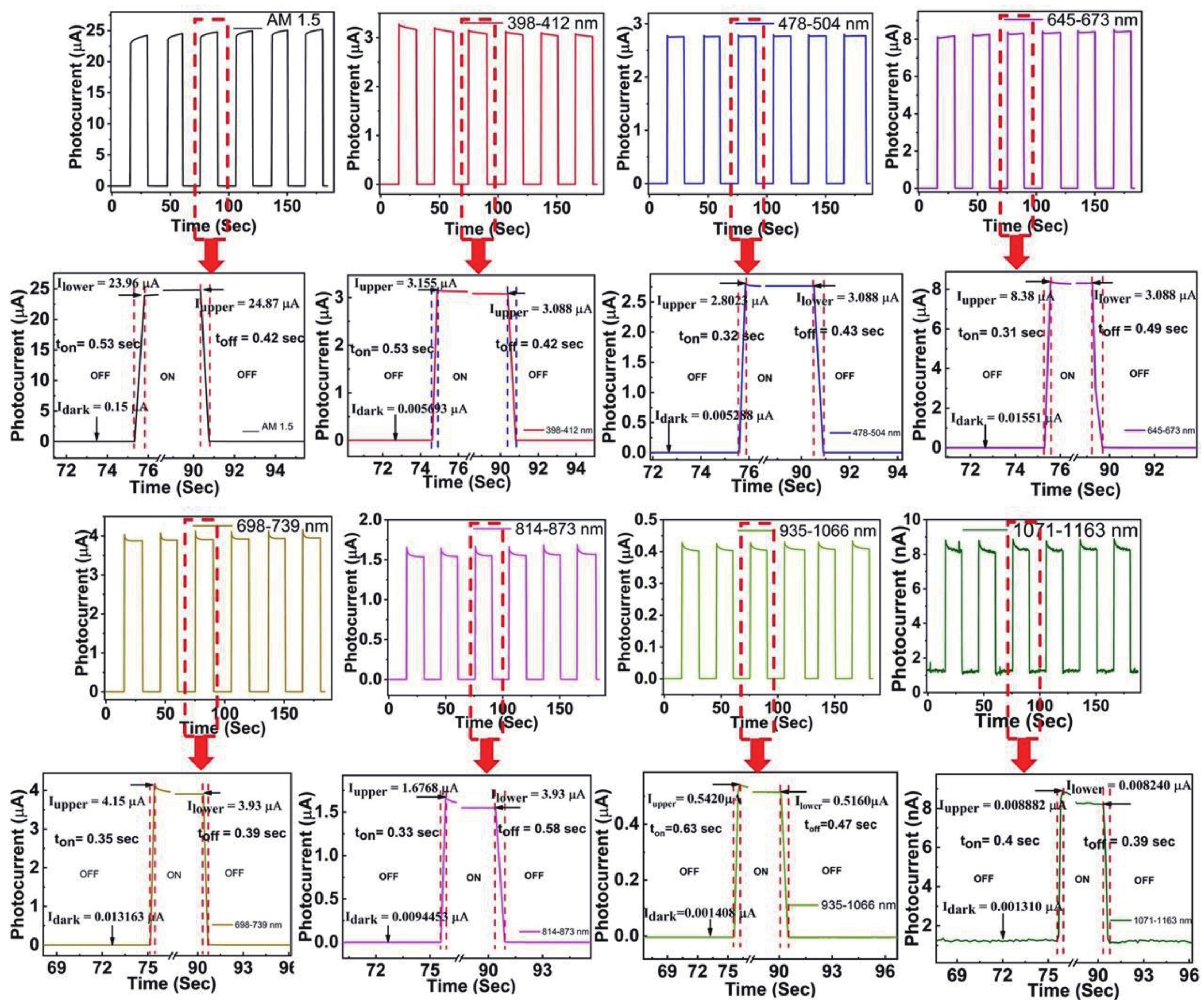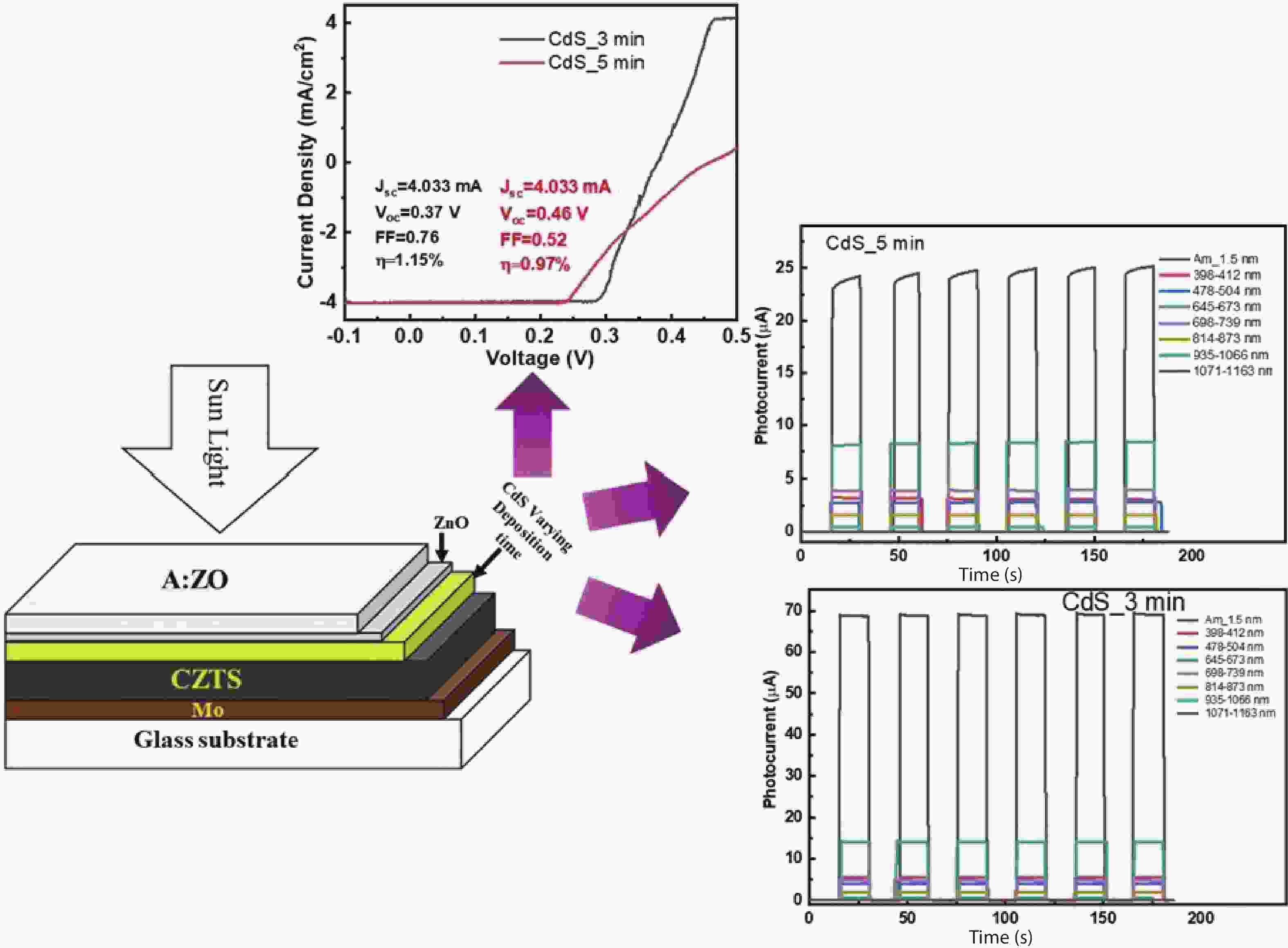 CZTS (Cu2ZnSnS4) is a quaternary semiconductor that is environmentally friendly, less expensive. In this paper, we report on the optimization and fabrication of CZTS-based heterojunction nanodevices for bifunctional applications such as solar cells and photodetectors. CZTS thin films were deposited on top of (Molybdenum) Mo-coated glass substrates via RF sputtering at 100 and 200 W. Rapid thermal processing (RTP) was used at 300, 400, and 500 °C temperatures. CdS (cadmium sulphide) was deposited on CZTS using a chemical bath deposition system with 3- and 5-min deposition times. ZnO (zinc oxide) and AZO (aluminium doped zinc oxide) layers were deposited using RF (radio frequency) sputtering to create the solar device. XRD confirms the formation of a tetragonal structure with increased crystallinity due to the use of RTP. Raman reveals the characteristic Raman shift peak associated with CZTS at 336 and 335 cm−1. The FESEM shows a relationship with RTP temperature. Surface features, including grain size, vary with RTP temperature. The ideality factor is nearly 2, indicating imperfection in the Mo/CZTS interface. Schottky barrier height estimates range from 0.6 to 0.7 eV. Absorbance and transmittance show a predictable fluctuation with RTP temperature. Photovoltaic device was built using the higher crystalline feature of CZTS in conjunction with CdS deposited at 3 and 5 min. The efficiency of CdS deposited after 3 and 5 min was 1.15 and 0.97 percent, respectively. Fabricated devices were used for wavelength-dependent photodetection. This work demonstrated self-powered photodetection.