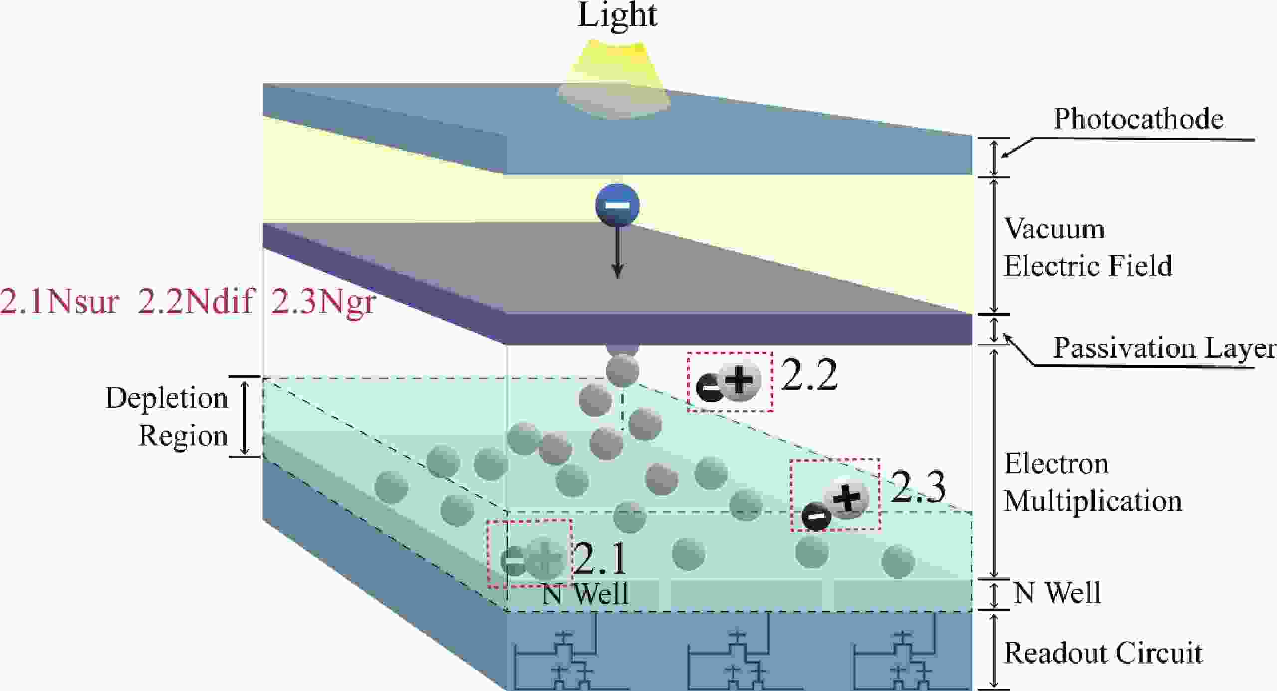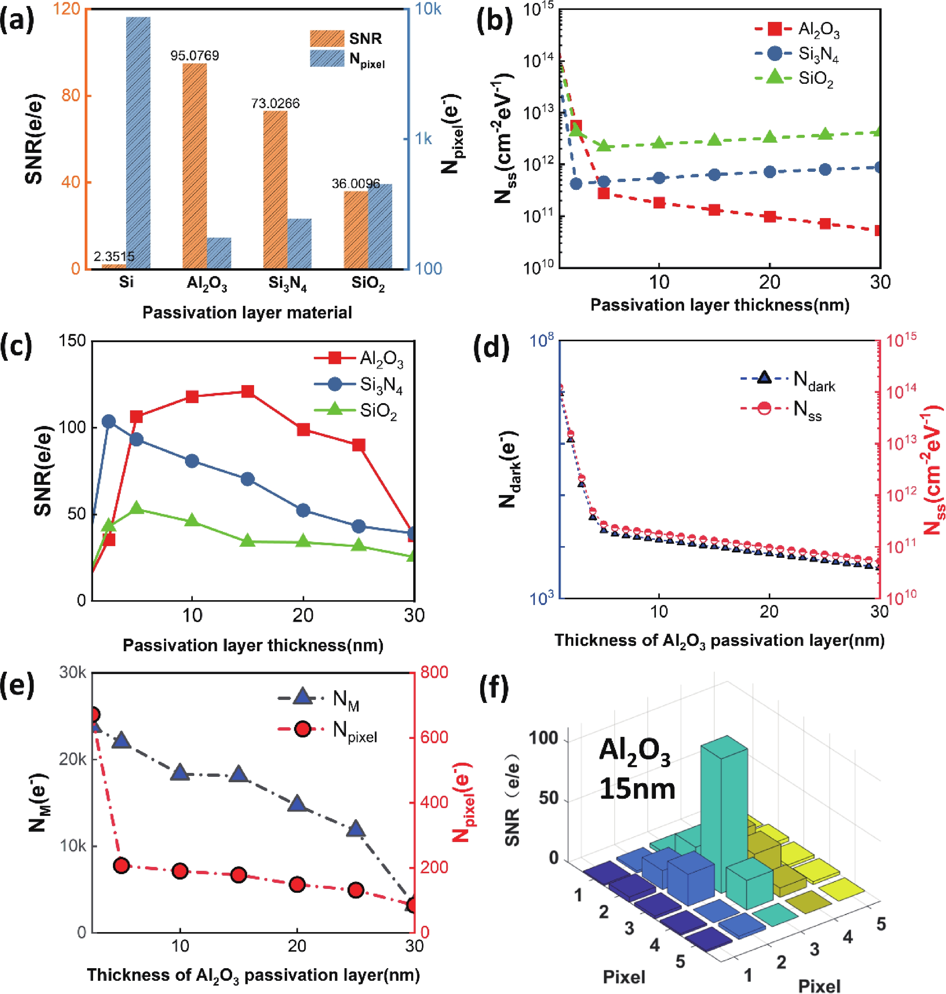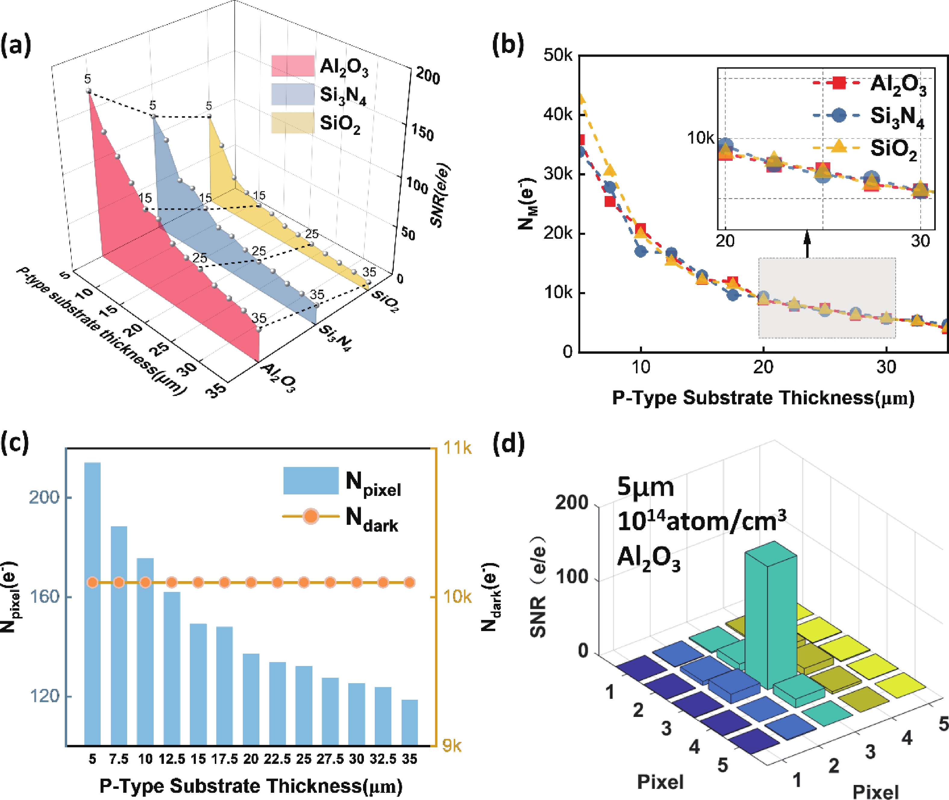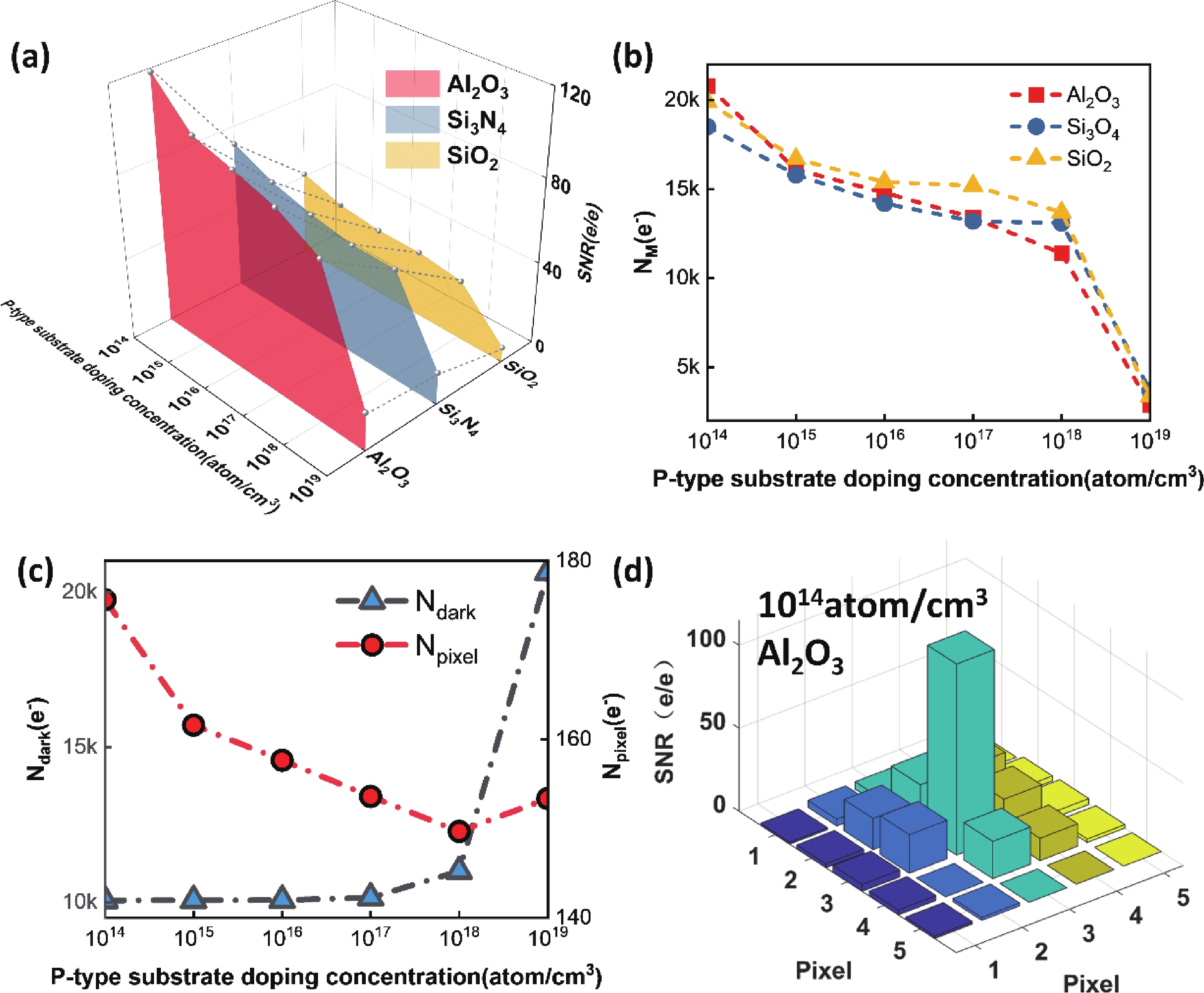 In this study, with the aim of achieving a high signal-to-noise ratio (SNR) in an electron-bombarded complementary metal−oxide−semiconductor (EBCMOS) imaging chip, we analyzed the sources of noise using principles from low-light-level imaging and semiconductor theory, and established a physical computational model that relates the electron-multiplication layer to the noise characteristics of an EBCMOS chip in a uniformly doped structure with a P-type substrate. We conducted theoretical calculations to analyze the effects on noise characteristics of the passivation layer material and thickness, P-substrate doping concentration, P-substrate thickness, incident electron energy, and substrate temperature. By comparing the characteristics of pixel noise, dark current, multiplication electron numbers, and SNR under various structures, we simulated optimized structural parameters of the device. Our simulation results showed that the noise characteristics of the device could be optimized using an Al2O3 passivation thickness of 15 nm and substrate temperature of 260 K, and by decreasing the doping concentration and thickness of the P-type substrate and increasing the incident electron energy. The optimized SNR were 252 e/e. And the substantial impact of dark current noise, primarily governed by interfacial defects, on the overall noise characteristics of the device. This research offers theoretical support to develop EBCMOS imaging chips with high gain and SNR.