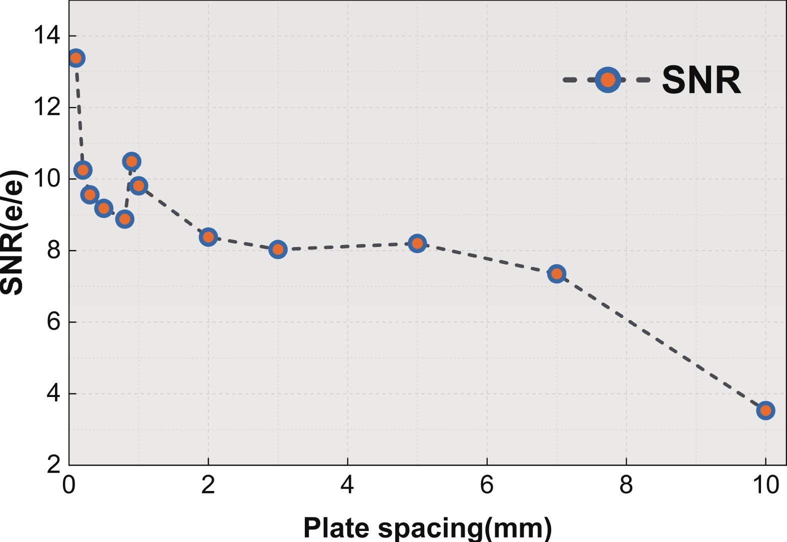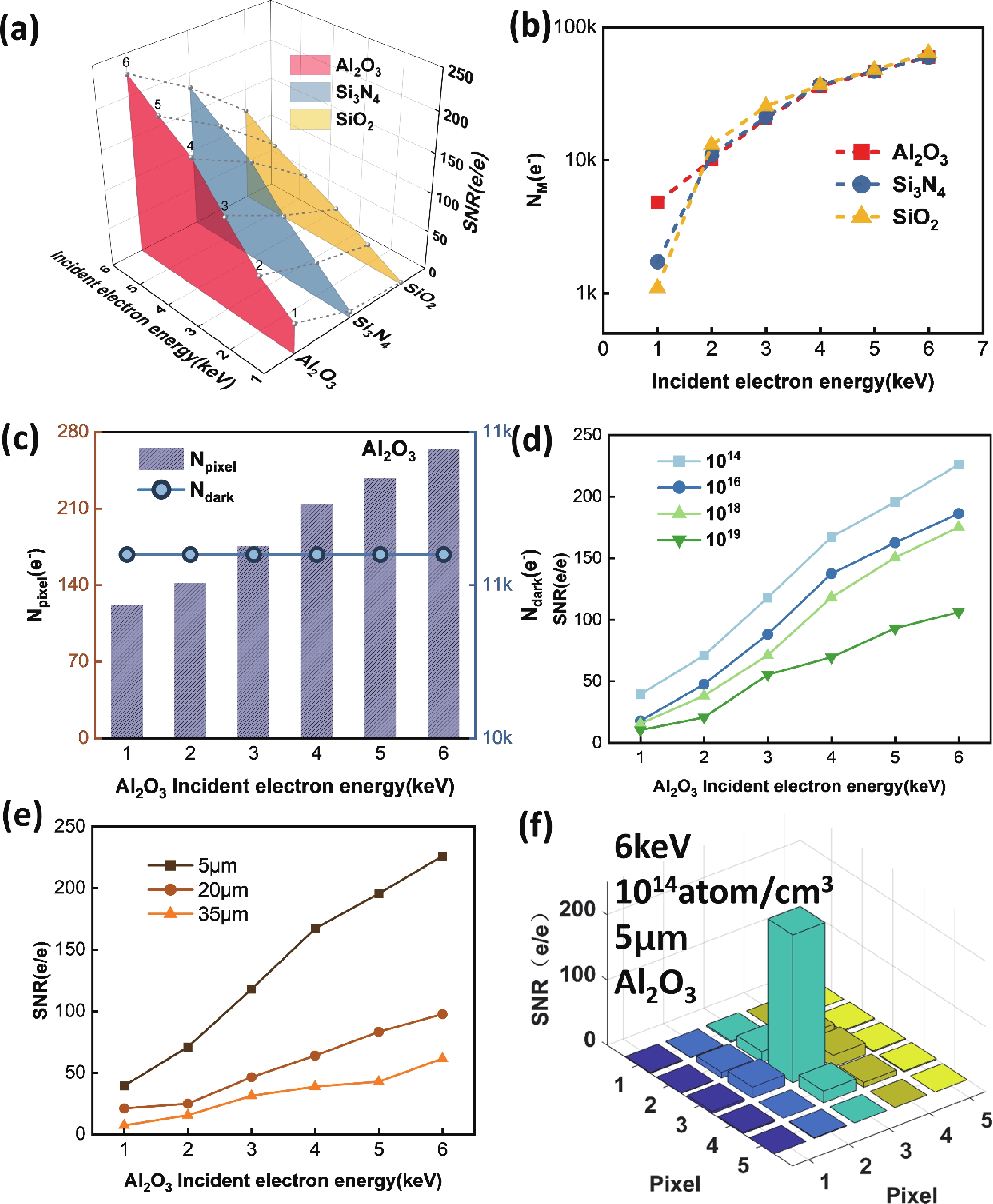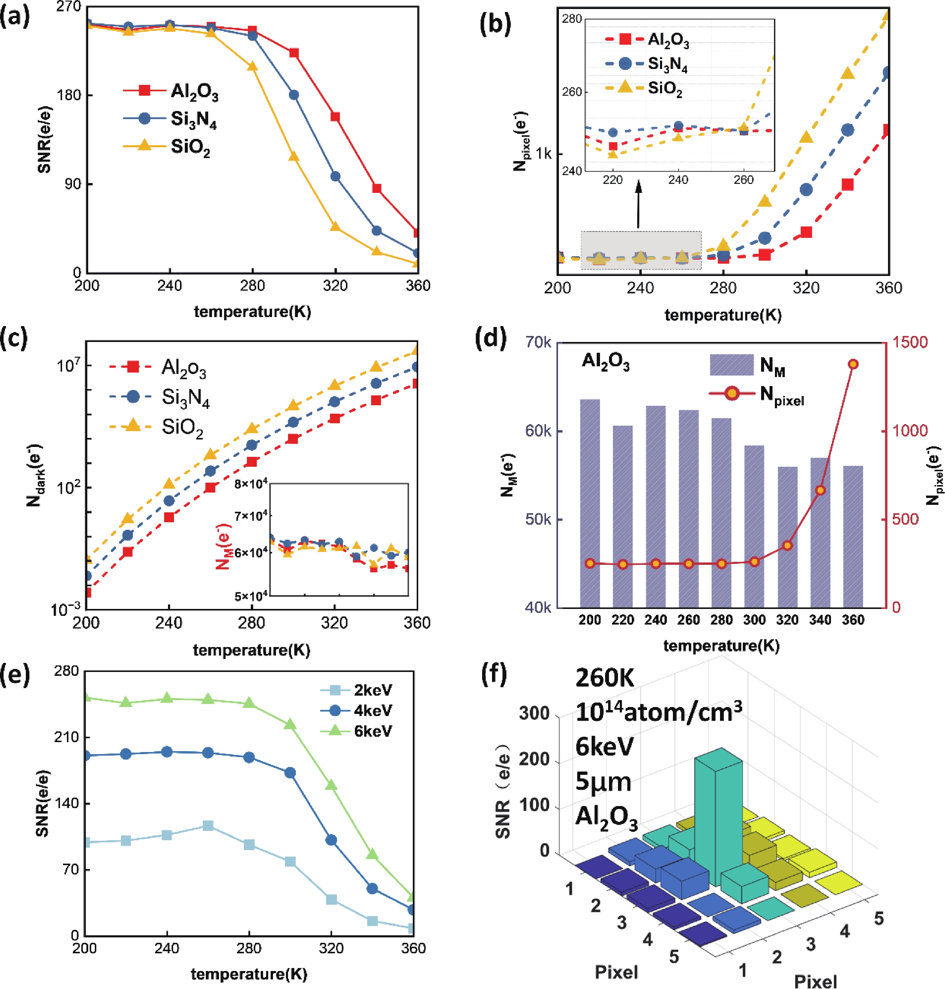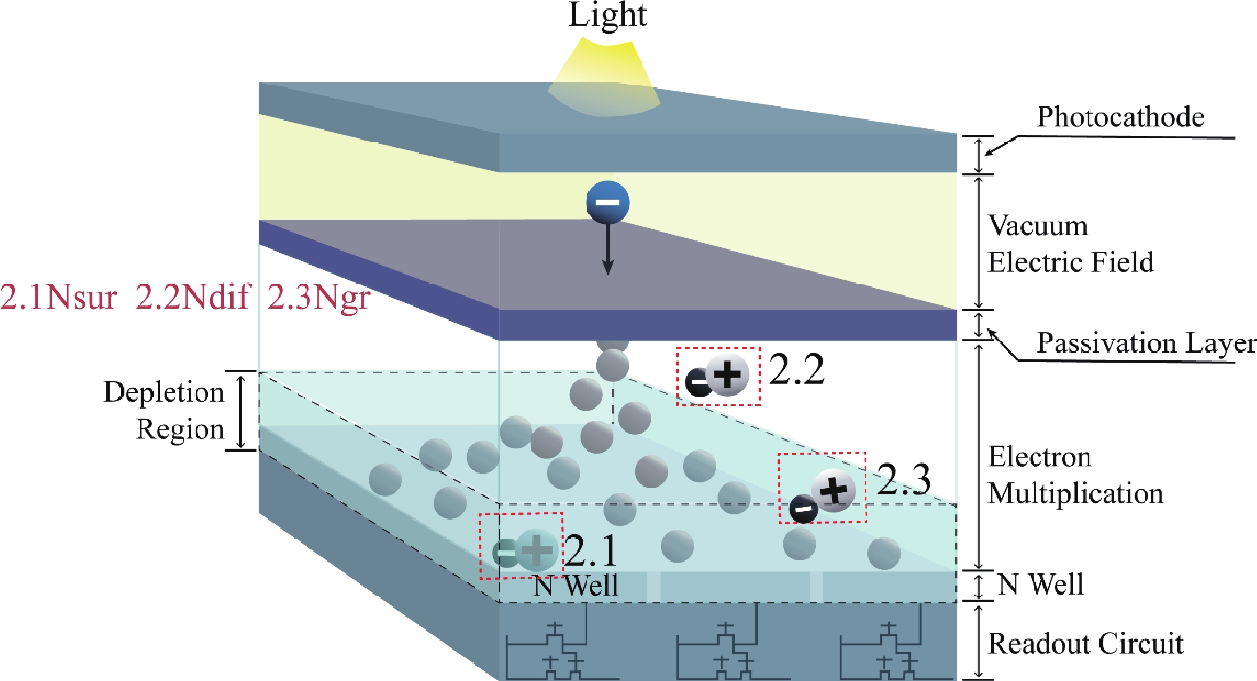 In this study, with the aim of achieving a high signal-to-noise ratio (SNR) in an electron-bombarded complementary metal−oxide−semiconductor (EBCMOS) imaging chip, we analyzed the sources of noise using principles from low-light-level imaging and semiconductor theory, and established a physical computational model that relates the electron-multiplication layer to the noise characteristics of an EBCMOS chip in a uniformly doped structure with a P-type substrate. We conducted theoretical calculations to analyze the effects on noise characteristics of the passivation layer material and thickness, P-substrate doping concentration, P-substrate thickness, incident electron energy, and substrate temperature. By comparing the characteristics of pixel noise, dark current, multiplication electron numbers, and SNR under various structures, we simulated optimized structural parameters of the device. Our simulation results showed that the noise characteristics of the device could be optimized using an Al2O3 passivation thickness of 15 nm and substrate temperature of 260 K, and by decreasing the doping concentration and thickness of the P-type substrate and increasing the incident electron energy. The optimized SNR were 252 e/e. And the substantial impact of dark current noise, primarily governed by interfacial defects, on the overall noise characteristics of the device. This research offers theoretical support to develop EBCMOS imaging chips with high gain and SNR.