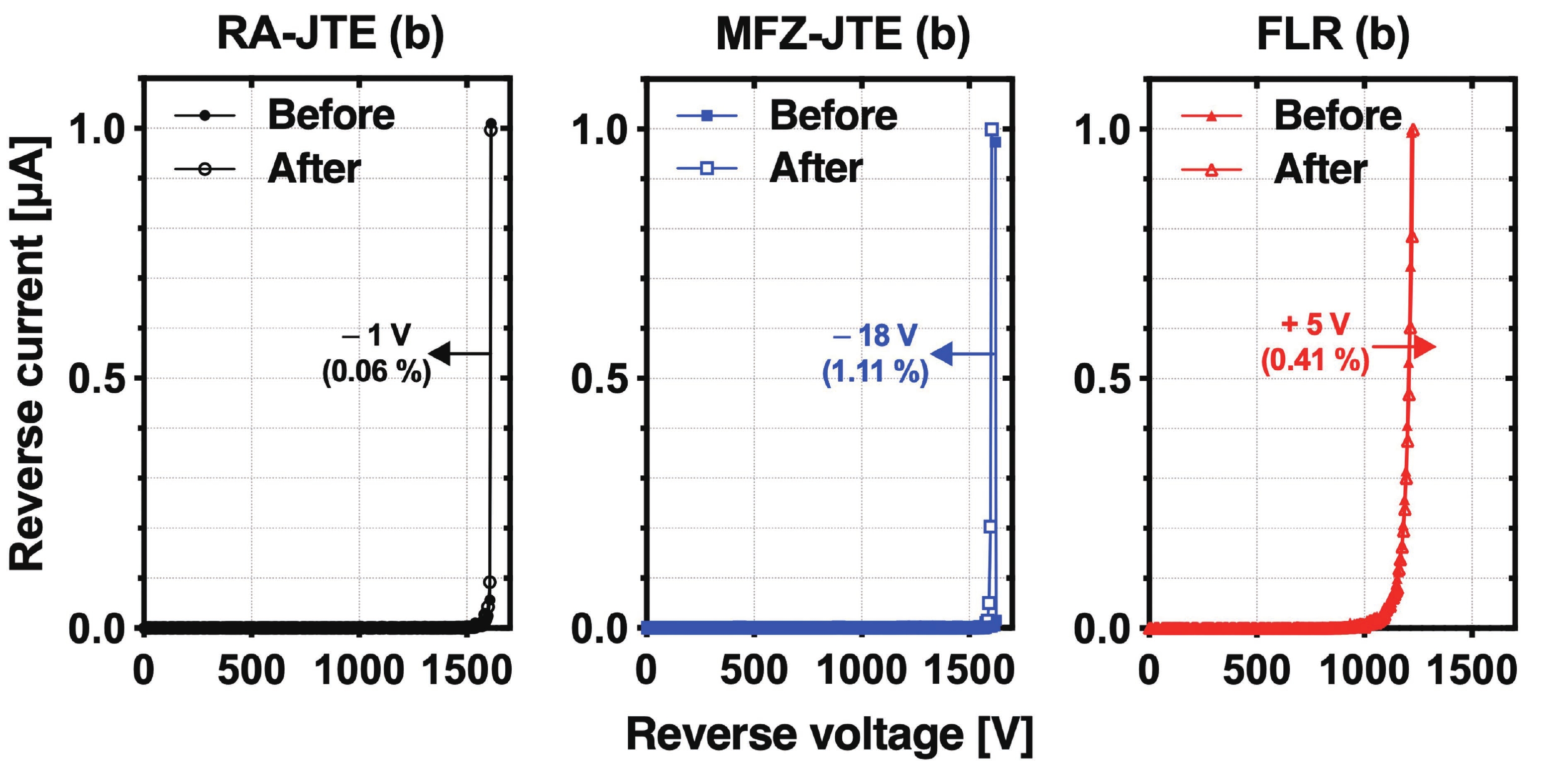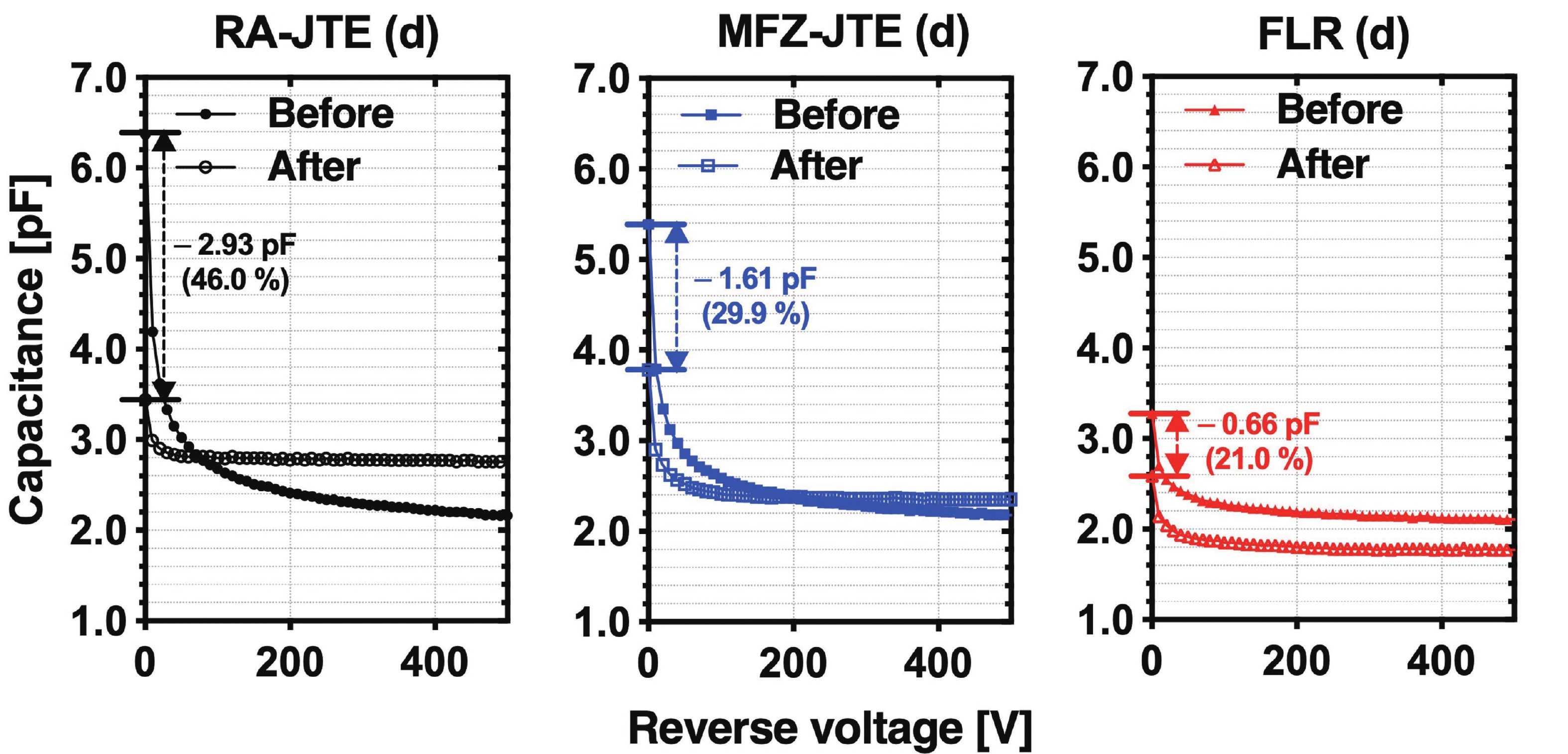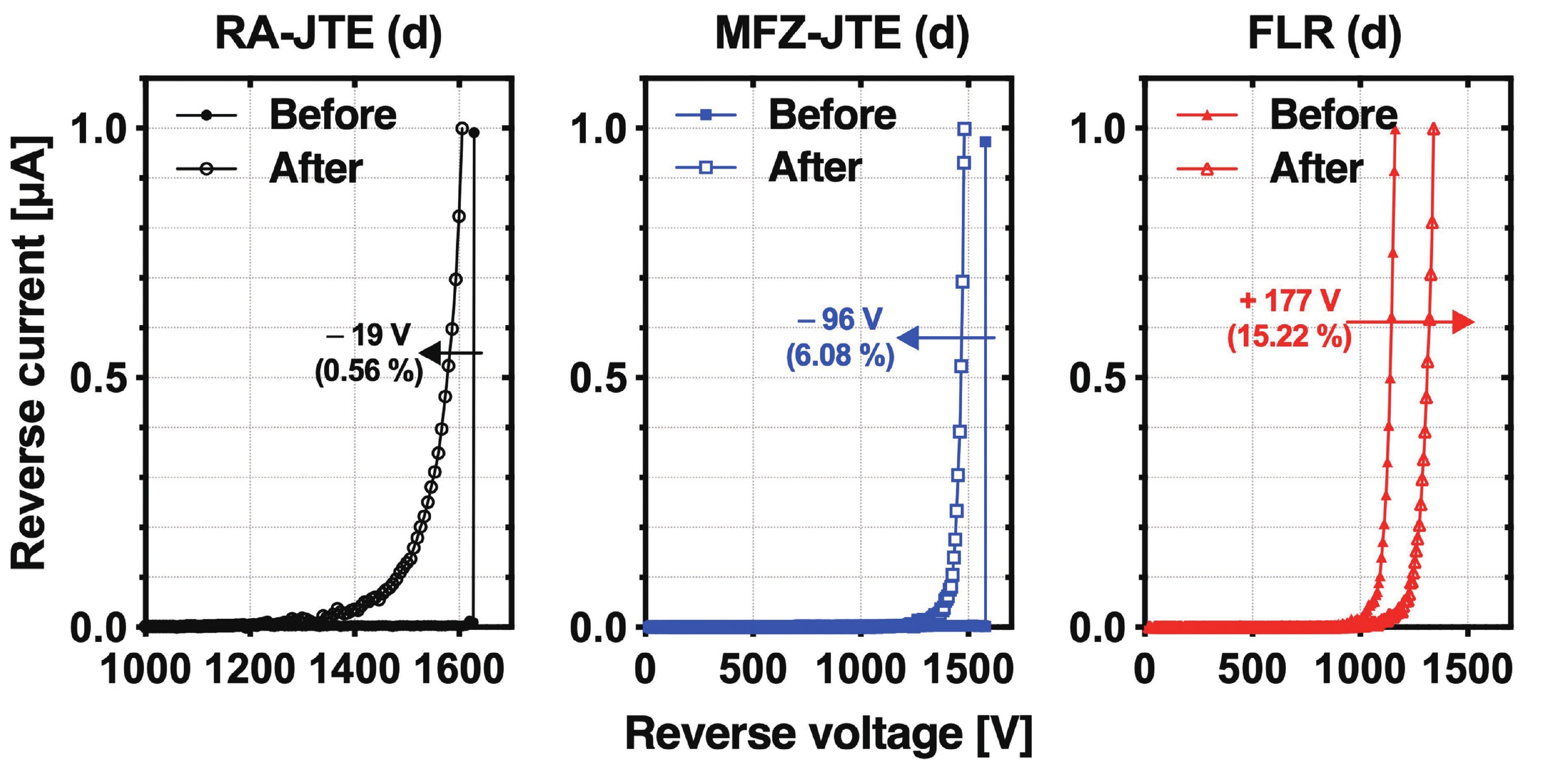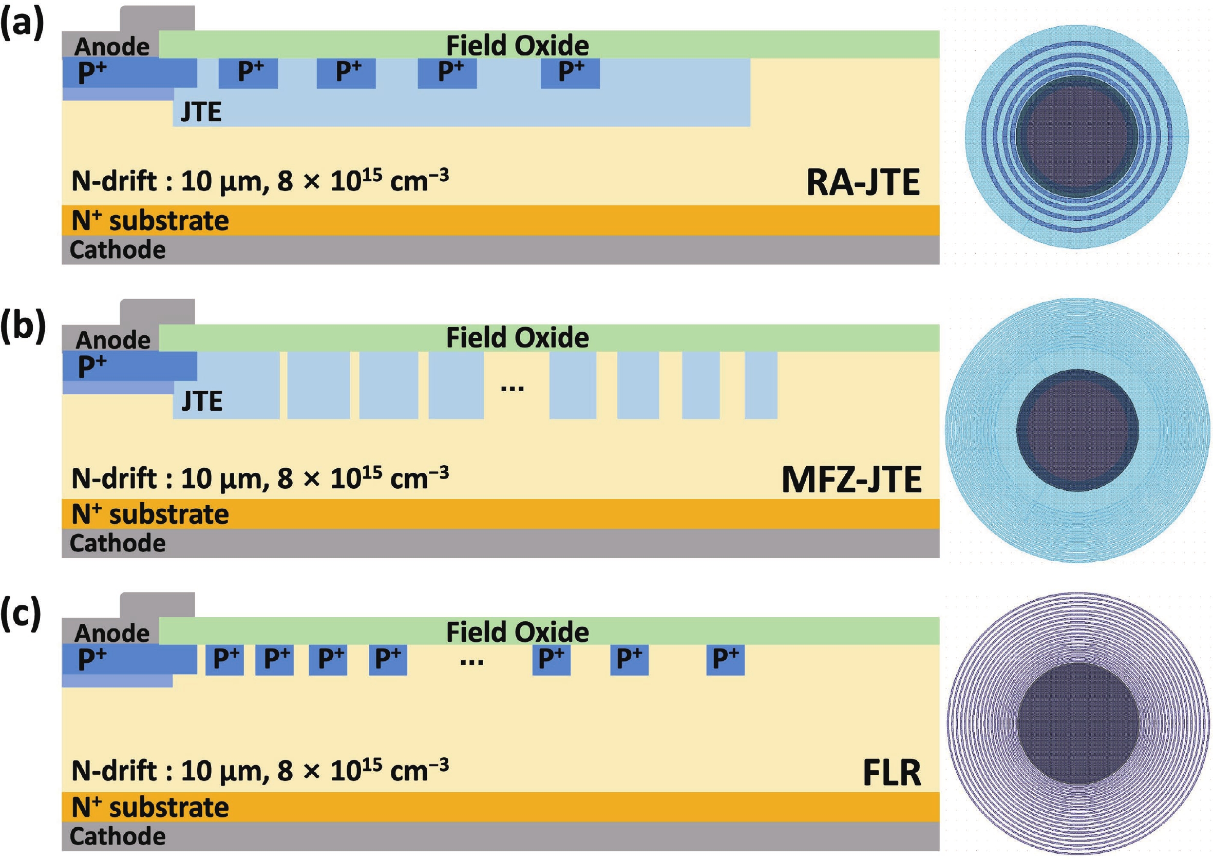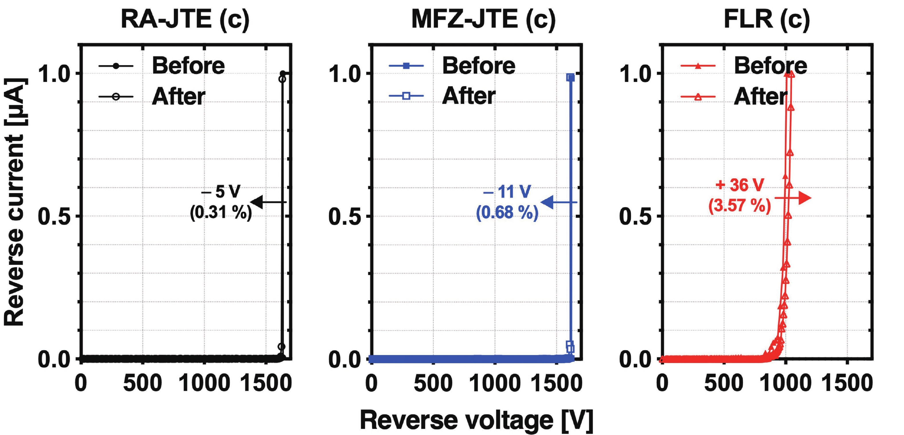 This work presents a systematic analysis of proton-induced total ionizing dose (TID) effects in 1.2 kV silicon carbide (SiC) power devices with various edge termination structures. Three edge terminations including ring-assisted junction termination extension (RA-JTE), multiple floating zone JTE (MFZ-JTE), and field limiting rings (FLR) were fabricated and irradiated with 45 MeV protons at fluences ranging from 1 × 1012 to 1 × 1014 cm−2. Experimental results, supported by TCAD simulations, show that the RA-JTE structure maintained stable breakdown performance with less than 1% variation due to its effective electric field redistribution by multiple P+ rings. In contrast, MFZ-JTE and FLR exhibit breakdown voltage shifts of 6.1% and 15.2%, respectively, under the highest fluence. These results demonstrate the superior radiation tolerance of the RA-JTE structure under TID conditions and provide practical design guidance for radiation-hardened SiC power devices in space and other high-radiation environments.