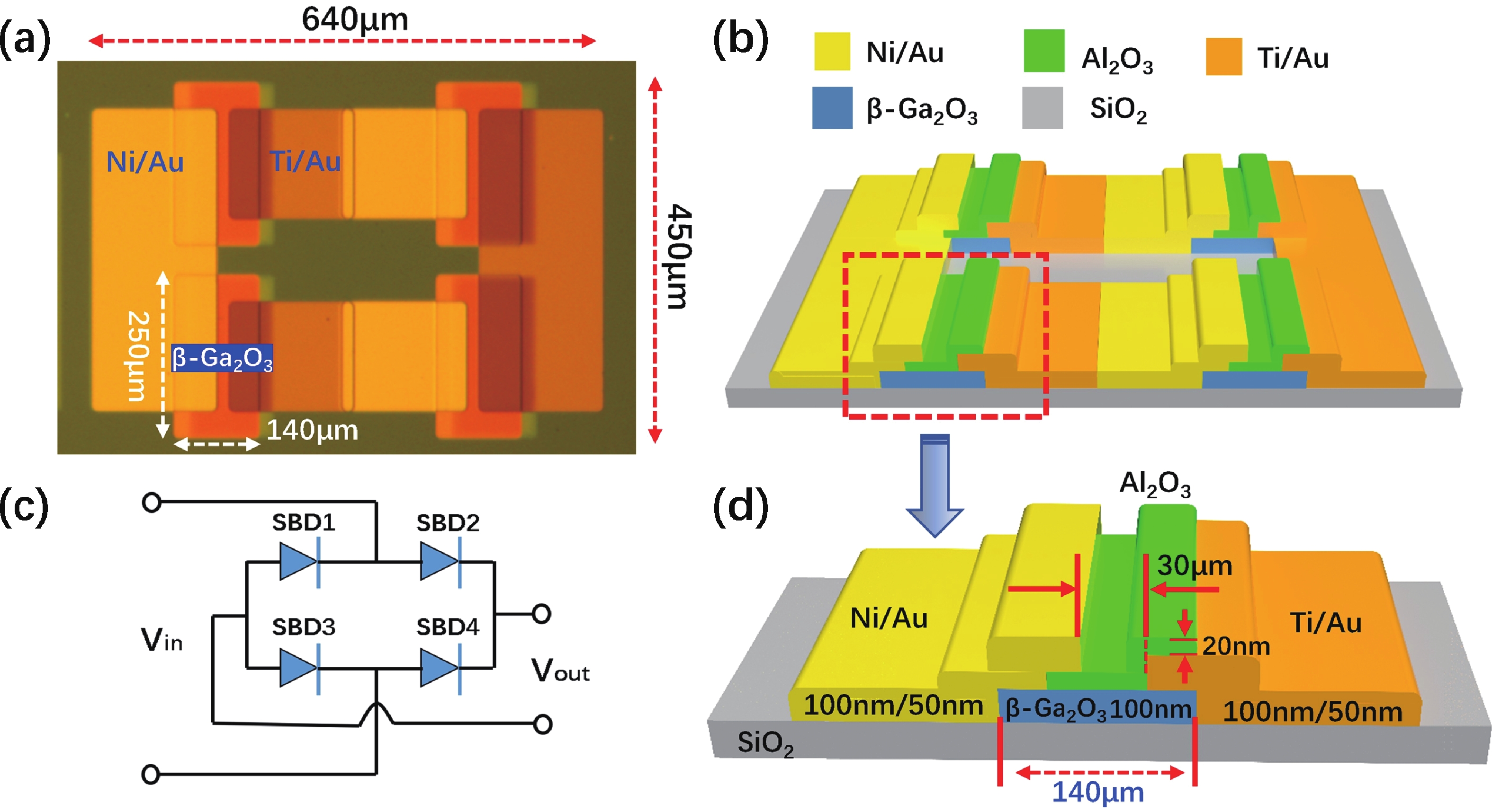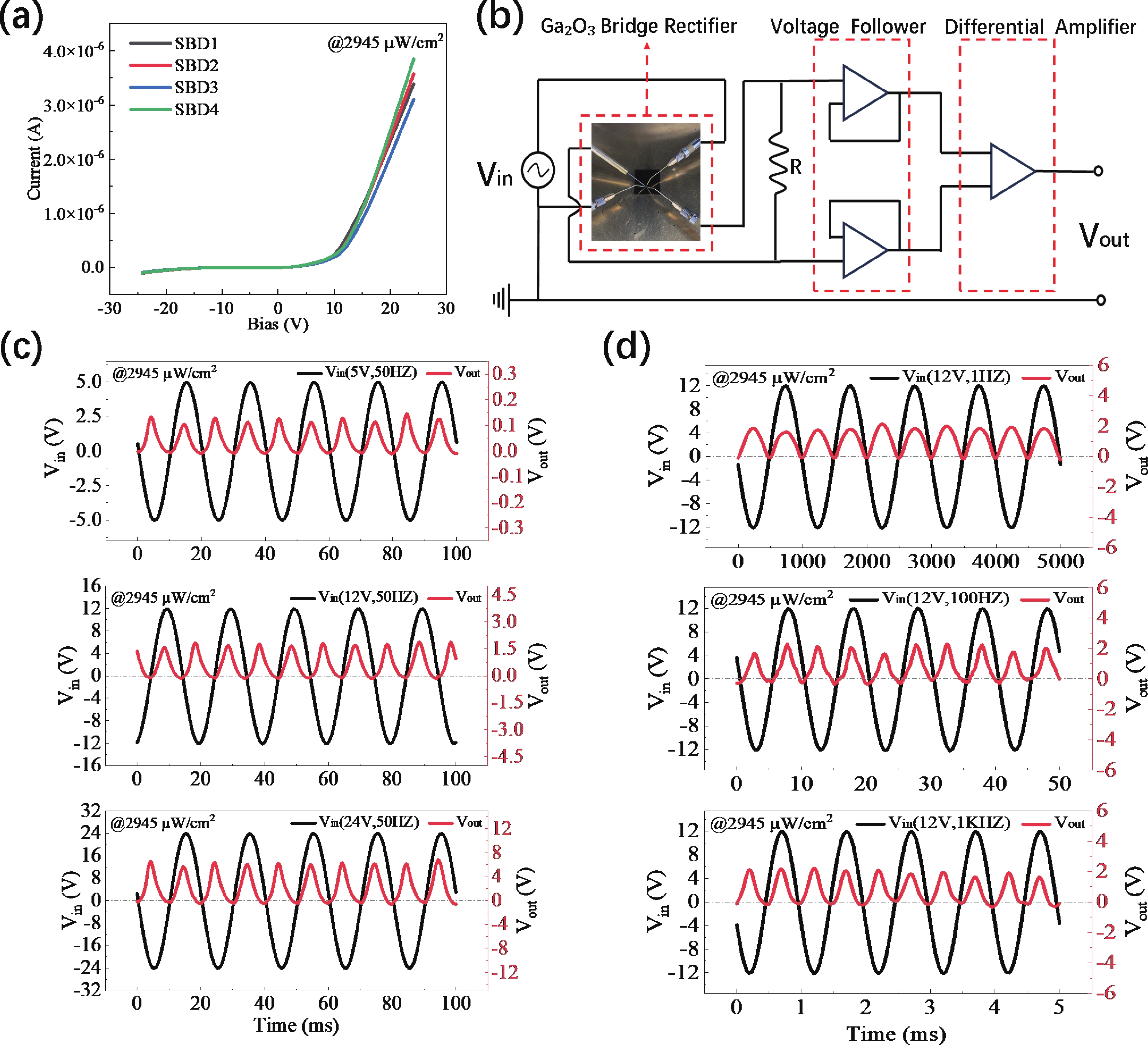 A monolithic integrated full-wave bridge rectifier consisted of horizontal Schottky-barrier diodes (SBD) is prepared based on 100 nm ultra-thin β-Ga2O3 and demonstrated the solar-blind UV (SUV) light-modulated characteristics. Under SUV light illumination, the rectifier has the excellent full-wave rectification characteristics for the AC input signals of 5, 12, and 24 V with different frequencies. Further, experimental results confirmed the feasibility of continuously tuning the rectified output through SUV light-encoding. This work provides valuable insights for the development of optically programmable Ga2O3 AC-DC converters.