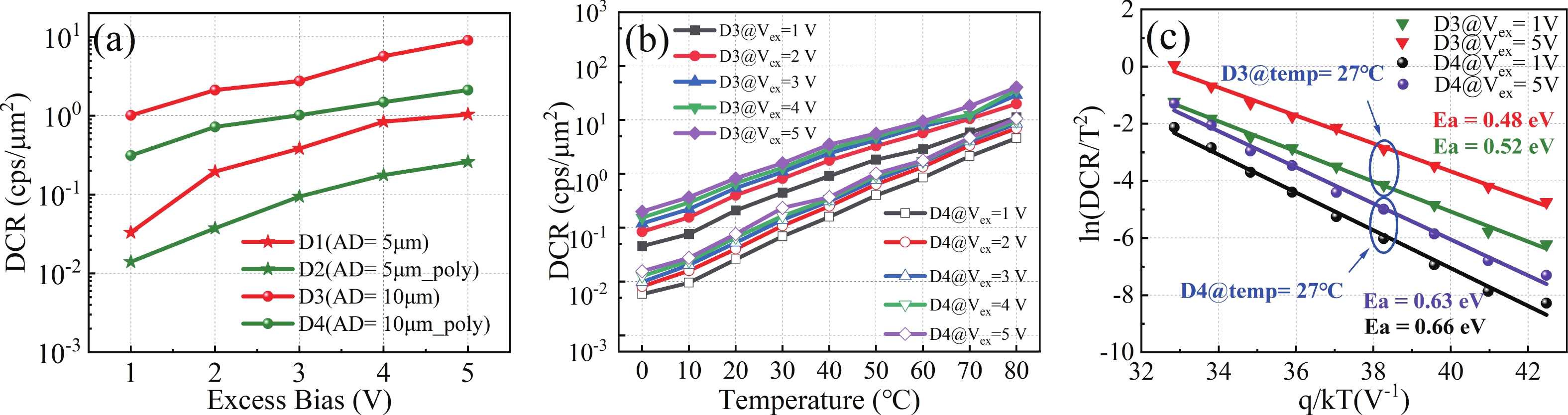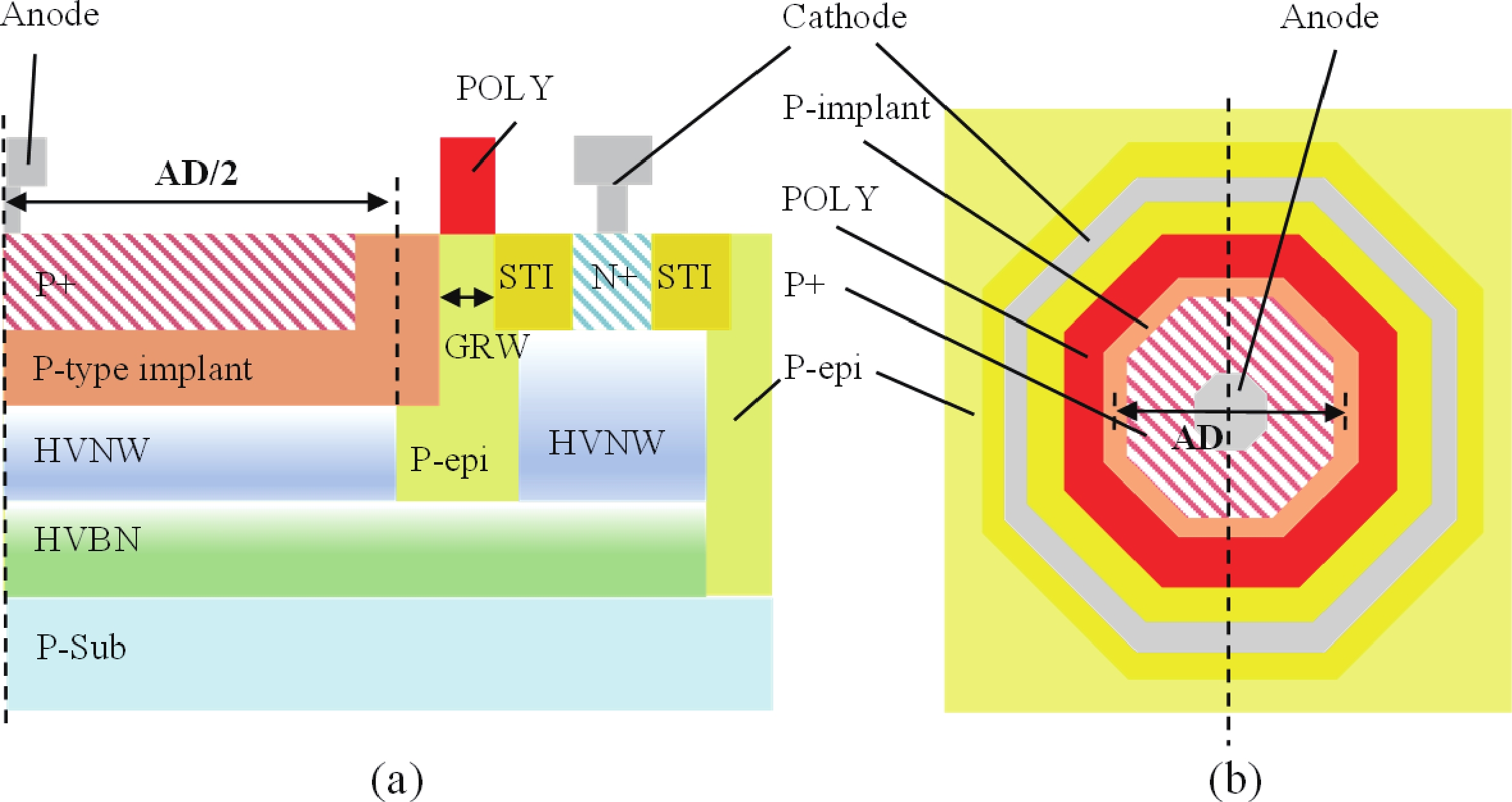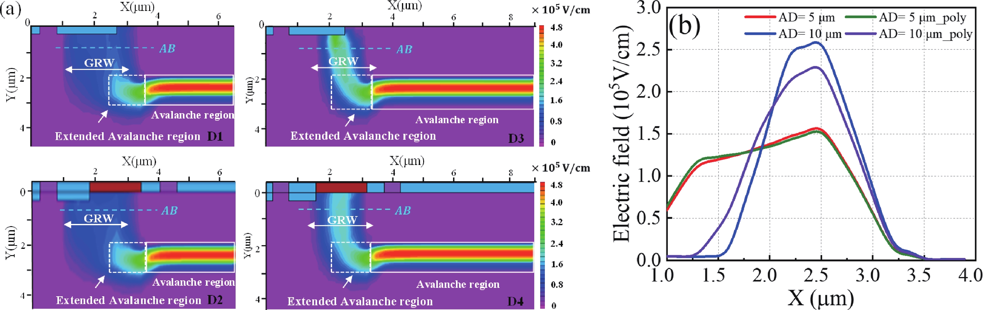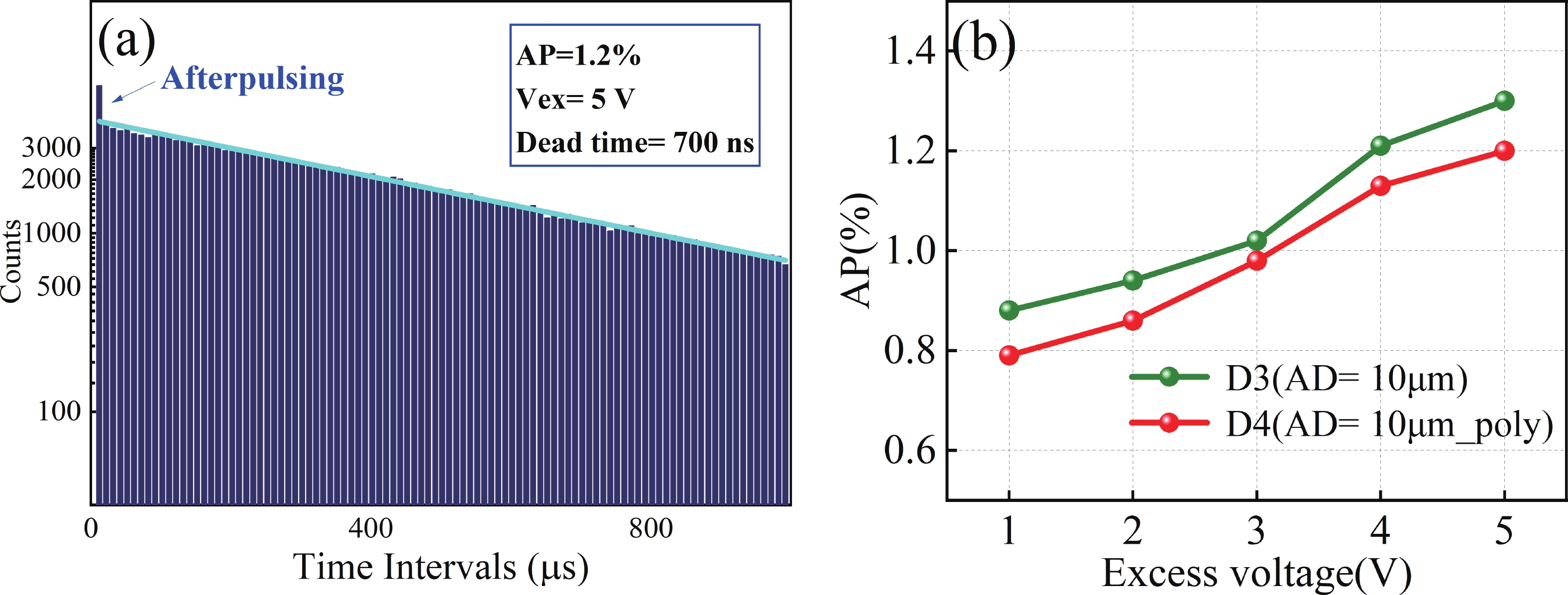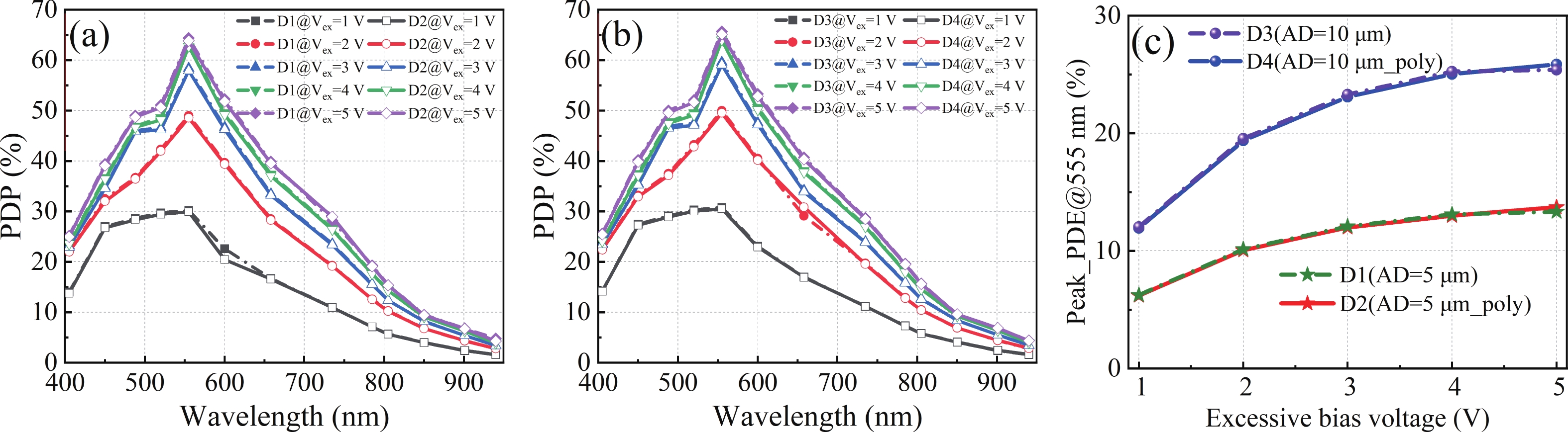 A high-sensitivity, low-noise single photon avalanche diode (SPAD) detector was presented based on a 180 nm BCD process. The proposed device utilizes a p-implant layer/high-voltage n-well (HVNW) junction to form a deep avalanche multiplication region for near-infrared (NIR) sensitivity enhancement. By optimizing the device size and electric field of the guard ring, the fill factor (FF) is significantly improved, further increasing photon detection efficiency (PDE). To solve the dark noise caused by the increasing active diameter, a field polysilicon gate structure connected to the p+ anode was investigated, effectively suppressing dark count noise by 76.6%. It is experimentally shown that when the active diameter increases from 5 to 10 μm, the FF is significantly improved from 20.7% to 39.1%, and thus the peak PDE also rises from 13.3% to 25.8%. At an excess bias voltage of 5 V, a NIR photon detection probability (PDP) of 6.8% at 905 nm, a dark count rate (DCR) of 2.12 cps/μm2, an afterpulsing probability (AP) of 1.2%, and a timing jitter of 216 ps are achieved, demonstrating excellent single photon detection performance.