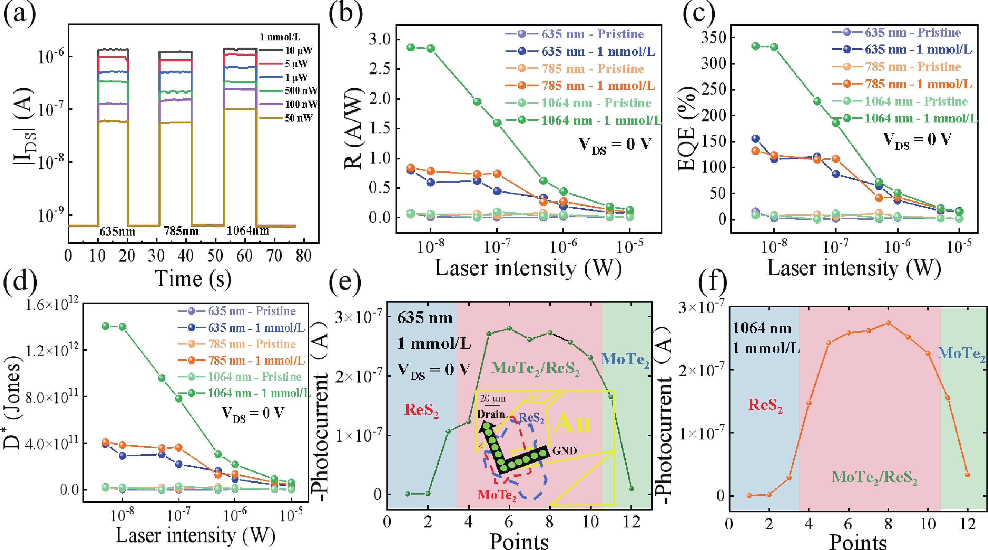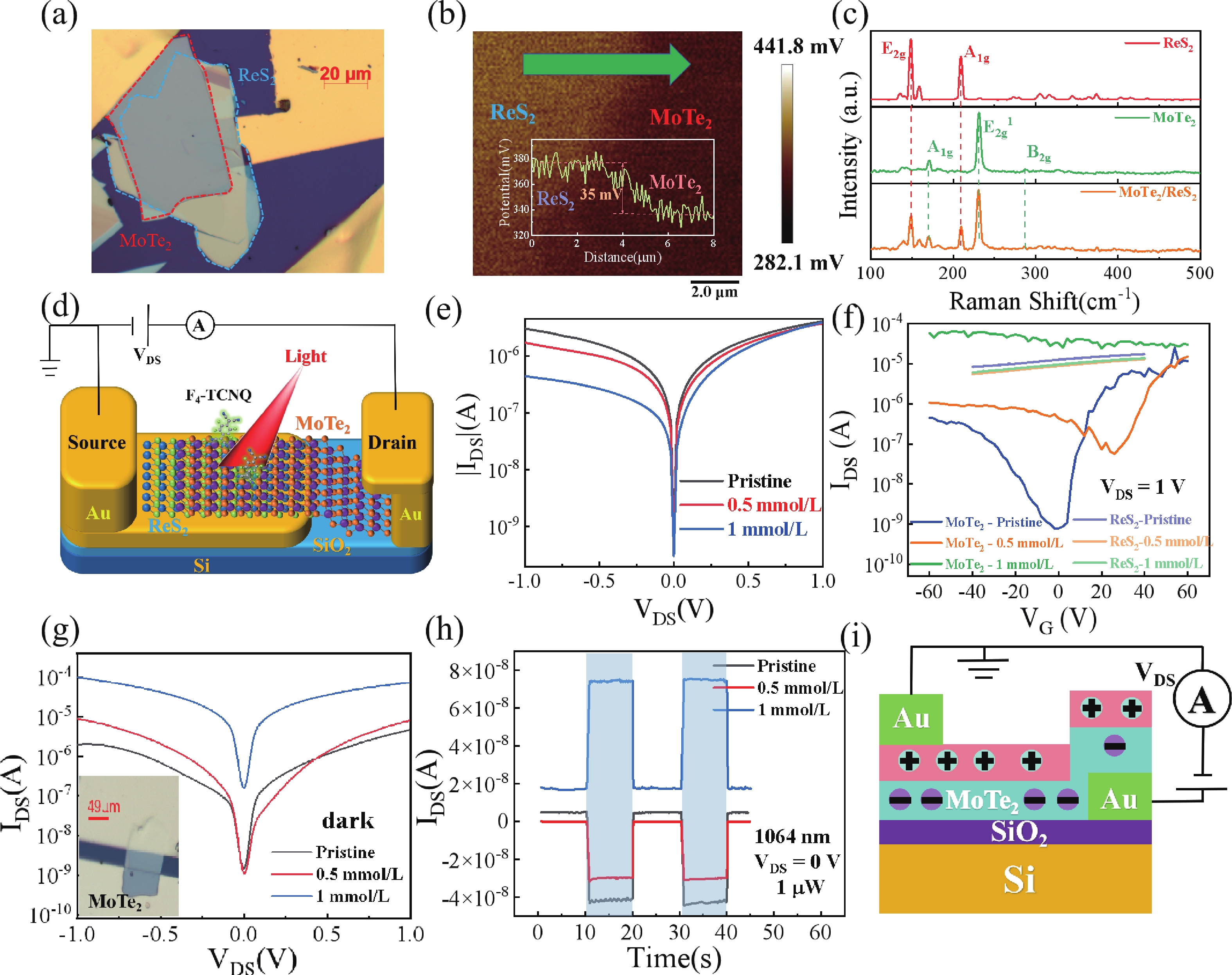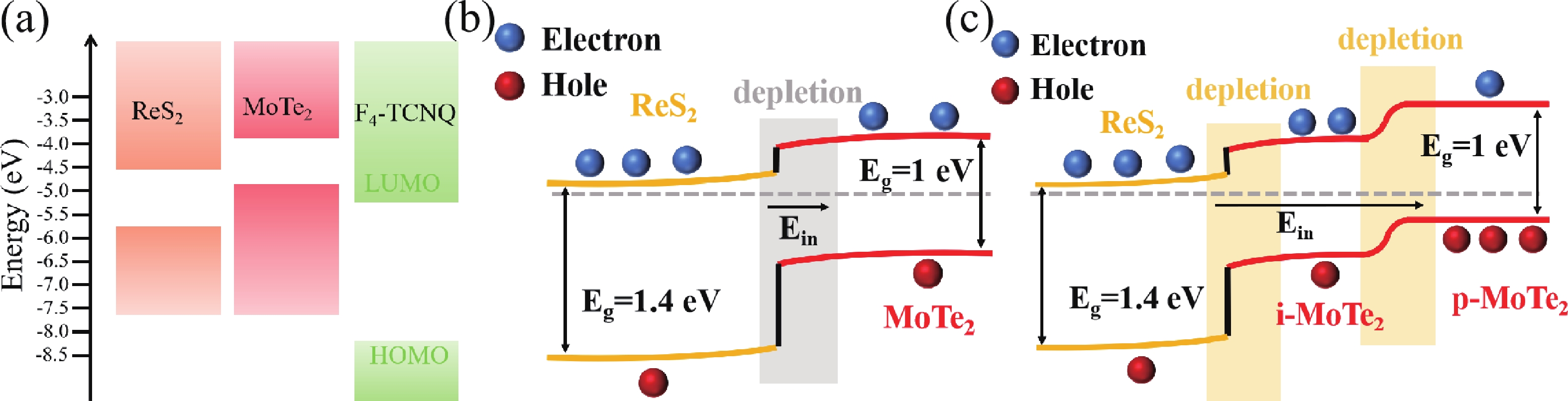 The development of optoelectronic technologies demands photodetectors with miniaturization, broadband operation, high sensitivity, and low power consumption. Although 2D van der Waals (vdW) heterostructures are promising candidates due to their built-in electric fields, ultrafast photocarrier separation, and tunable bandgaps, defect states limit their performance. Therefore, the modulation of the optoelectronic properties in such heterostructures is imperative. Surface charge transfer doping (SCTD) has emerged as a promising strategy for non-destructive modulation of electronic and optoelectronic characteristics in two-dimensional materials. In this work, we demonstrate the construction of high-performance p−i−n vertical heterojunction photodetectors through SCTD of MoTe2/ReS2 heterostructure using p-type F4-TCNQ. Systematic characterization reveals that the interfacial doping process effectively amplifies the built-in electric field, enhancing photogenerated carrier separation efficiency. Compared to the pristine heterojunction device, the doped photodetector exhibits remarkable visible to near-infrared (635−1064 nm) performance. Particularly under 1064 nm illumination at zero bias, the device achieves a responsivity of 2.86 A/W and specific detectivity of 1.41 × 1012 Jones. Notably, the external quantum efficiency reaches an exceptional value of 334% compared to the initial 11.5%, while maintaining ultrafast response characteristics with rise/fall times of 11.6/15.6 μs. This work provides new insights into interface engineering through molecular doping for developing high-performance vdW optoelectronic devices.