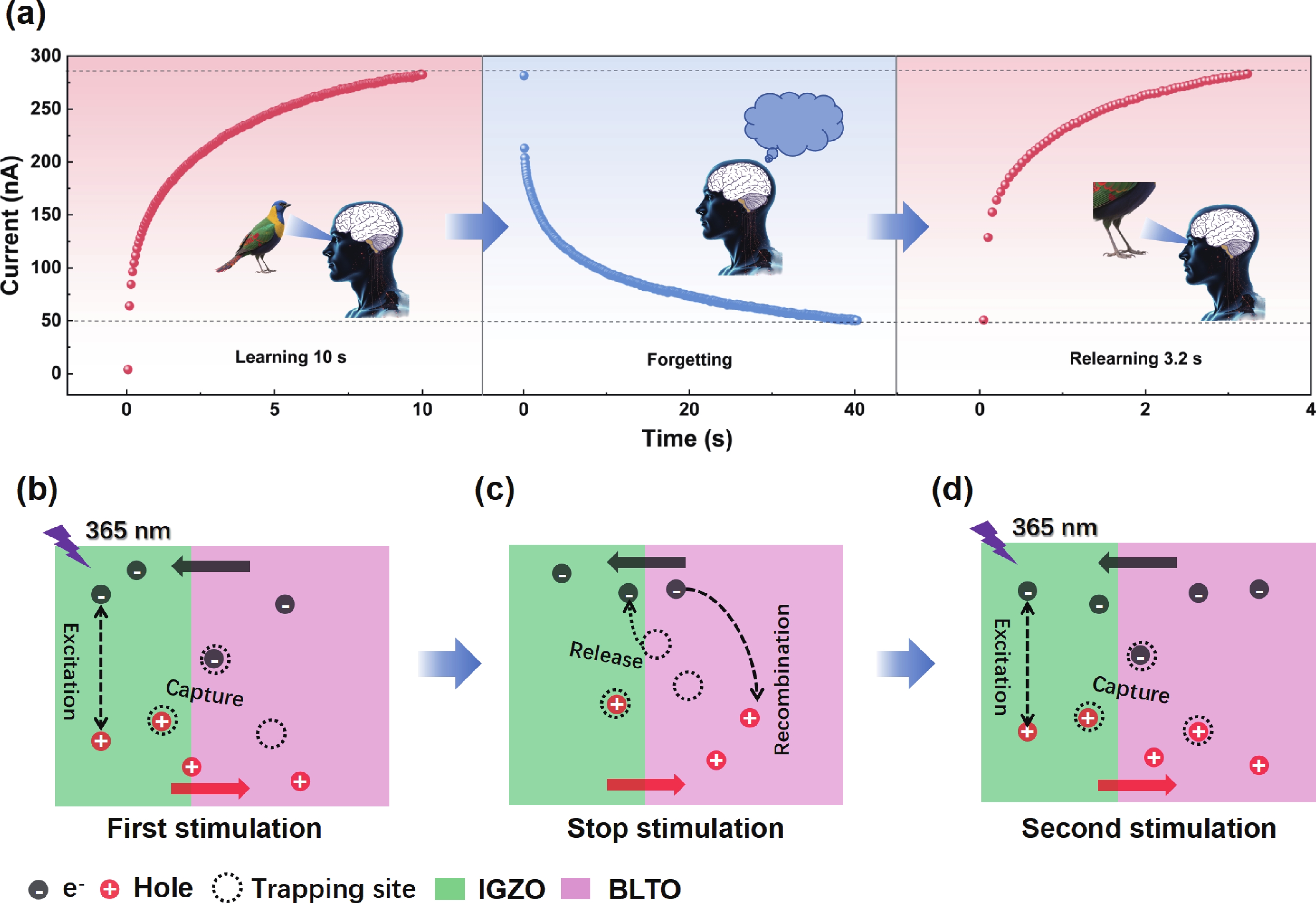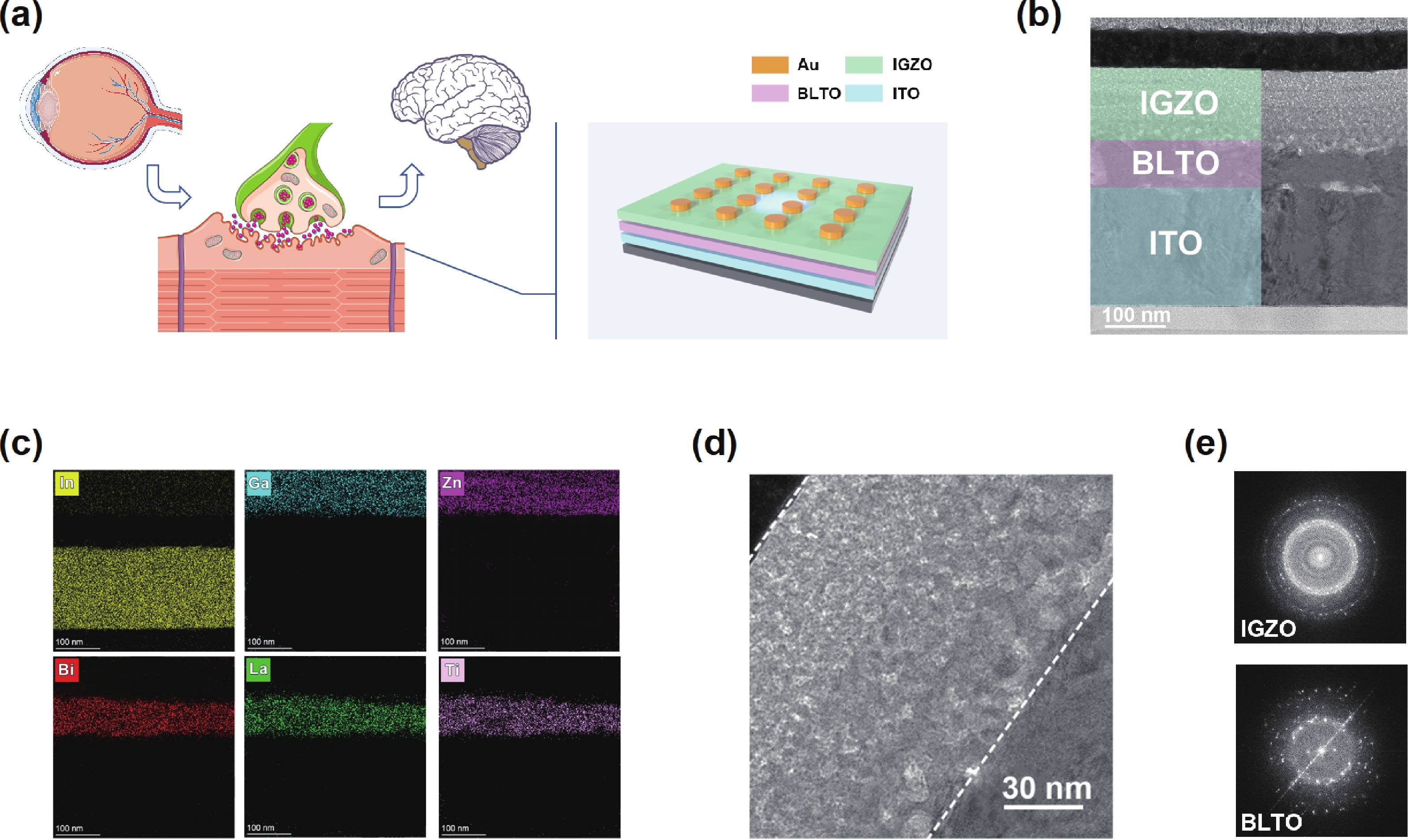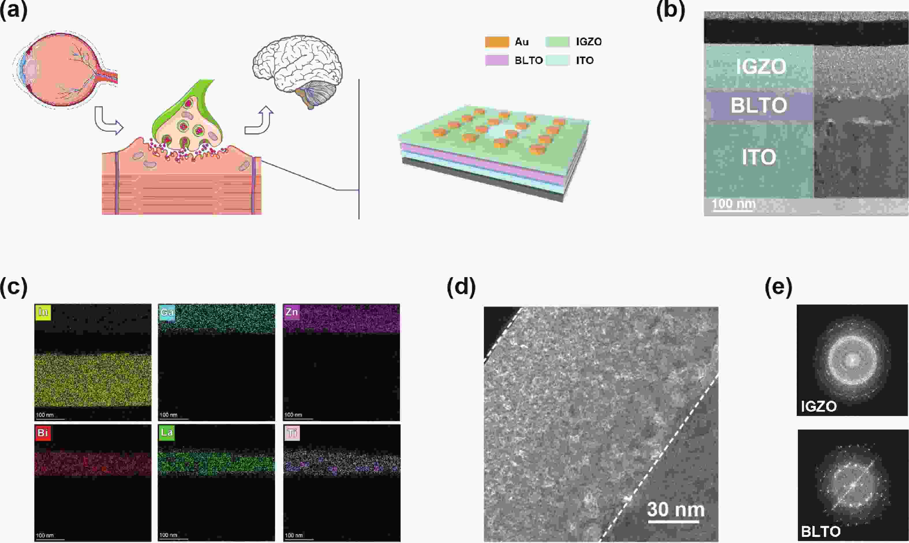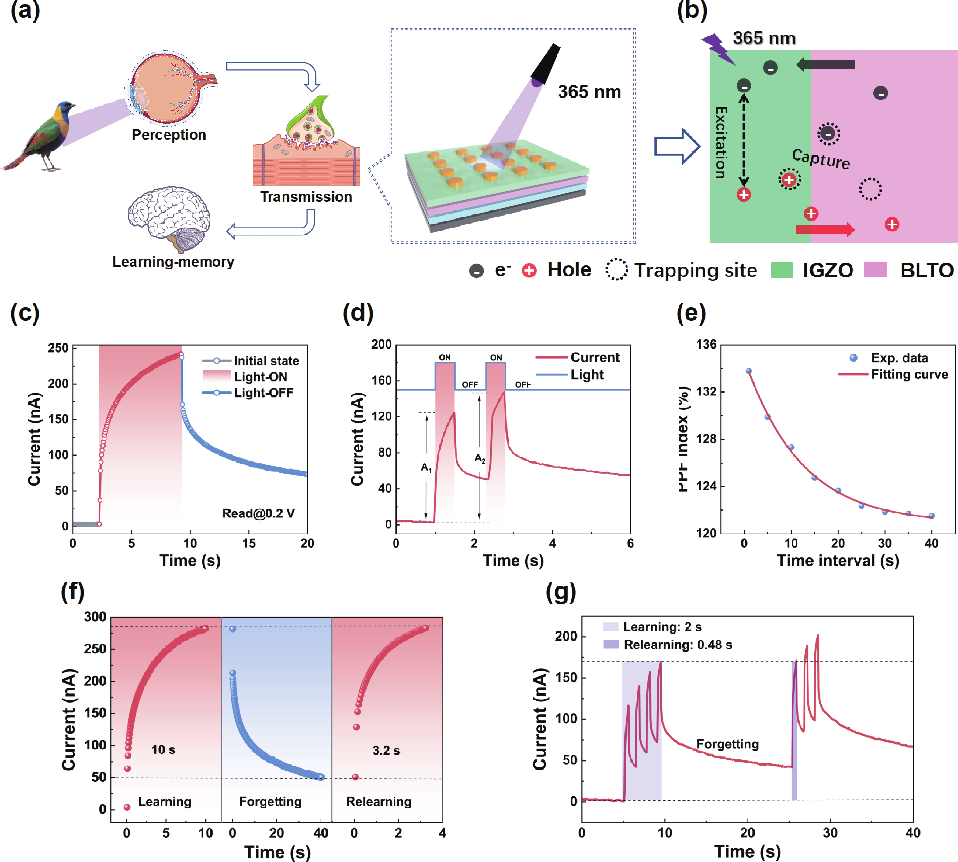 In recent years, optoelectronic synapses have garnered significant attention in the field of neuromorphic computing due to their integration of optical sensing and synaptic functions. In this work, we propose an optoelectronic synapse based on IGZO/Bi3.25La0.75Ti3O12 heterojunction. Under UV light stimulation, this device can simulate a range of synaptic behaviors, including paired-pulse facilitation, spike-intensity-dependent plasticity, spike-number-dependent plasticity, spike-width-dependent plasticity, and the transition from short-term memory to long-term memory. The majority of perceptible information for humans is acquired through the visual system. The 3 × 3 retinal morphology synapse arrays constructed based on plasticity behaviors not only integrates light perception and storage functions but also exhibits adaptive adjustment capabilities to address image blurring caused by object movement. At the same time, in CNN recognition training, the device successfully simulates the learning−relearning mechanism of the human brain. These findings highlight the device’s immense potential for applications in artificial vision systems.