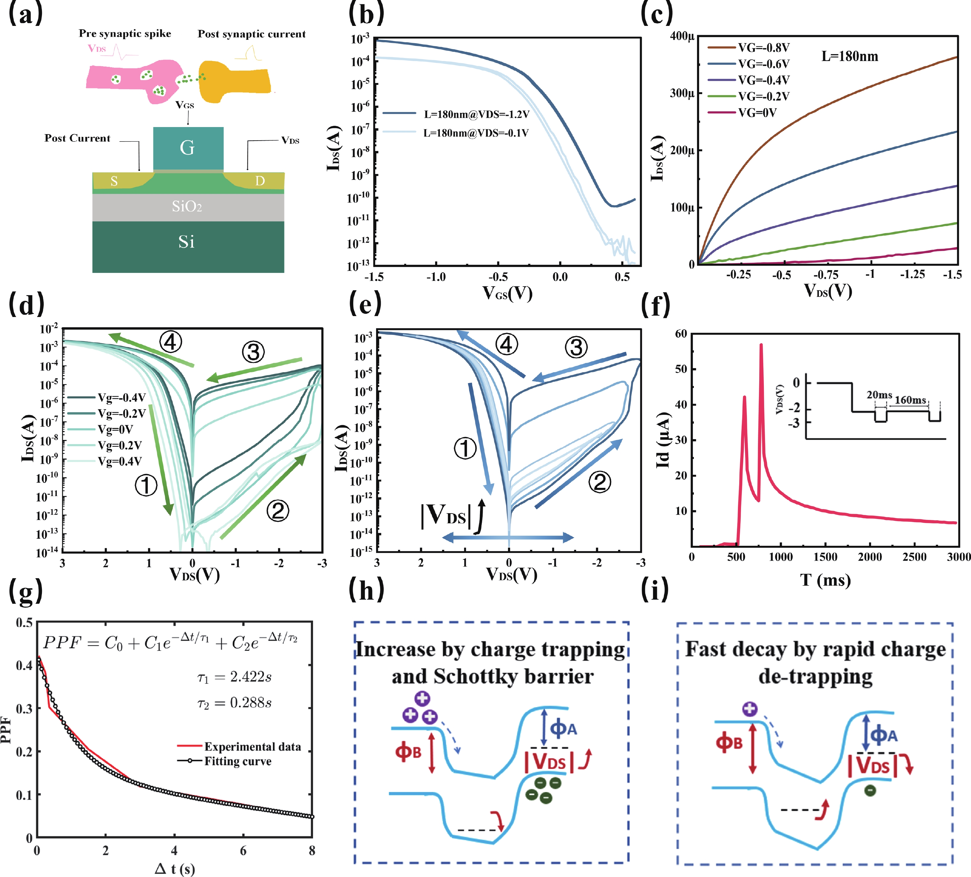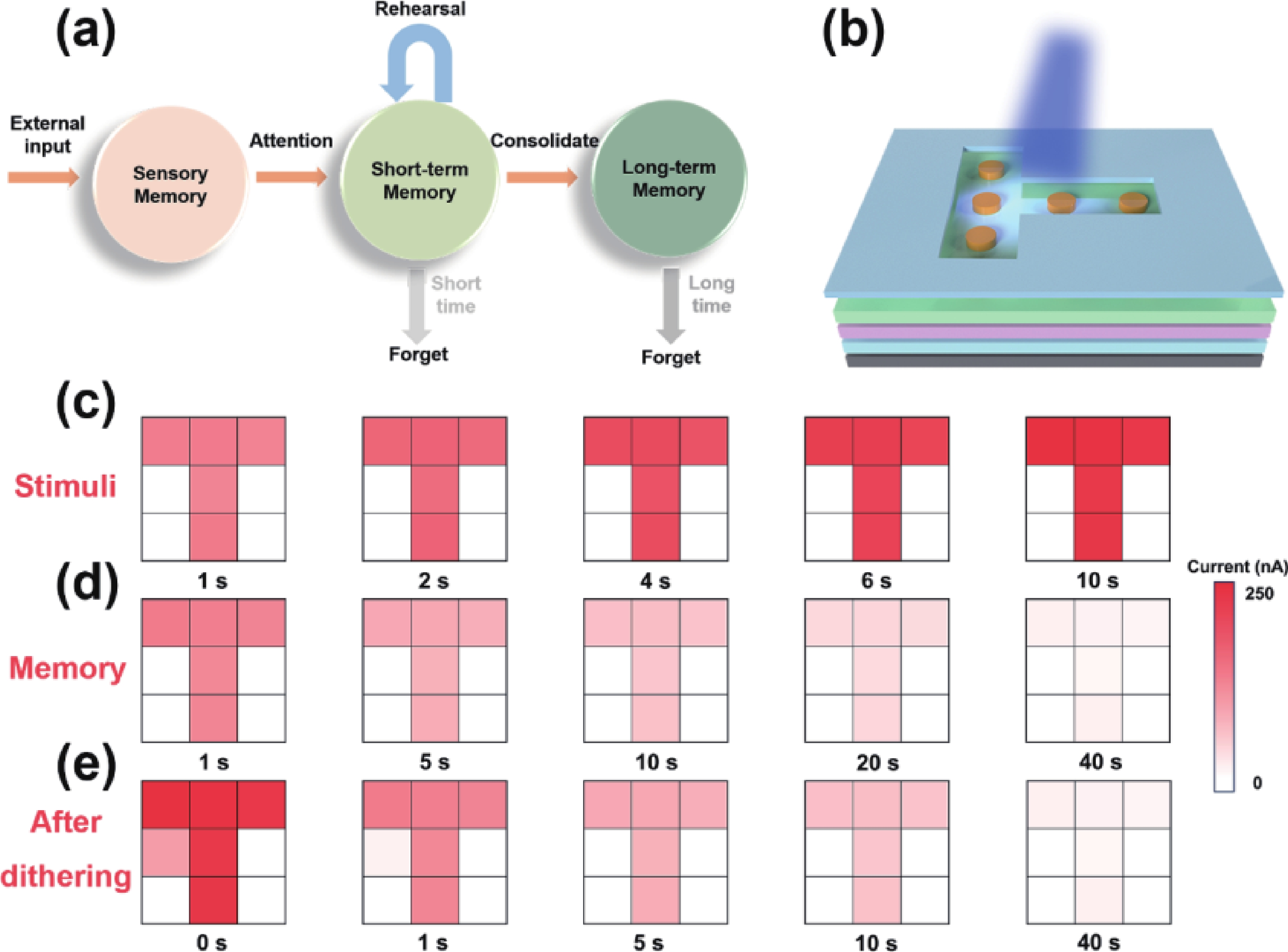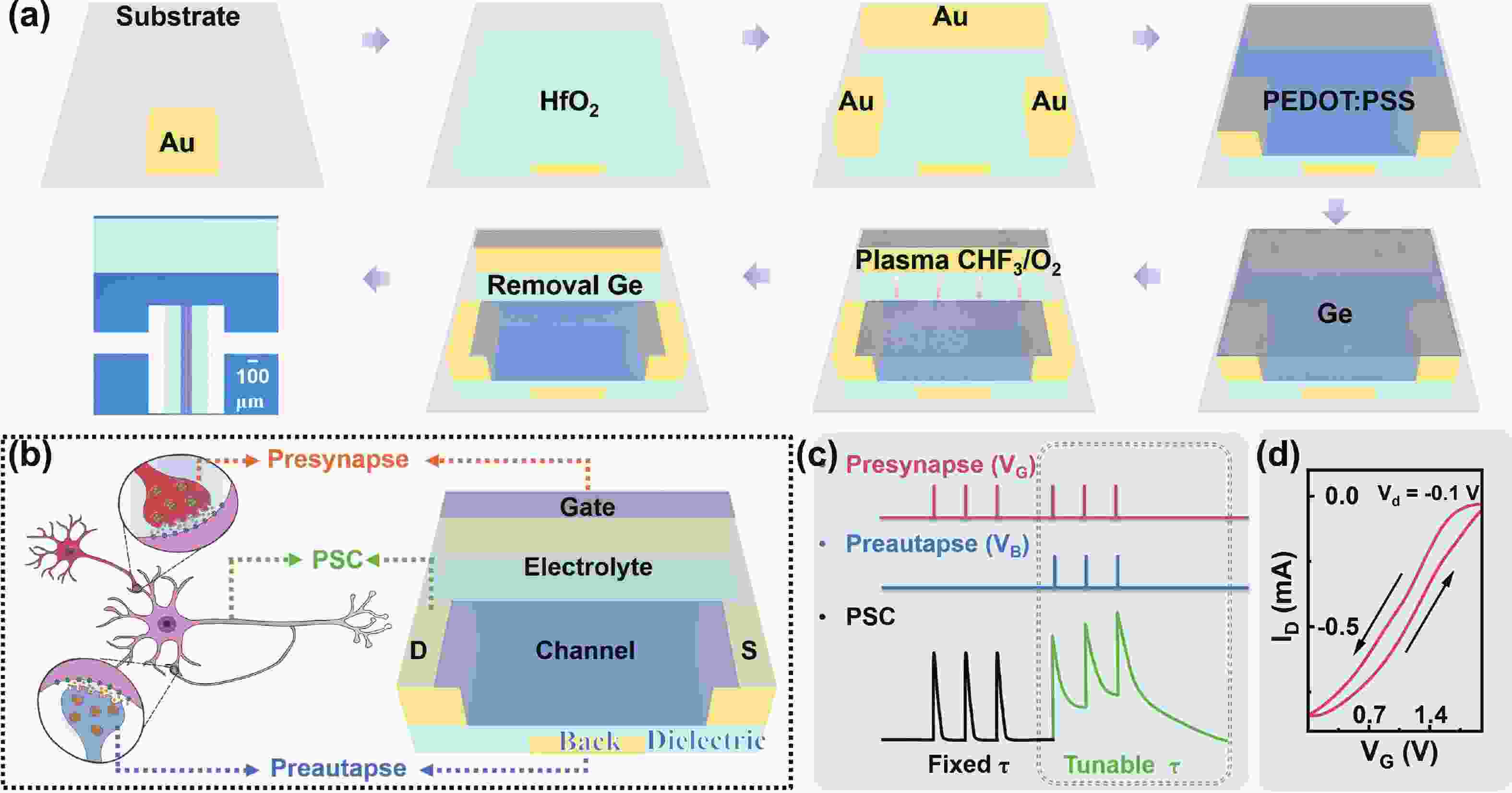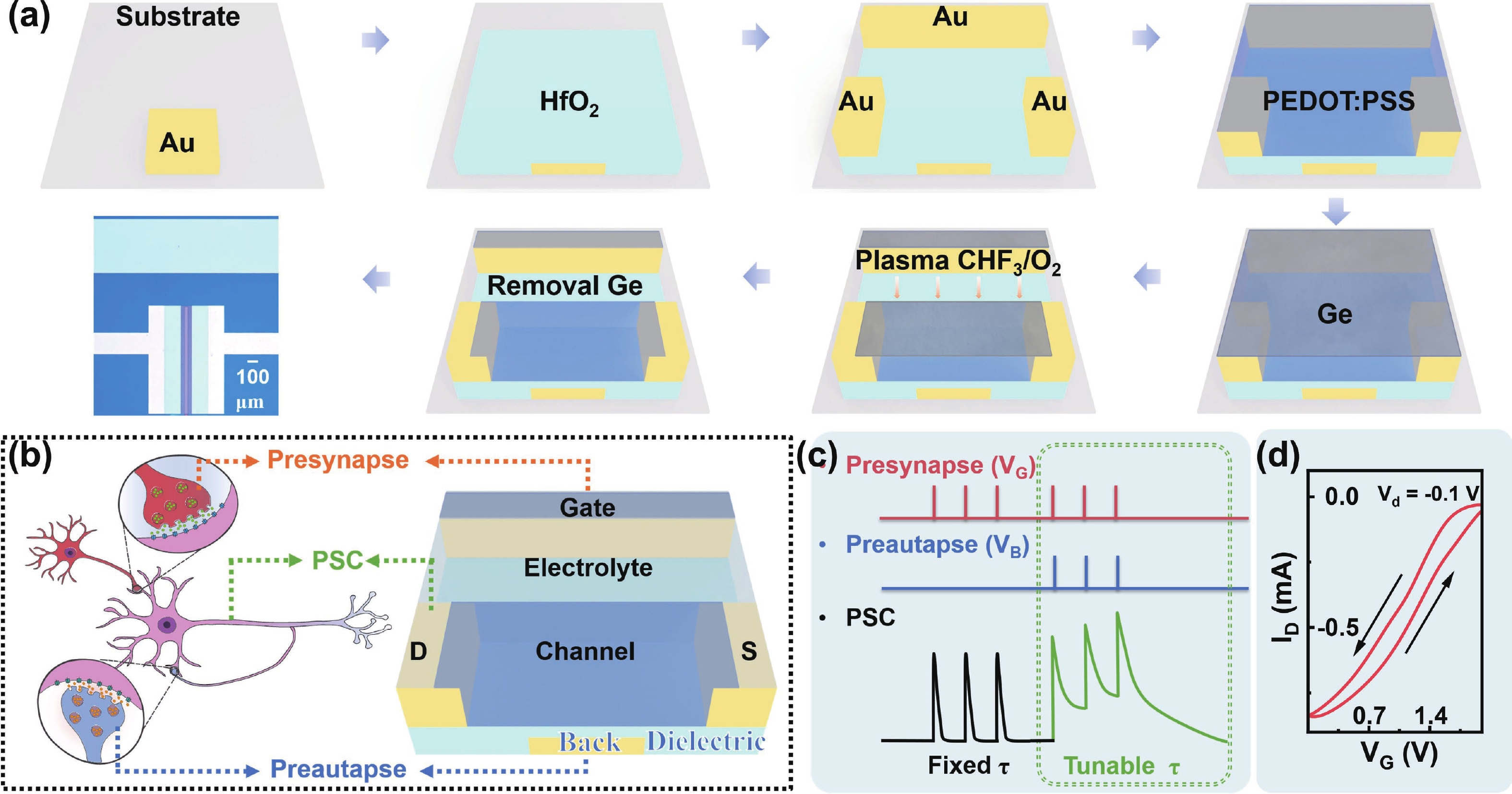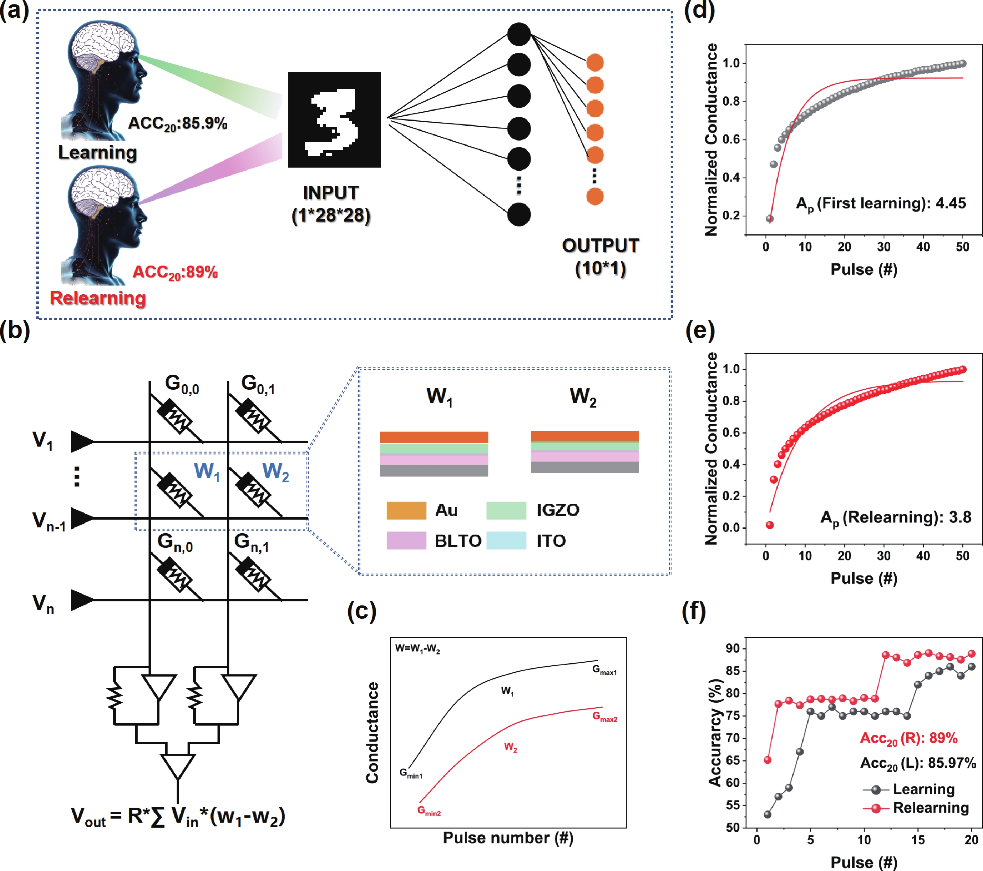 In recent years, optoelectronic synapses have garnered significant attention in the field of neuromorphic computing due to their integration of optical sensing and synaptic functions. In this work, we propose an optoelectronic synapse based on IGZO/Bi3.25La0.75Ti3O12 heterojunction. Under UV light stimulation, this device can simulate a range of synaptic behaviors, including paired-pulse facilitation, spike-intensity-dependent plasticity, spike-number-dependent plasticity, spike-width-dependent plasticity, and the transition from short-term memory to long-term memory. The majority of perceptible information for humans is acquired through the visual system. The 3 × 3 retinal morphology synapse arrays constructed based on plasticity behaviors not only integrates light perception and storage functions but also exhibits adaptive adjustment capabilities to address image blurring caused by object movement. At the same time, in CNN recognition training, the device successfully simulates the learning−relearning mechanism of the human brain. These findings highlight the device’s immense potential for applications in artificial vision systems.