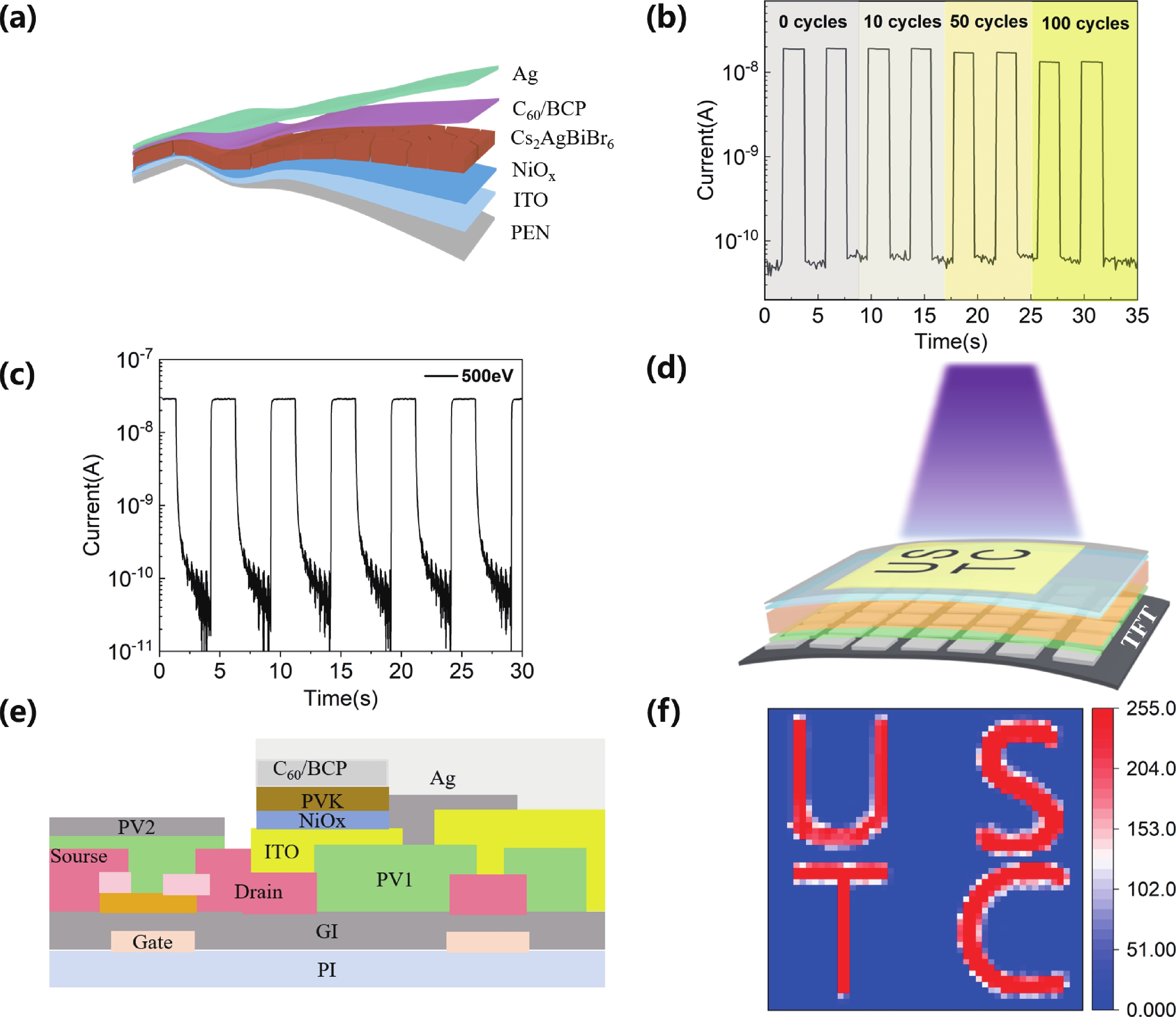 Soft X-ray detectors play a vital role in materials science, high-energy physics and medical imaging. Cs2AgBiBr6, a lead-free double perovskite, has gained attention for its excellent optoelectronic properties, stability, and nontoxicity. However, its fast crystallization and requirement for high-temperature annealing (>250 °C) often lead to inferior film quality, limiting its application in flexible devices. This study introduces an alloying strategy that significantly improves the quality of Cs2AgBiBr6 thin films annealed at a reduced temperature of 150 °C. Devices based on the alloyed thin films exhibit an ultra-low dark current of 0.32 nA∙cm−2 and a quantum efficiency of 725%. Furthermore, the first successful integration of Cs2AgBiBr6 with a thin-film transistor backplane demonstrates its superior imaging performance, indicating that Cs2AgBiBr6 is a promising material for next-generation soft X-ray sensors.
