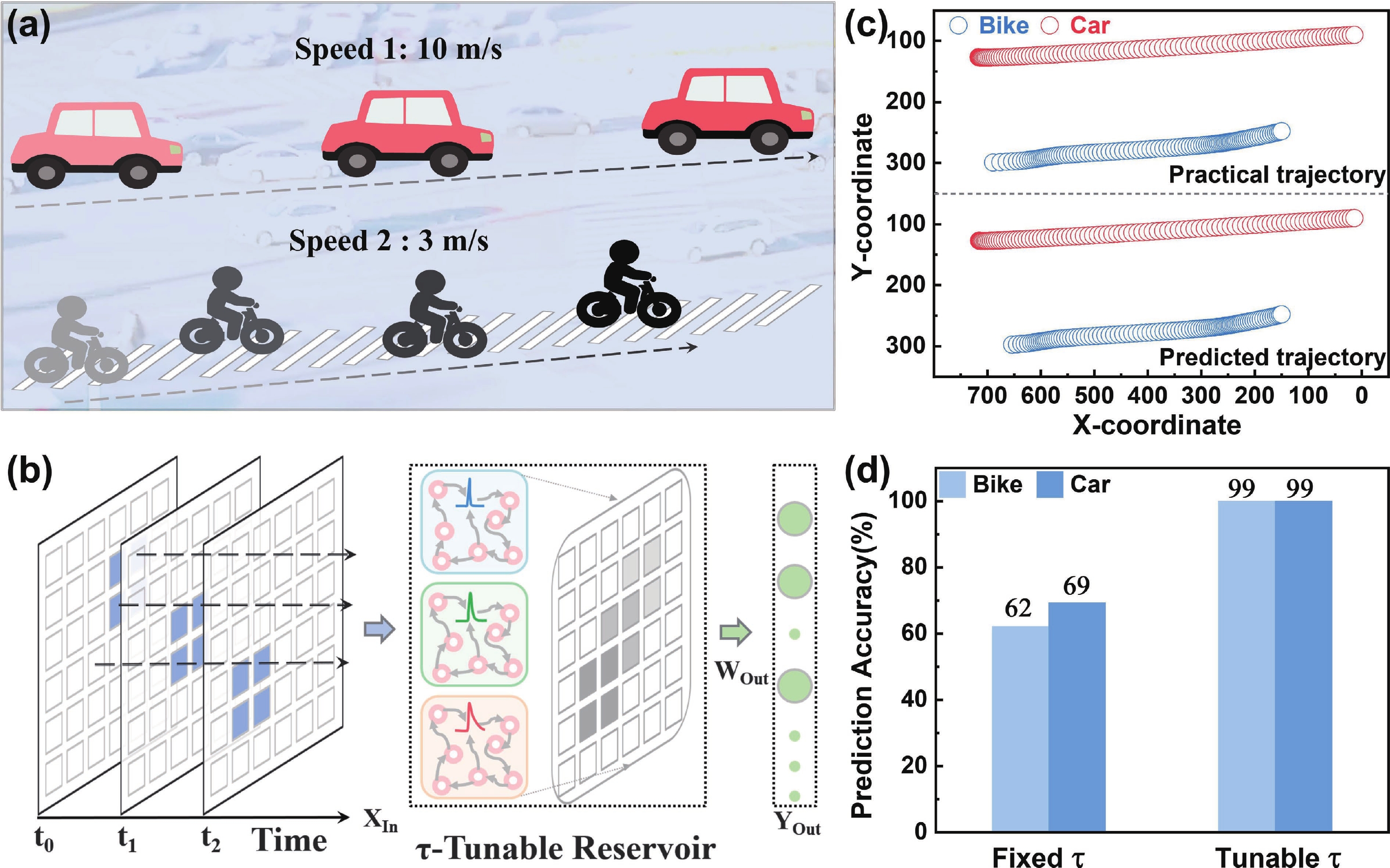 Organic electrochemical transistor (OECT) devices demonstrate great promising potential for reservoir computing (RC) systems, but their lack of tunable dynamic characteristics limits their application in multi-temporal scale tasks. In this study, we report an OECT-based neuromorphic device with tunable relaxation time (τ) by introducing an additional vertical back-gate electrode into a planar structure. The dual-gate design enables τ reconfiguration from 93 to 541 ms. The tunable relaxation behaviors can be attributed to the combined effects of planar-gate induced electrochemical doping and back-gate-induced electrostatic coupling, as verified by electrochemical impedance spectroscopy analysis. Furthermore, we used the τ-tunable OECT devices as physical reservoirs in the RC system for intelligent driving trajectory prediction, achieving a significant improvement in prediction accuracy from below 69% to 99%. The results demonstrate that the τ-tunable OECT shows a promising candidate for multi-temporal scale neuromorphic computing applications.