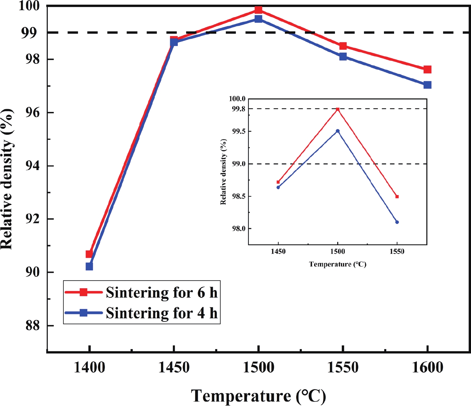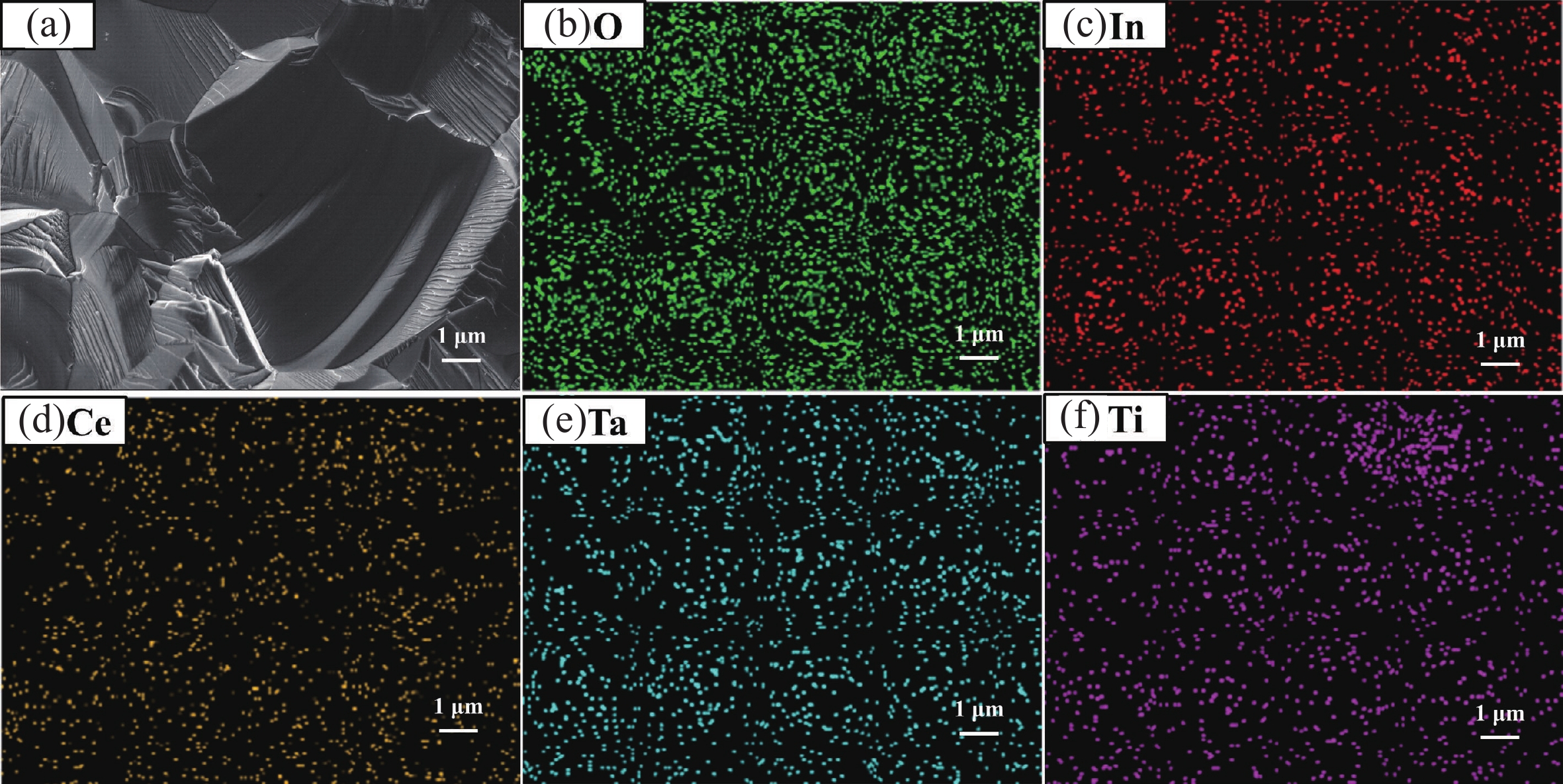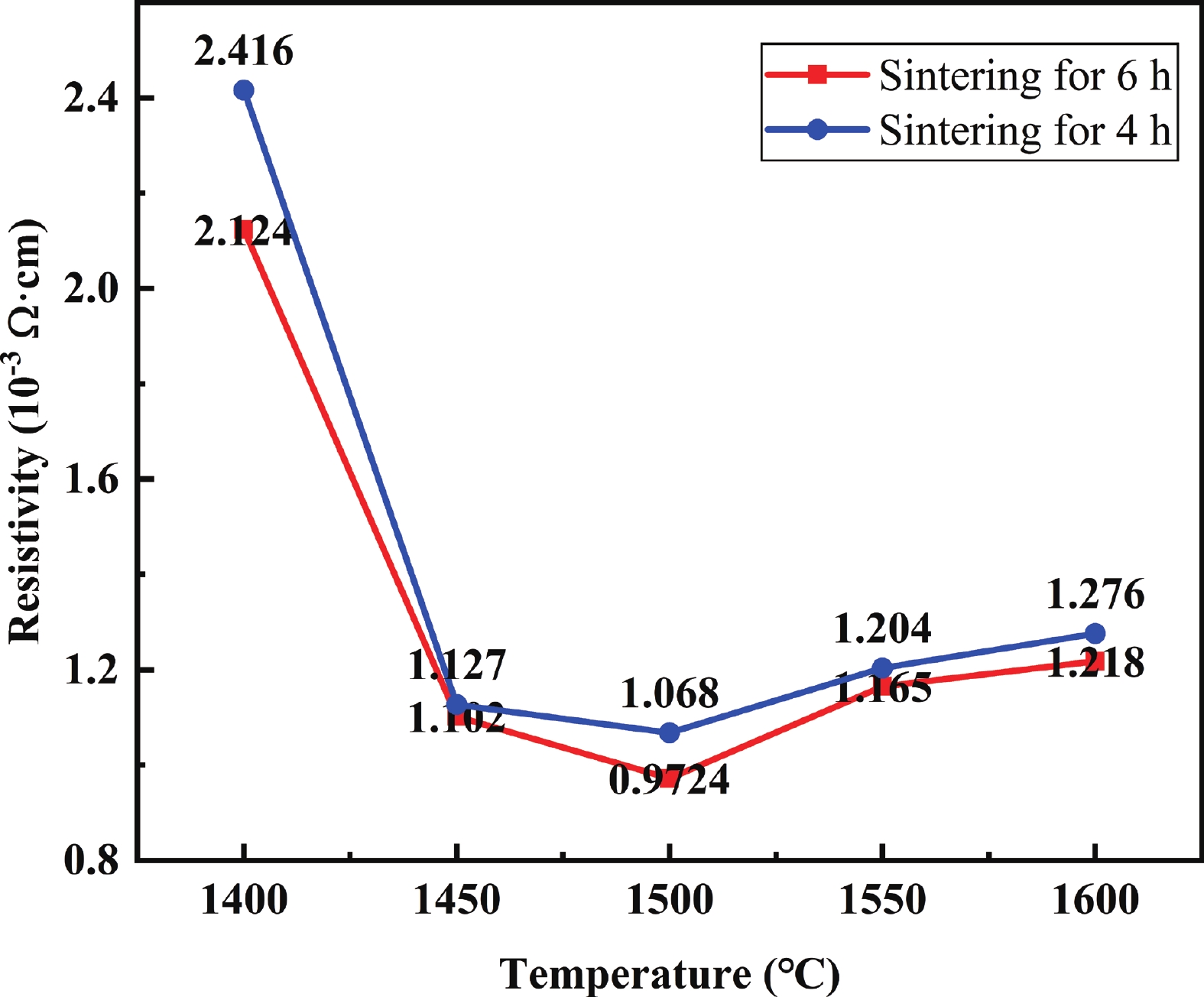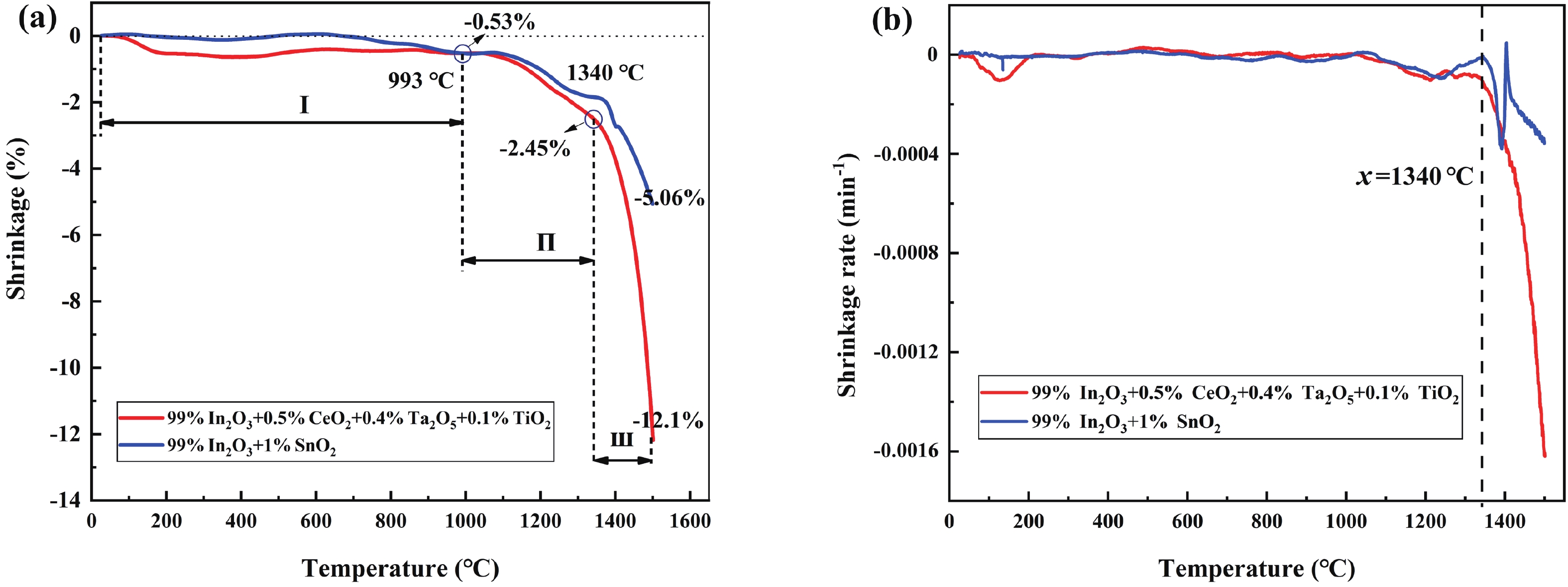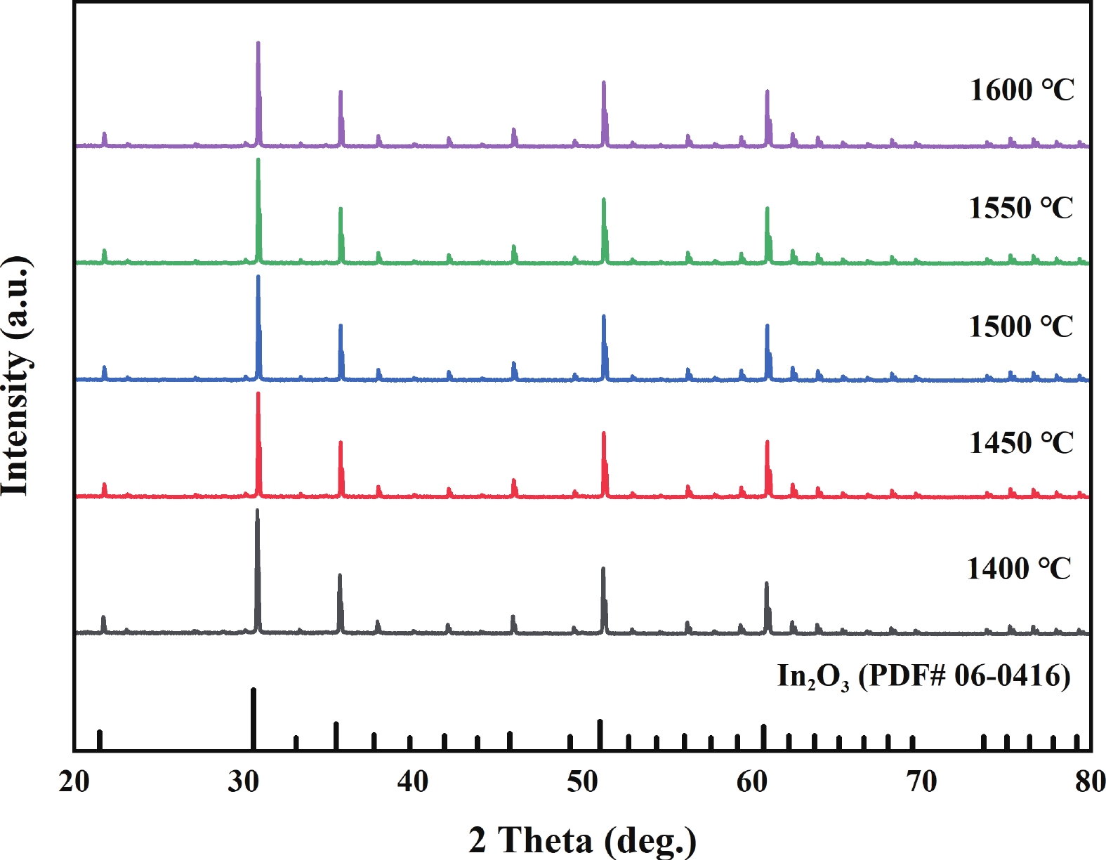 To address the escalating demand for high-mobility transparent and conductive oxide (TCO) films in heterojunction solar cells, multiple components doped In2O3 targets were proposed. The In2O3 targets incorporating 1 wt.% CeO2, Ta2O5, and TiO2 were sintered under different sintering temperatures and times. All the targets show the cubic bixbyite phase of In2O3. The microstructure illustrates densely packed fine grains and uniform elemental distribution. Notably, increasing the sintering temperature and holding time contributes to effective pore elimination within the targets. A relative density of greater than 99.5% is obtained for the targets sintered at 1500 °C for 4 and 6 h, and the corresponding optimum resistivity decreases from 1.068 × 10³ to 9.73 × 10−4 Ω·cm. These results provide the experimental basis of fabricating In2O3-based targets for depositing high mobility TCO films by magnetron sputtering.