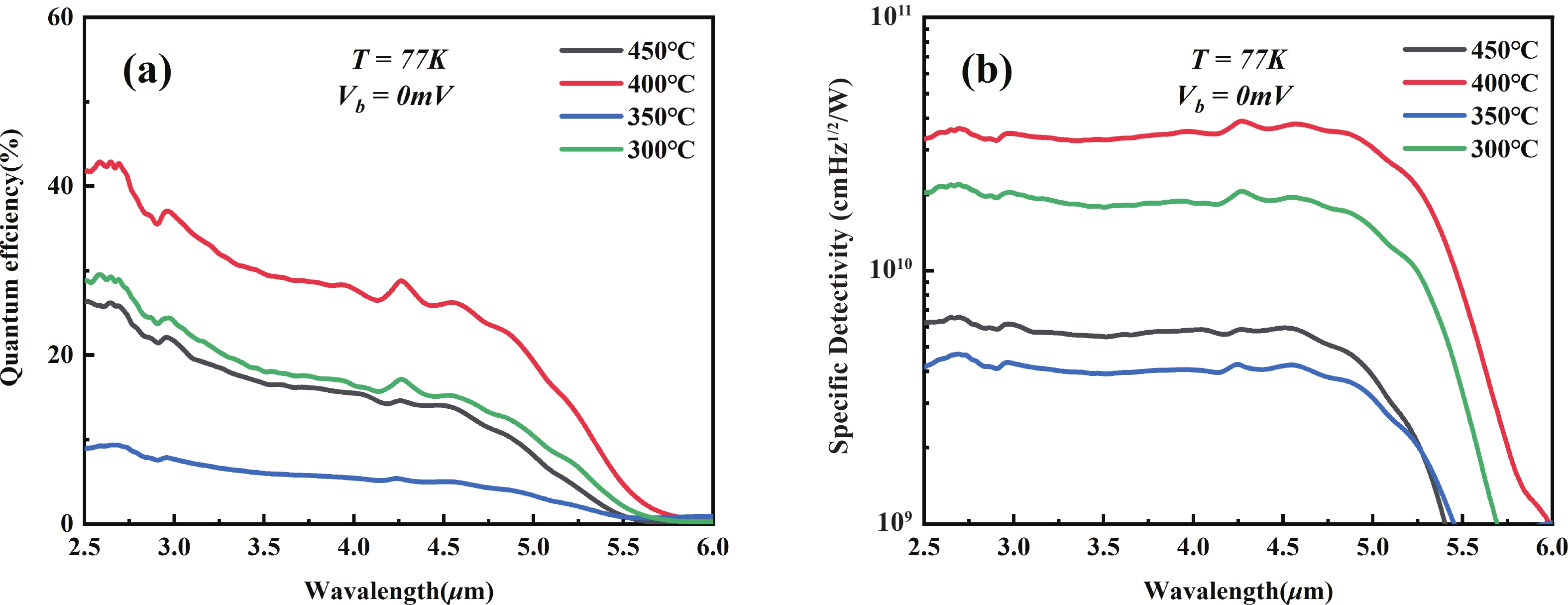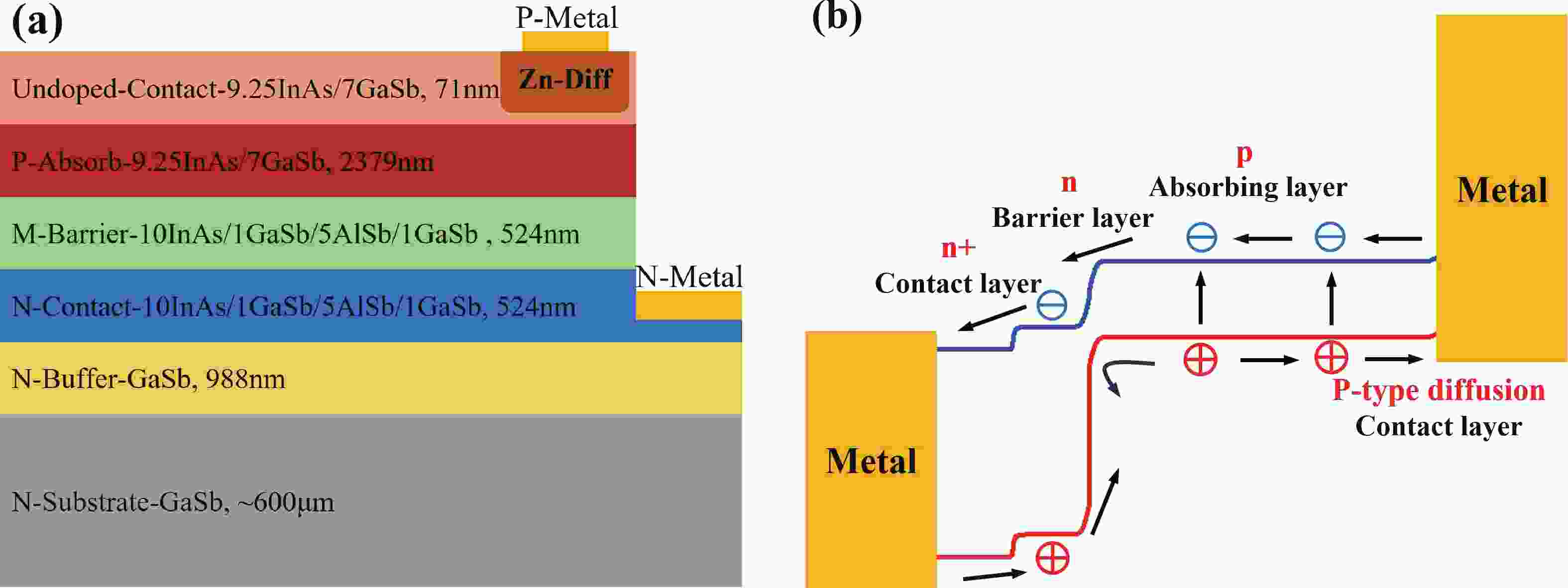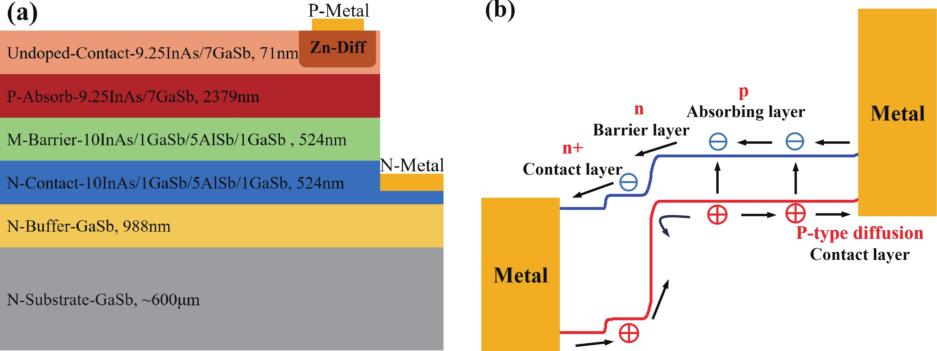 In this paper, a planar junction mid-wavelength infrared (MWIR) photodetector based on an InAs/GaSb type-Ⅱ superlattices (T2SLs) is reported. The Intrinsic-πMN superlattices was grown by the molecular beam epitaxy (MBE), followed with a ZnS layer grown by the chemical vapor deposition (CVD). The p-type contact layer was constructed by thermal diffusion in the undoped superlattices. The Zinc atom was successfully realised into the superlattice and a PπMN T2SL structure was constructed. Furthermore, the effects of different diffusion temperatures on the dark current performance of the devices were researched. The 50% cut-off wavelength of the photodetector is 5.26 μm at 77 K with 0 V bias. The minimum dark current density is 8.67 × 10−5 A/cm2 and the maximum quantum efficiency of 42.5%, and the maximum detectivity reaches 3.90 × 1010 cm·Hz1/2/W at 77 K. The 640 × 512 focal plane arrays (FPA) based on the planner junction were fabricated afterwards. The FPA achieves a noise equivalent temperature difference (NETD) of 539 mK.