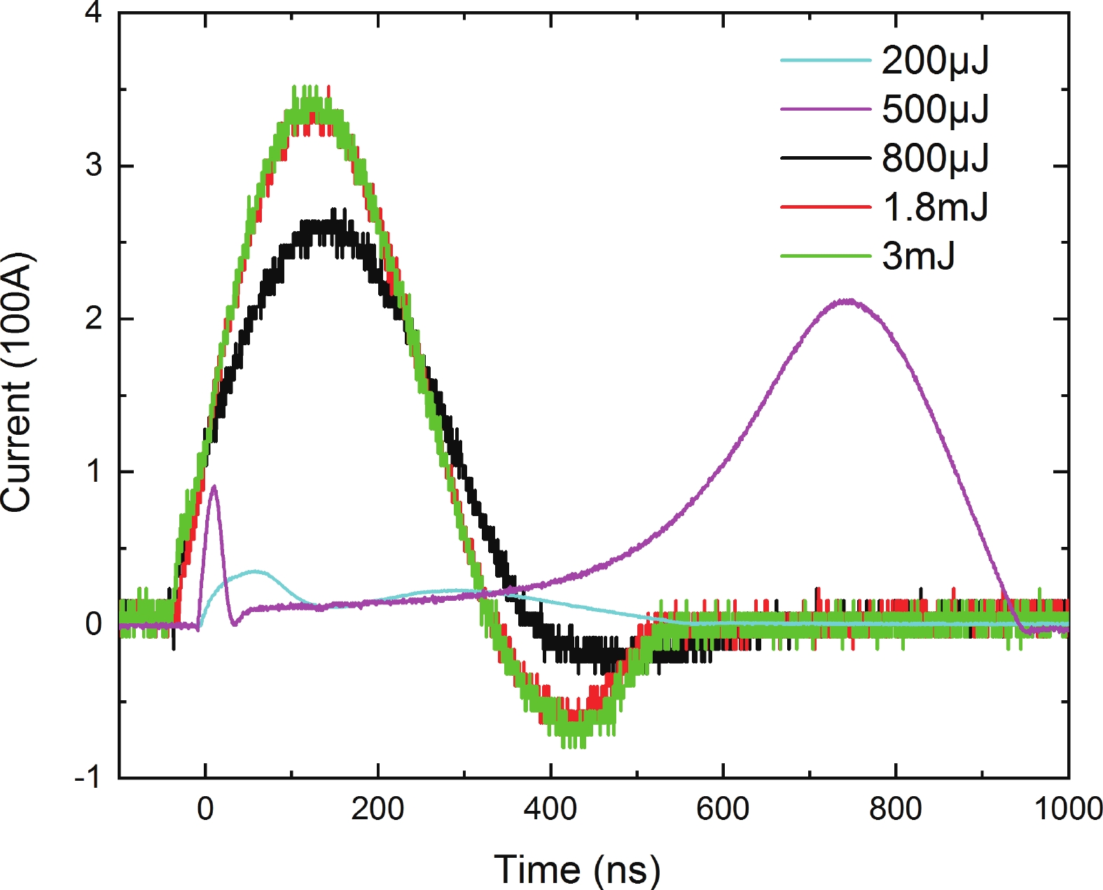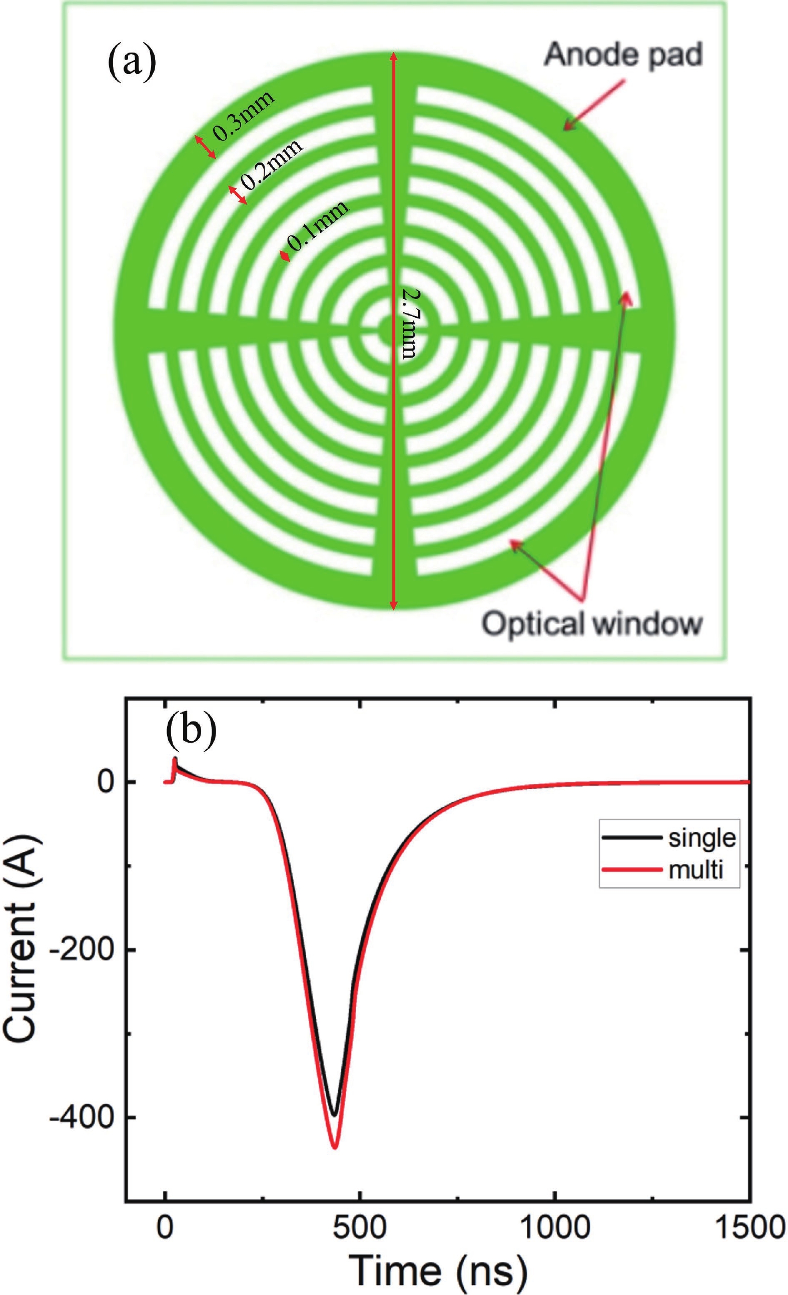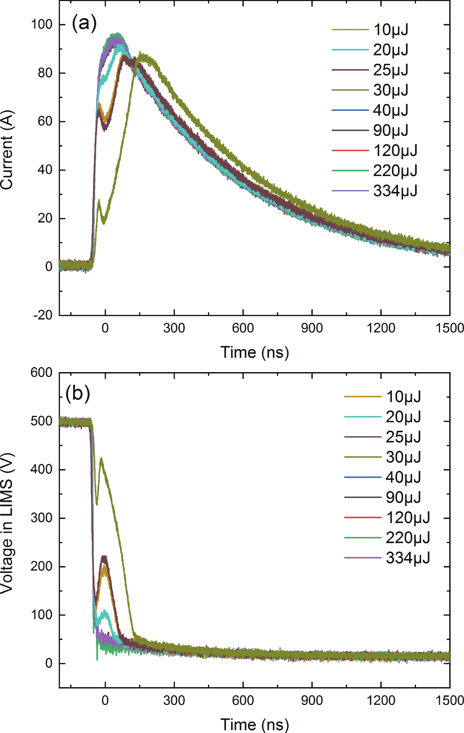 To optimize turn on velocity of the SiC LIMS, we proposed a new structure for the LIMS that incorporates an optimized n+ layer and a multi-light triggered electrode design for the anode. The chip size is 5.5 mm × 5.5 mm in dimension. The experiment results indicate that the saturation laser energy required to trigger the prepared SiC LIMS has been decreased from 1.8 mJ to 40 μJ, with the forward blocking voltage of the prepared SiC LIMSs capable of withstanding over 7000 V. The leakage current is about 0.3 μA at room temperature, and the output current density achieves 4.25 kA/cm2 (with di/dt larger than 20 kA/μs).
