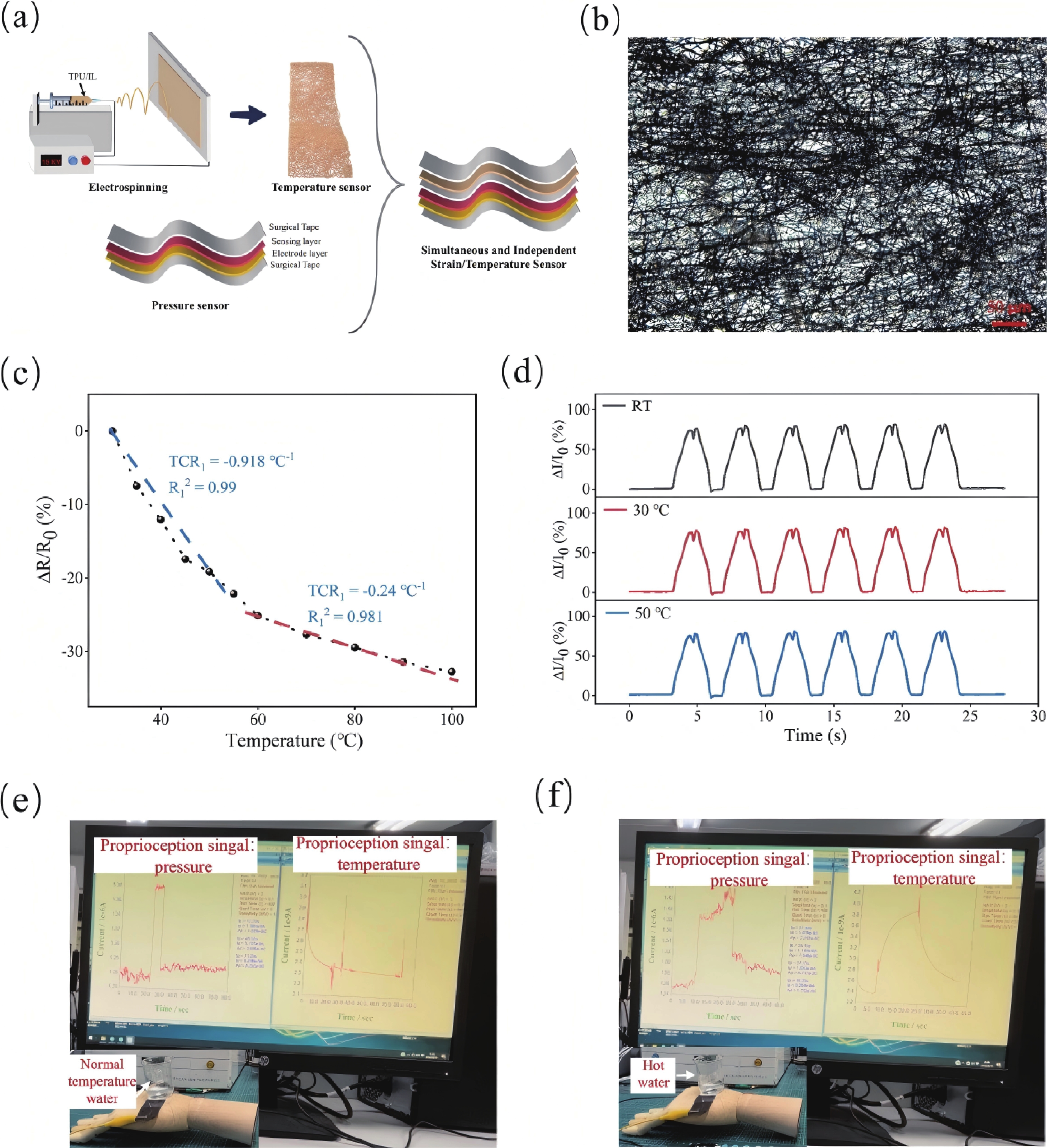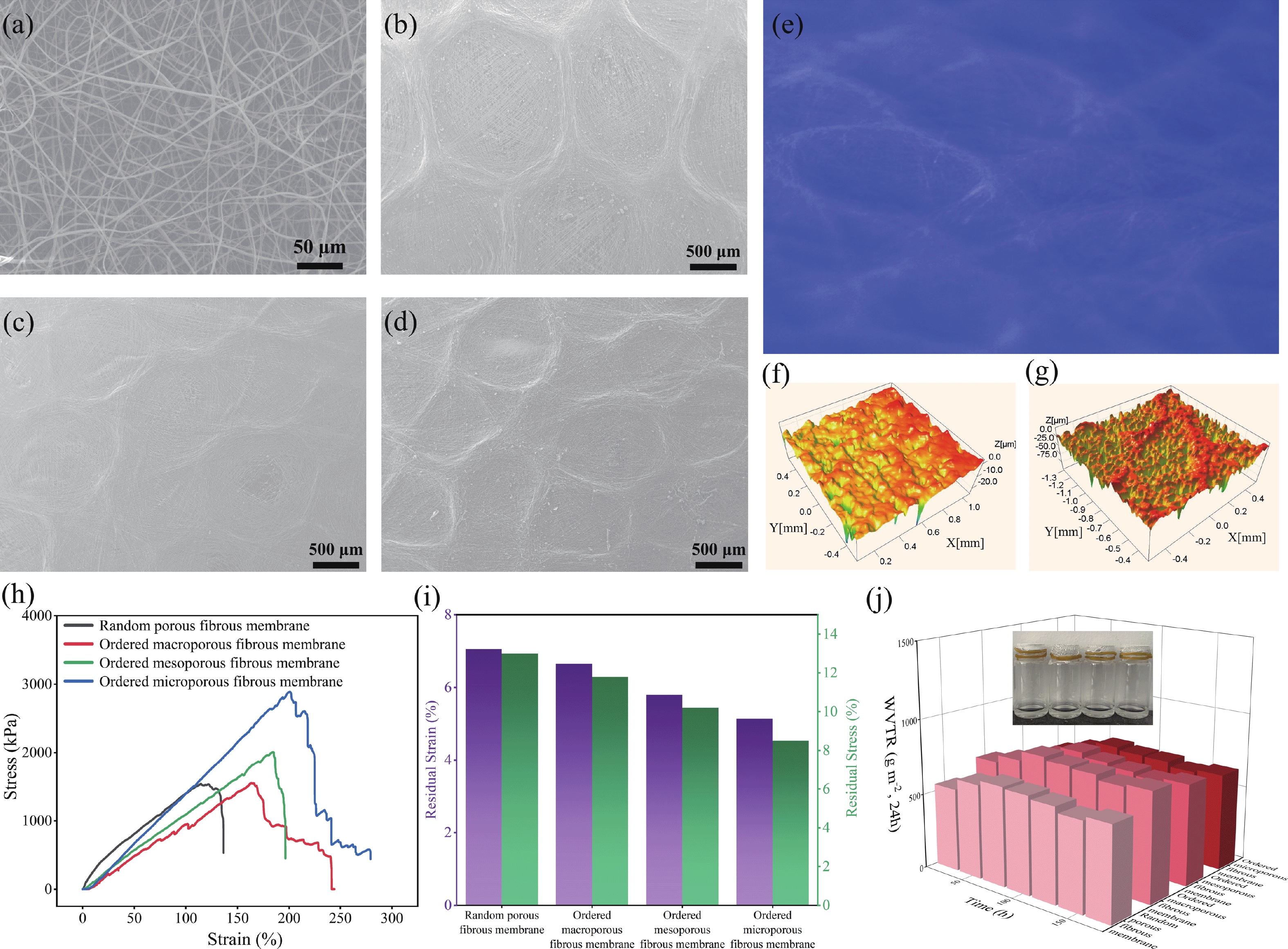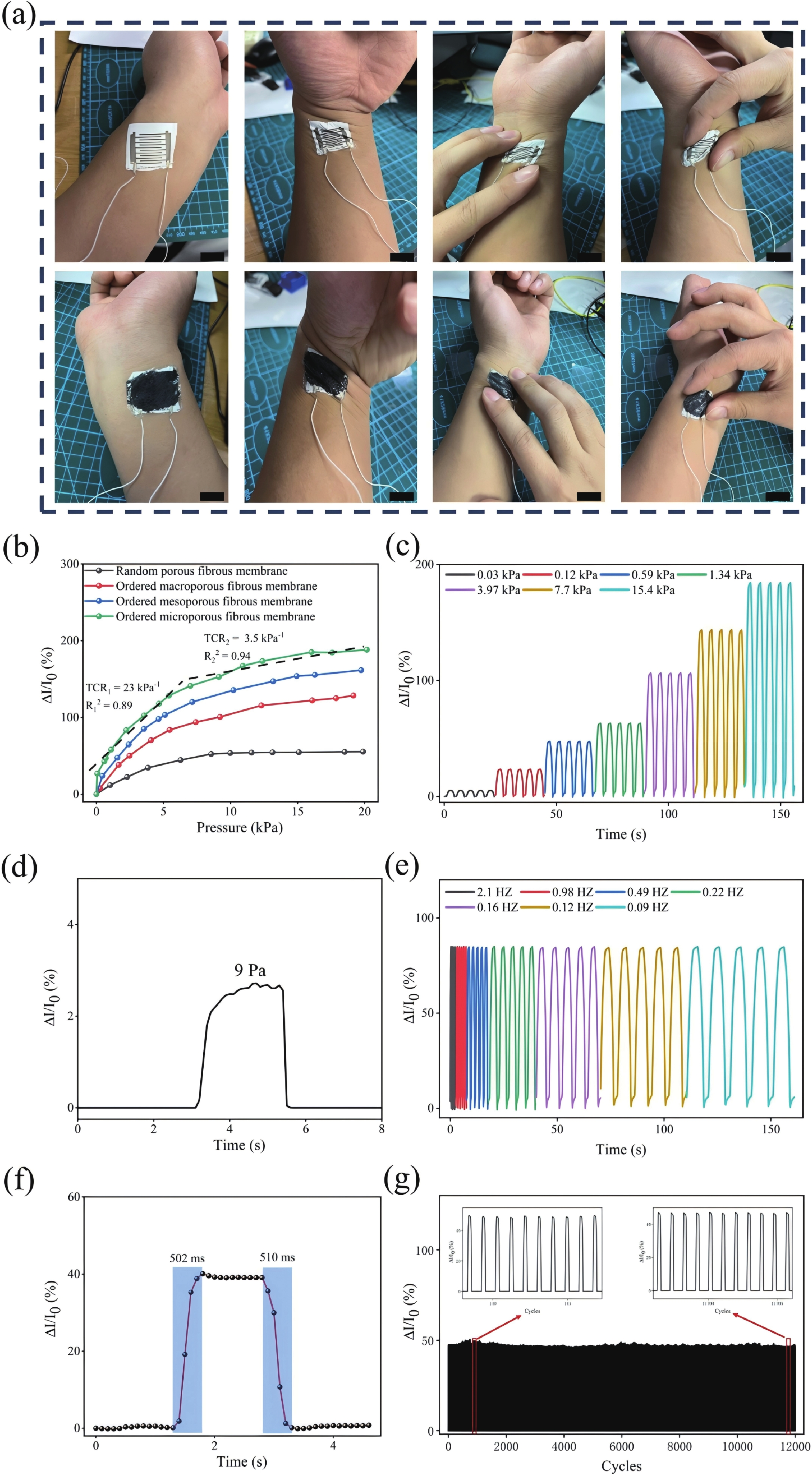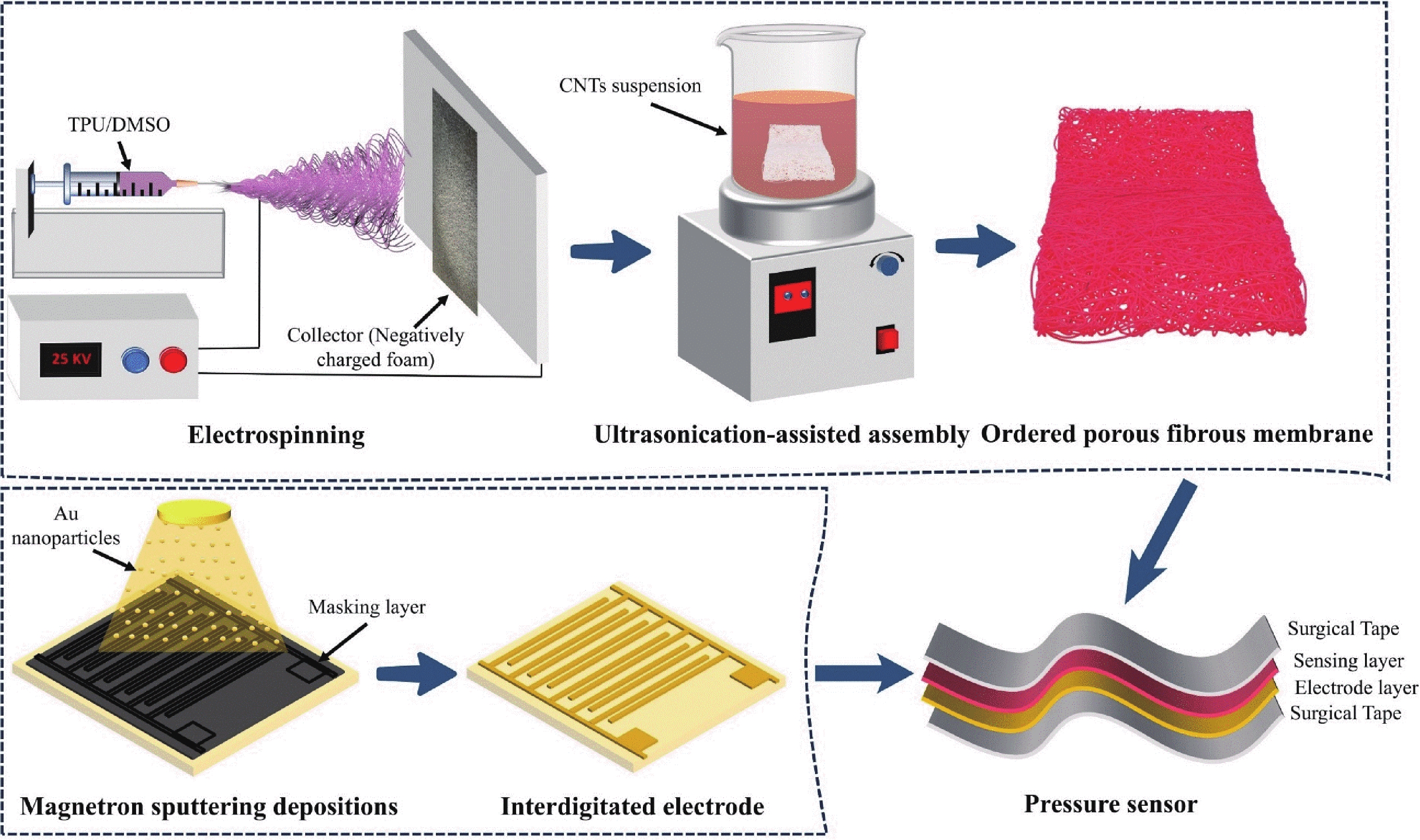 The random nanofiber distribution in traditional electrospun membranes restricts the pressure sensing sensitivity and measurement range of electronic skin. Moreover, current multimodal sensing suffers from issues like overlapping signal outputs and slow response. Herein, a novel electrospinning method is proposed to prepare double-coupled microstructured nanofibrous membranes. Through the effect of high voltage electrostatic field in the electrospinning, the positively charged nanofibers are preferentially attached to the negatively charged foam surface, forming the ordered two-dimensional honeycomb porous nanofibrous membrane with three-dimensional spinous microstructure. Compared with the conventional random porous nanofibrous membrane, the bionic two-dimensional honeycomb and three-dimensional spinous dual-coupled microstructures in the ordered porous nanofibrous membrane endows the electronic skin with significantly improved mechanical properties (maximum tensile strain increased by 77% and fatigue resistance increased by 35%), air permeability (water vapor transmission rate increased by 16%) and sensing properties (pressure sensitivity increased by 276% and detection range increased by 137%). Furthermore, the electronic skin was constructed by means of a conformal composite ionic liquid functionalized nanofibrous membrane, and the real-time and interference-free dual-signal monitoring of pressure and temperature (maximum temperature coefficient of resistance: −0.918 °C−1) was realized.