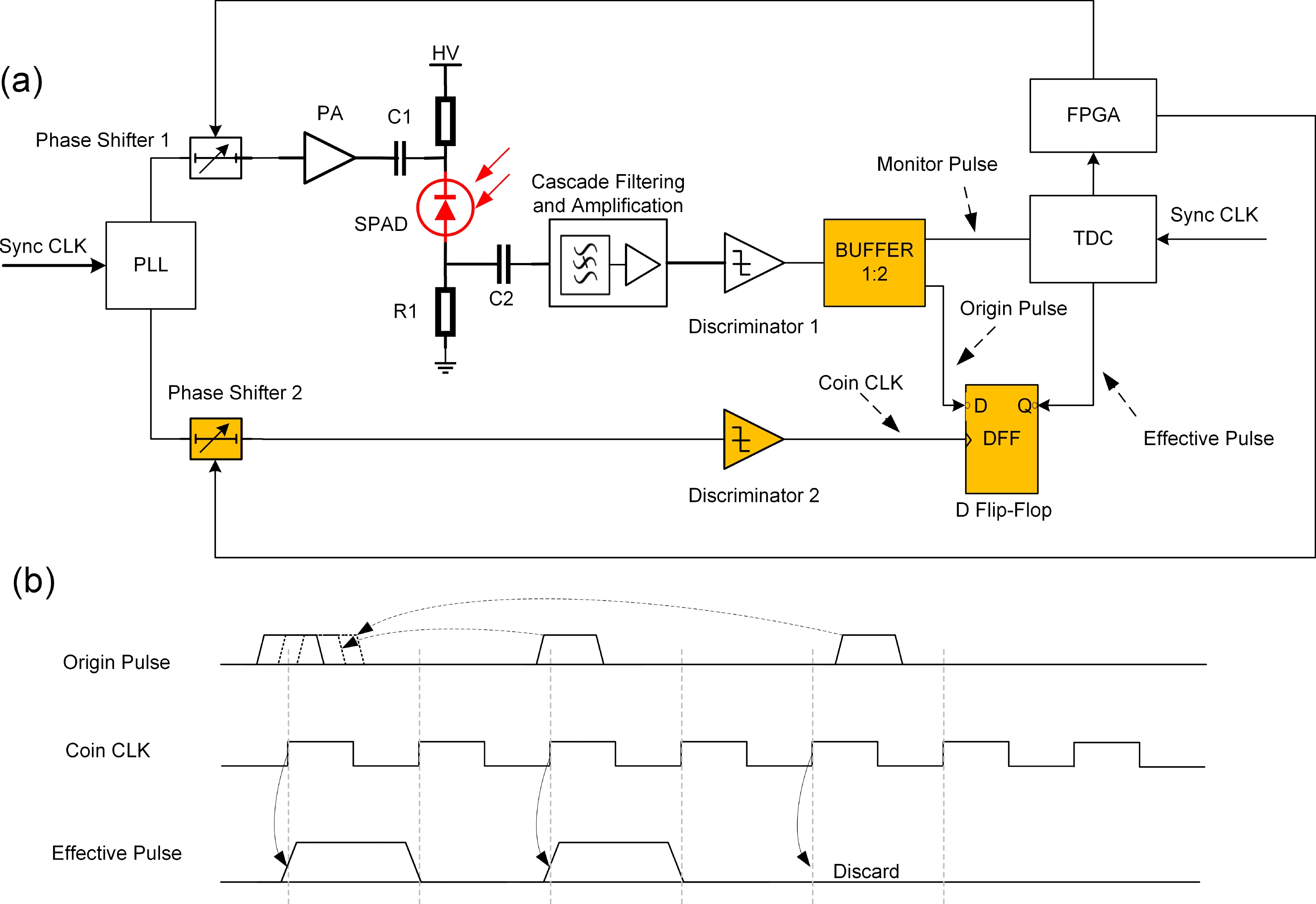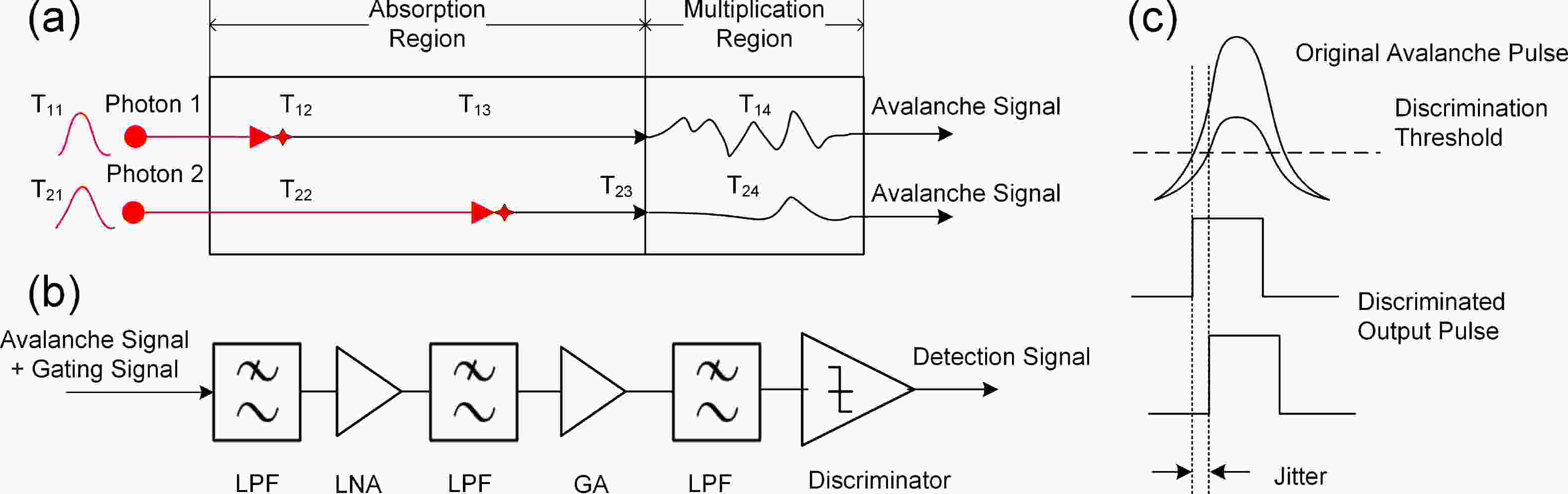 Quantum key distribution (QKD) achieves information-theoretic security based on quantum mechanics principles, where single-photon detectors (SPDs) serve as critical components. This study focuses on the sinusoidal gated SPDs widely used in high-speed QKD systems. We investigate the mechanisms underlying the rising-edge jitter in detection signals, identifying contributions from factors such as the temporal width of injected optical pulses, avalanche generation processes, avalanche signal extraction, and pulse discrimination. To address the issue of excessive jitter-induced bit errors, we propose a retiming scheme that utilizes coincidence signals synchronized with the sinusoidal gating signal. This approach effectively suppresses detection signal jitter and reduces the after-pulse probability of the detector. Experimental validation using a high-precision time-to-digital converter (TDC) demonstrates a significant reduction in the rising-edge jitter distribution after applying the suppression scheme. The proposed method features clear principles and straightforward engineering implementation, avoiding direct interference with the detector’s operational processes. The designed high-speed sinusoidal gated InGaAs/InP SPD operates at 1.25 GHz, achieving a remarkable reduction in after-pulse probability from 10.7% (without jitter suppression) to 0.72%, thereby enhancing the overall performance of QKD systems.
