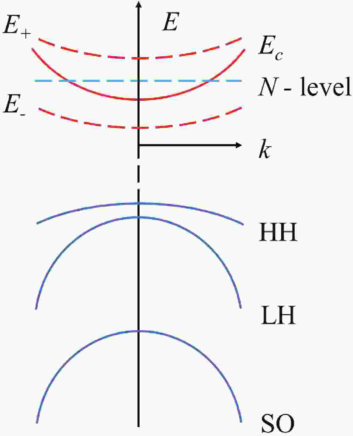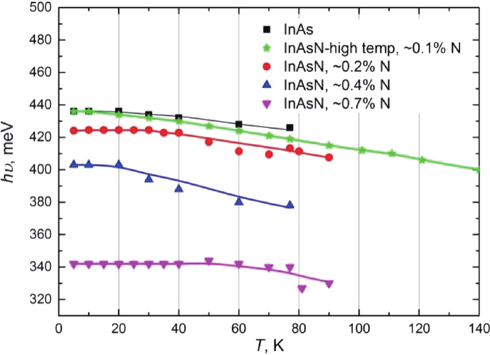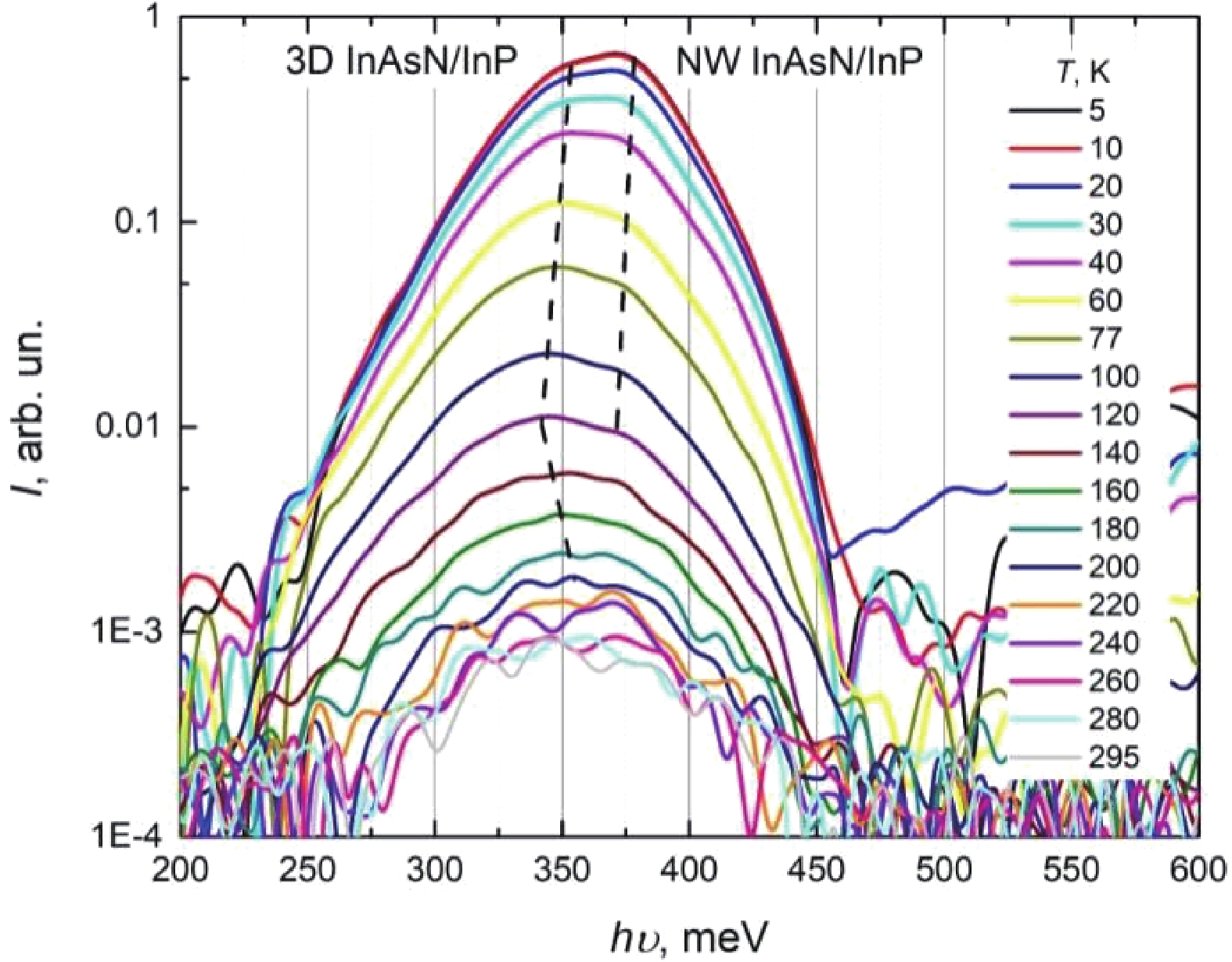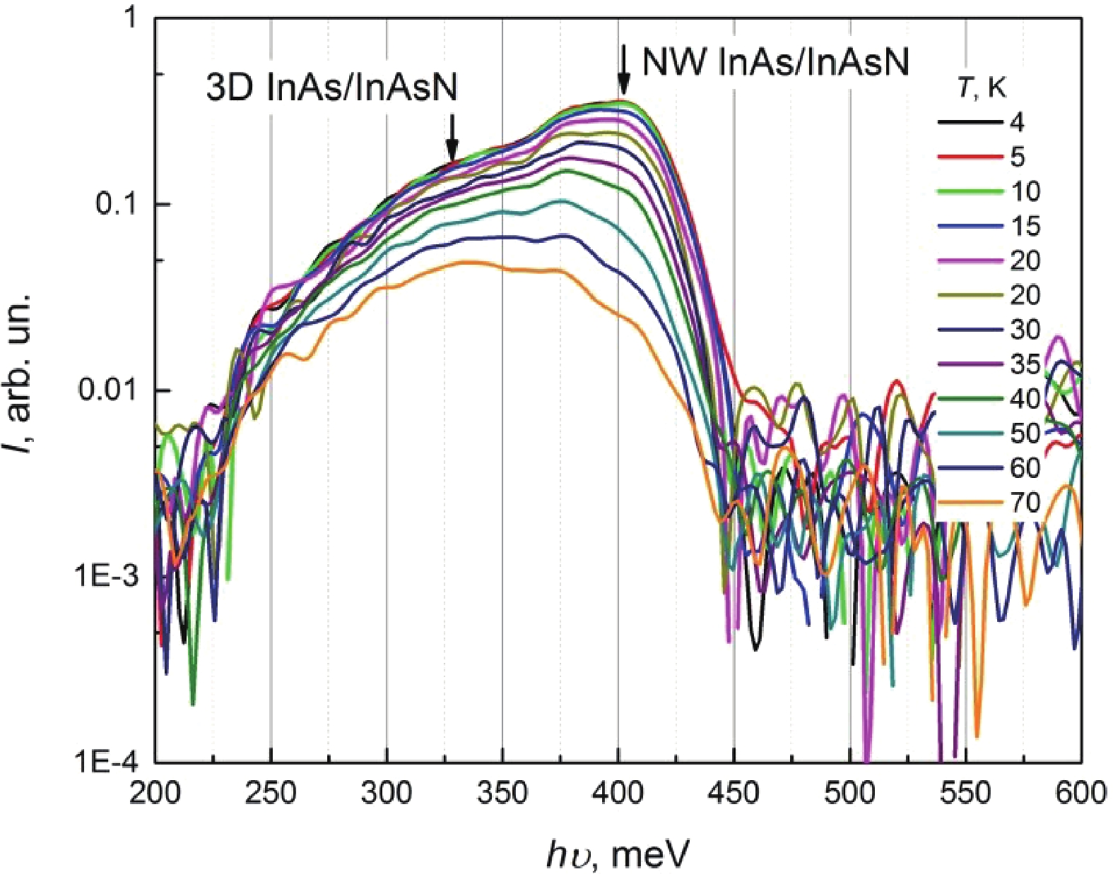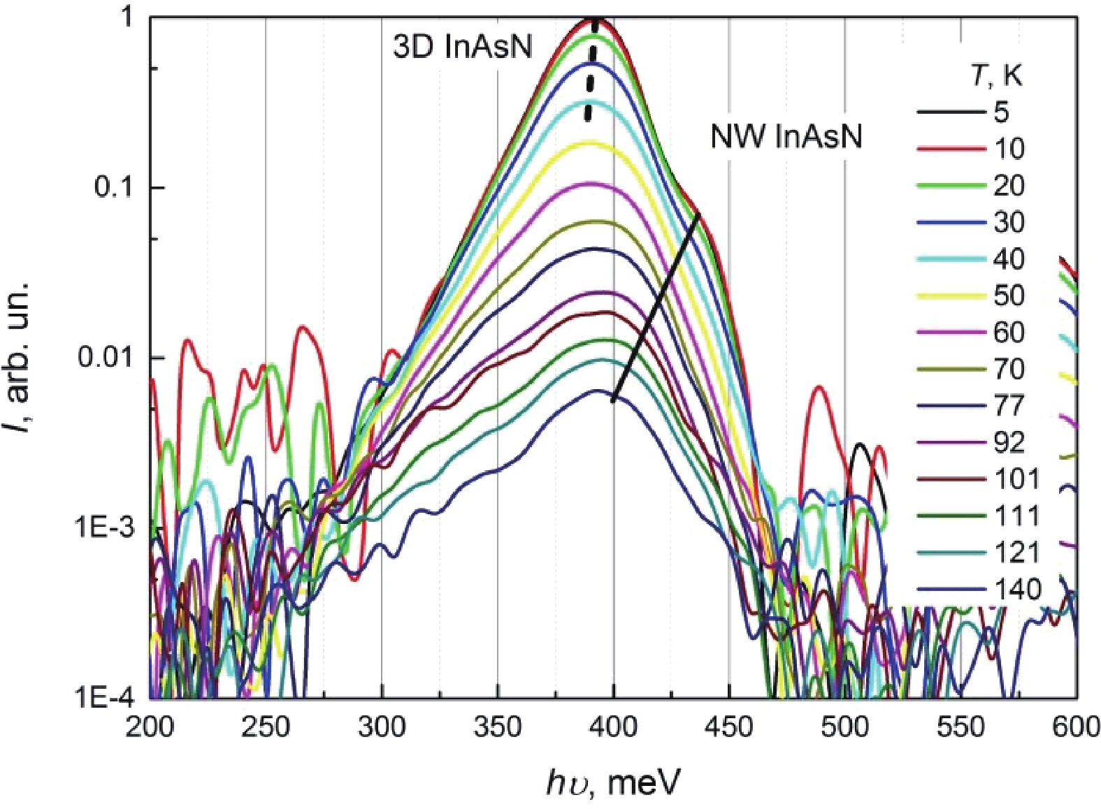 InAsN nanowires on InAs stems were obtained using plasma-assisted molecular beam epitaxy on a SiOx/Si (111) substrate. Also, heterostructured InAs/InAsN and InAsN/InP nanowires were grown in the core/shell geometry. In the low-temperature photoluminescence spectra of the grown structures, spectral features are observed that correspond to the polytypic structure of nanowires with a predominance of the wurtzite phase and parasitic islands of the sphalerite phase. It was shown that the interband photoluminescence spectral features of InAsN nanowires experience a red shift relative to the pristine InAs nanowires. The incorporation of nitrogen reduces the bandgap by splitting the conduction band into two subbands. The position of the spectral features in the photoluminescence spectra confirms the formation of a nitride solid solution with a polytypic hexagonal structure, having a concentration of nitrogen atoms of up to 0.7%. Additional passivation of the nanowire surface with InP leads to a decrease in the intensity of nonradiative recombination and an improvement in the photoluminescent response of the nanowires, which makes it possible to detect photoluminescence emission at room temperature. Thus, by changing the composition and morphology of nanowires, it is possible to control their electronic structure, which allows varying the operating range of detectors and mid-IR radiation sources based on them.