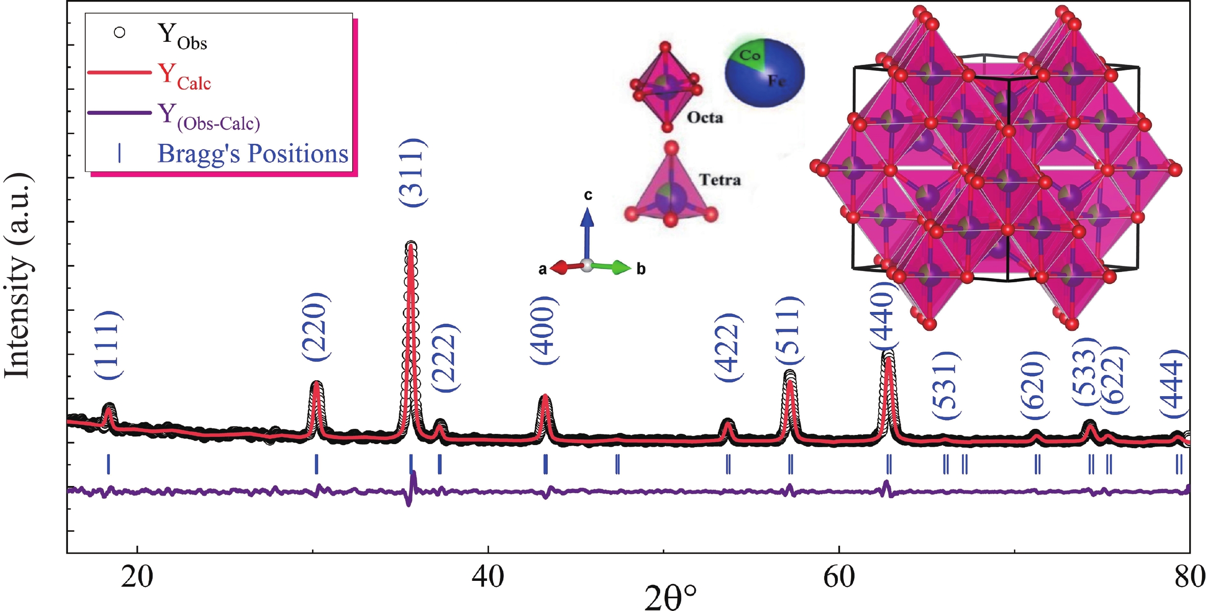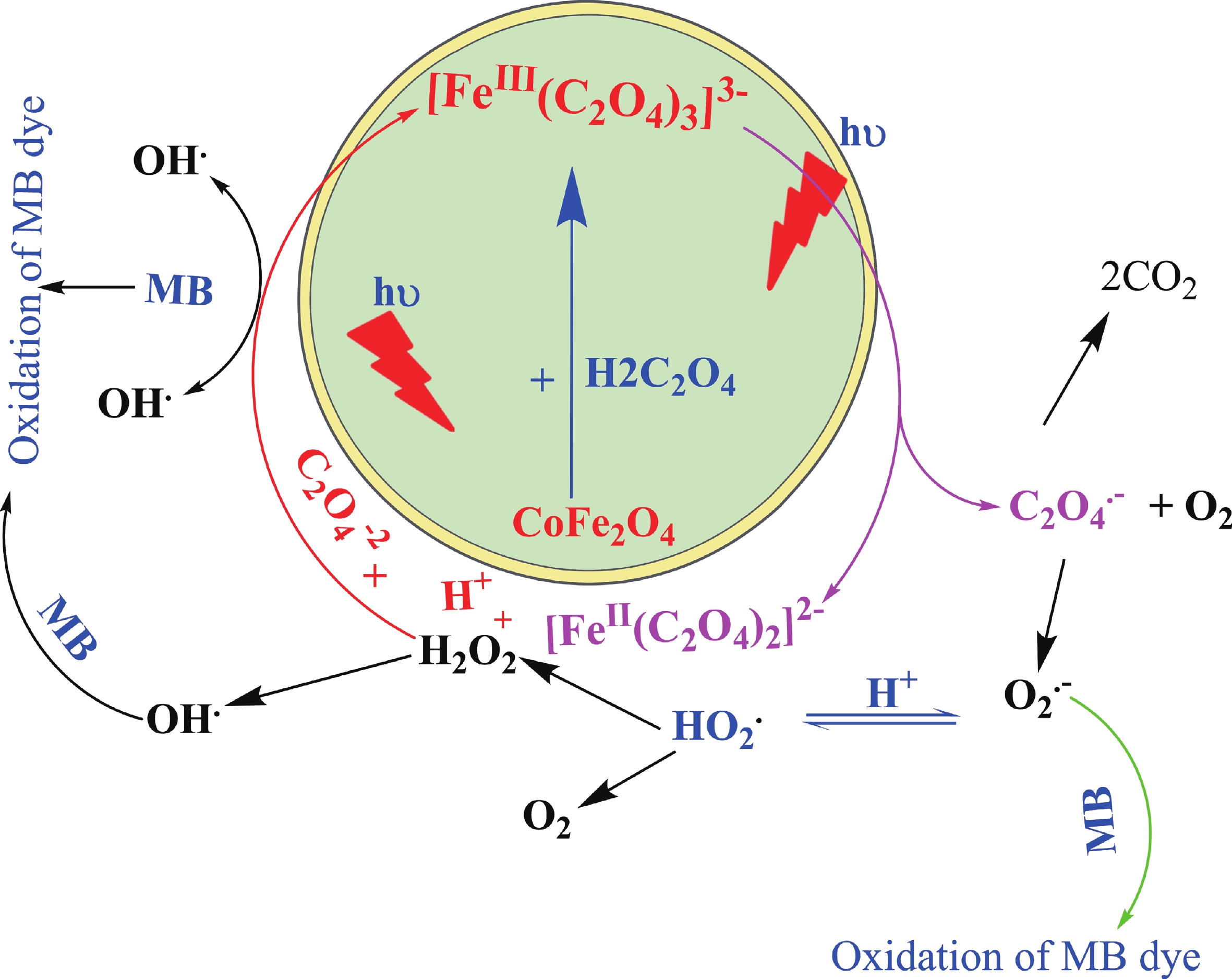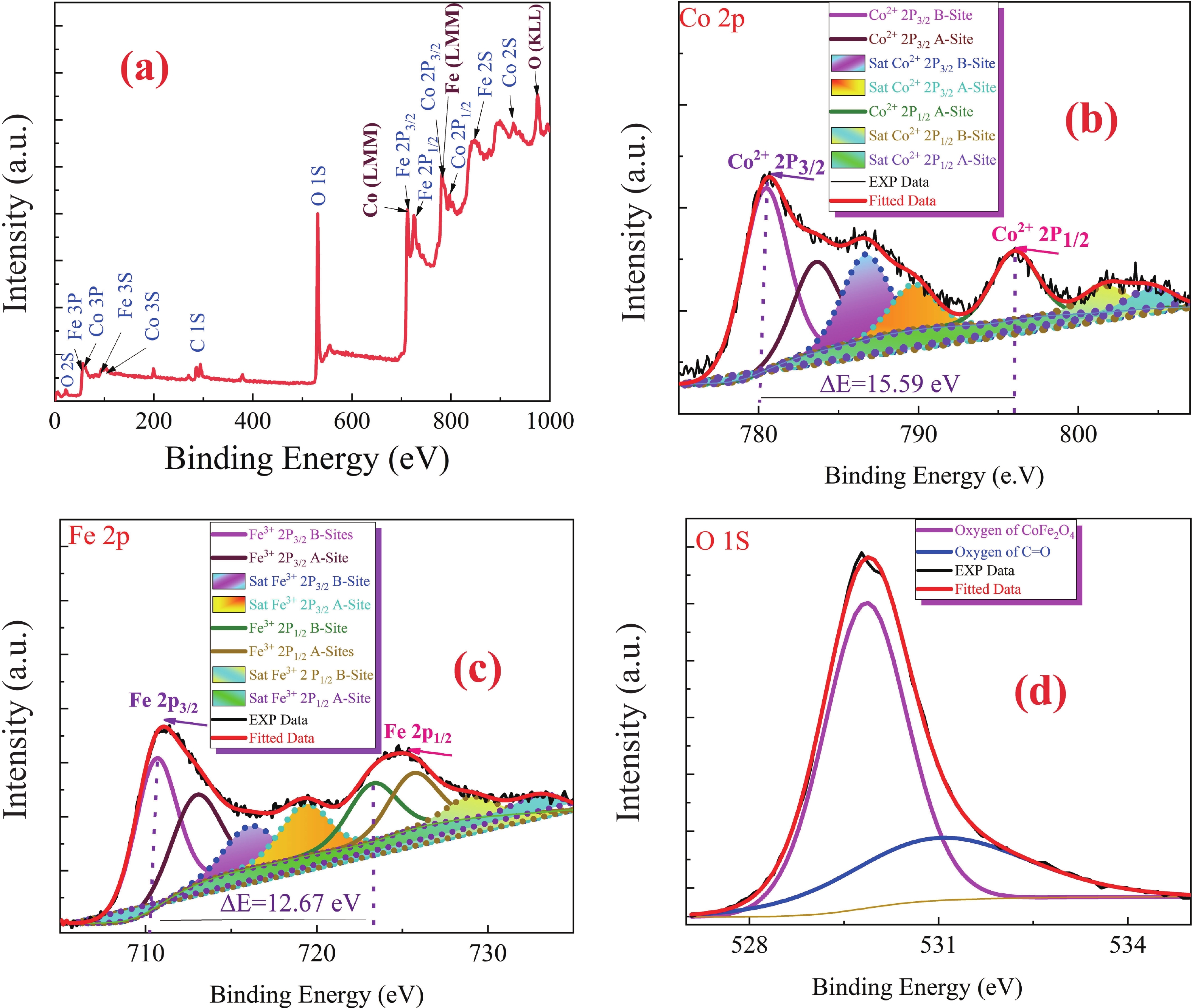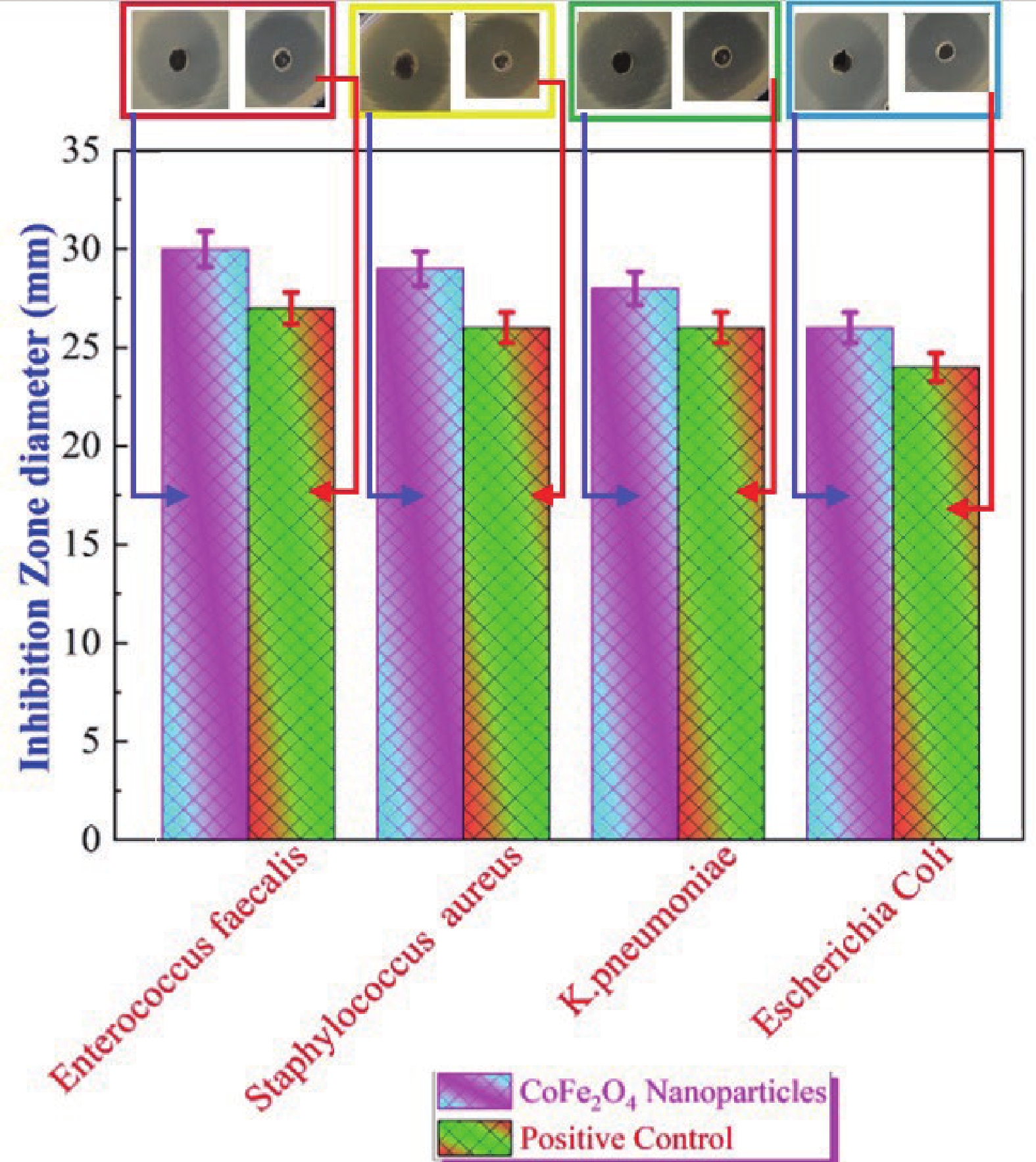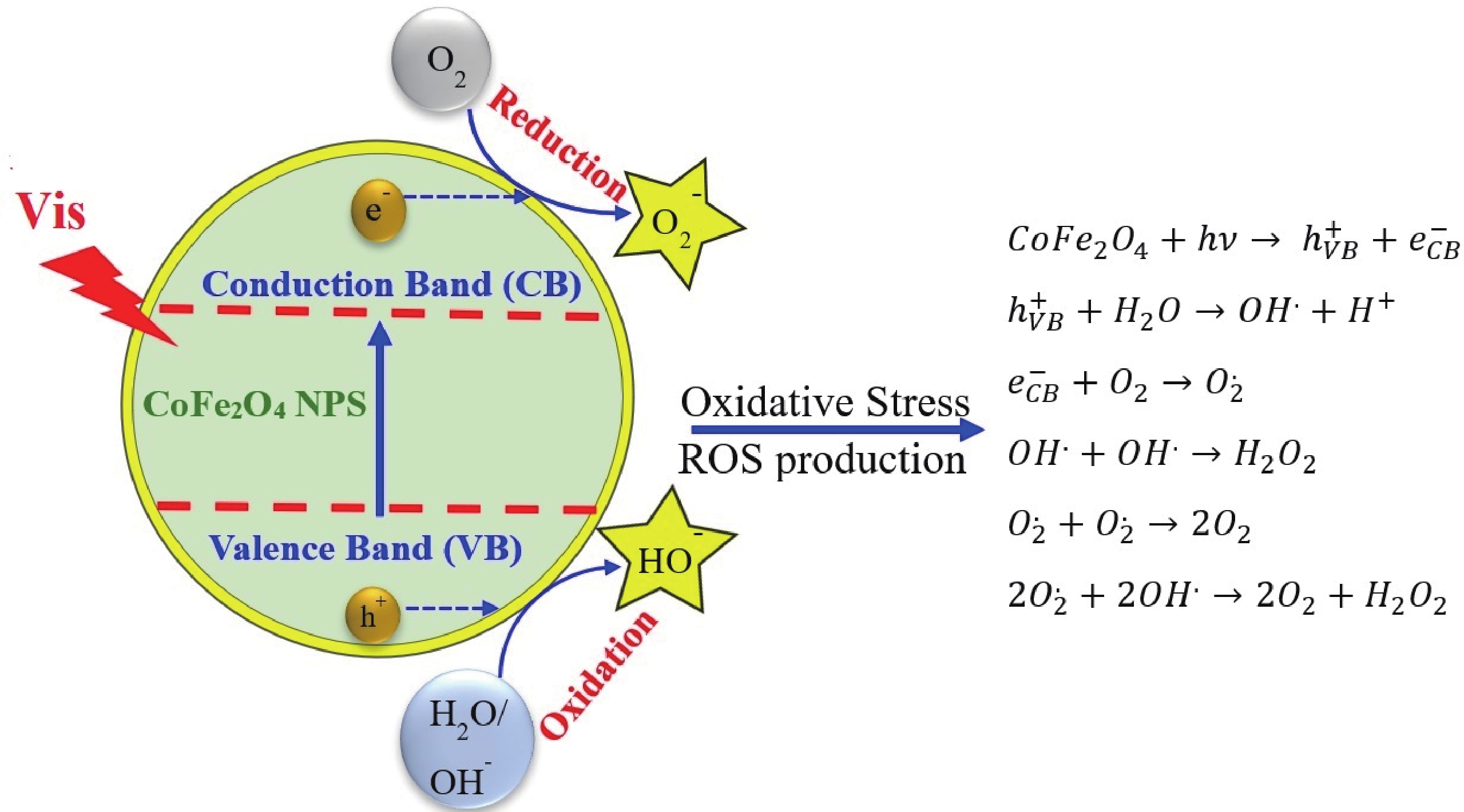 This study investigates the effect of apple extract on CoFe2O4 nanoparticles synthesized via a green self-ignition method. High resolution transmission electron microscope (HRTEM) showed nanometric particles with varied shapes, while X-ray diffraction (XRD) and Rietveld refinement confirmed a facecentered cubic (Fd3̅m) structure. Mössbauer spectroscopy revealed a Zeeman sextet pattern with only Fe3+ ions. Ultra violet vissible nearinfrared (UV–Vis–NIR) spectra indicated strong absorbance in the visible and NIR regions, suggesting optoelectronic potential. The nanoparticles demonstrated high photo-Fenton catalytic efficiency, degrading 96.88% of Methylene Blue under visible light. They also exhibited 100% adsorption capacities for Cr3+ and Pb2+, making them effective for water treatment. These properties were attributed to a large surface area (347.04 m2/g), mesoporous structure, and mixed spinel phase. ANOVA and Tukey’s honestly significant difference (HSD) tests confirmed that contact time and adsorbent dosage significantly affected pollutant removal. Additionally, strong antimicrobial activity highlighted their biotechnological relevance. The inclusion of apple extract enhanced structural and functional features, expanding application prospects in spin valves, magnetic recording, refrigeration, microwave technologies (C to Ku bands), optoelectronics, and biotechnology. Future work should explore the photo-Fenton degradation mechanism and optimize synthesis for scalable production, aiming to maximize their industrial utility.