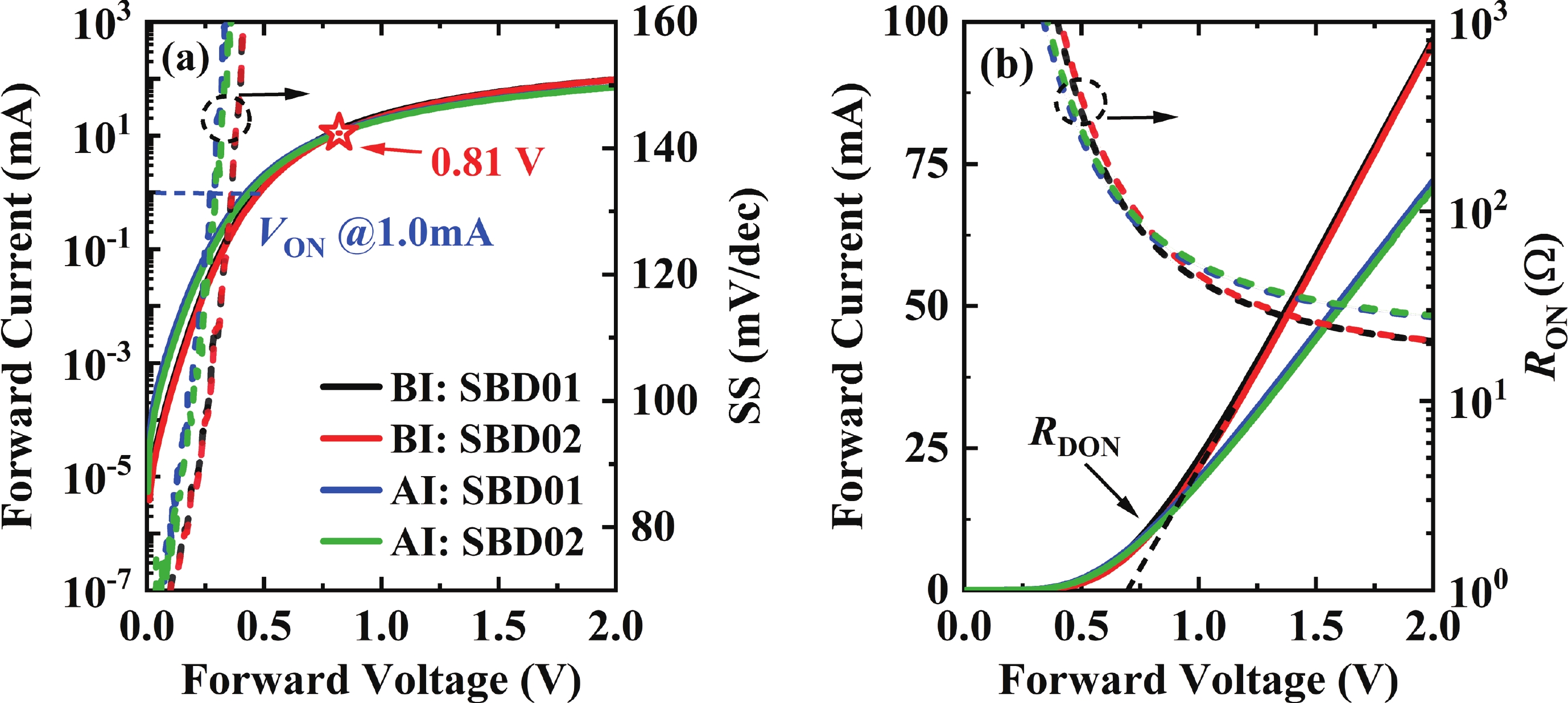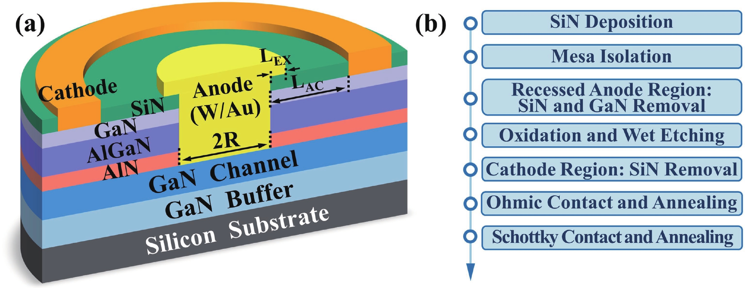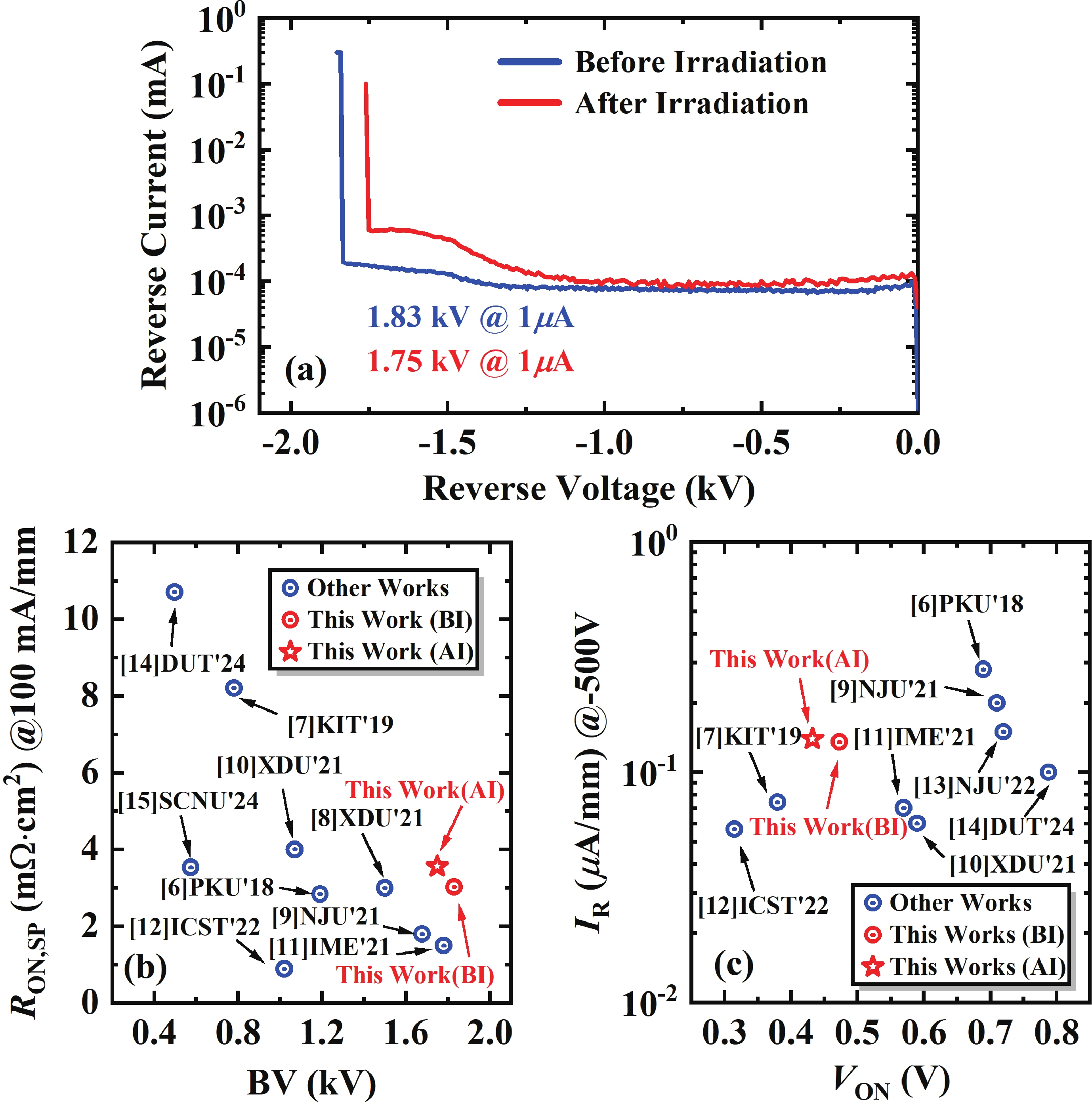 In this letter, we demonstrate the effect of γ irradiation on the lateral AlGaN/GaN Schottky barrier diodes (SBDs) with self-terminated recessed anode structure and low work-function metal tungsten (W) as anode. For a comprehensive evaluation of the radiation-resistance performance of the device, the total dose of γ irradiation is up to 100 kGy with irradiation time of 20 h. Attributed to the barrier lowering effect of the W/GaN interface induced by γ irradiation observed in the experiment, the extracted turn-on voltage (VON) defined at anode forward current of 1 mA decreases from 0.47 to 0.43 V. Meanwhile, benefiting from the reinforced Schottky interface treated by post-anode-annealing, a high breakdown voltage (BV) of 1.75 kV is obtained for the γ-irradiated AlGaN/GaN SBD, which shows the promising application for the deep-space radiation environment and promotes the development of radiation-resistance research for GaN SBDs.