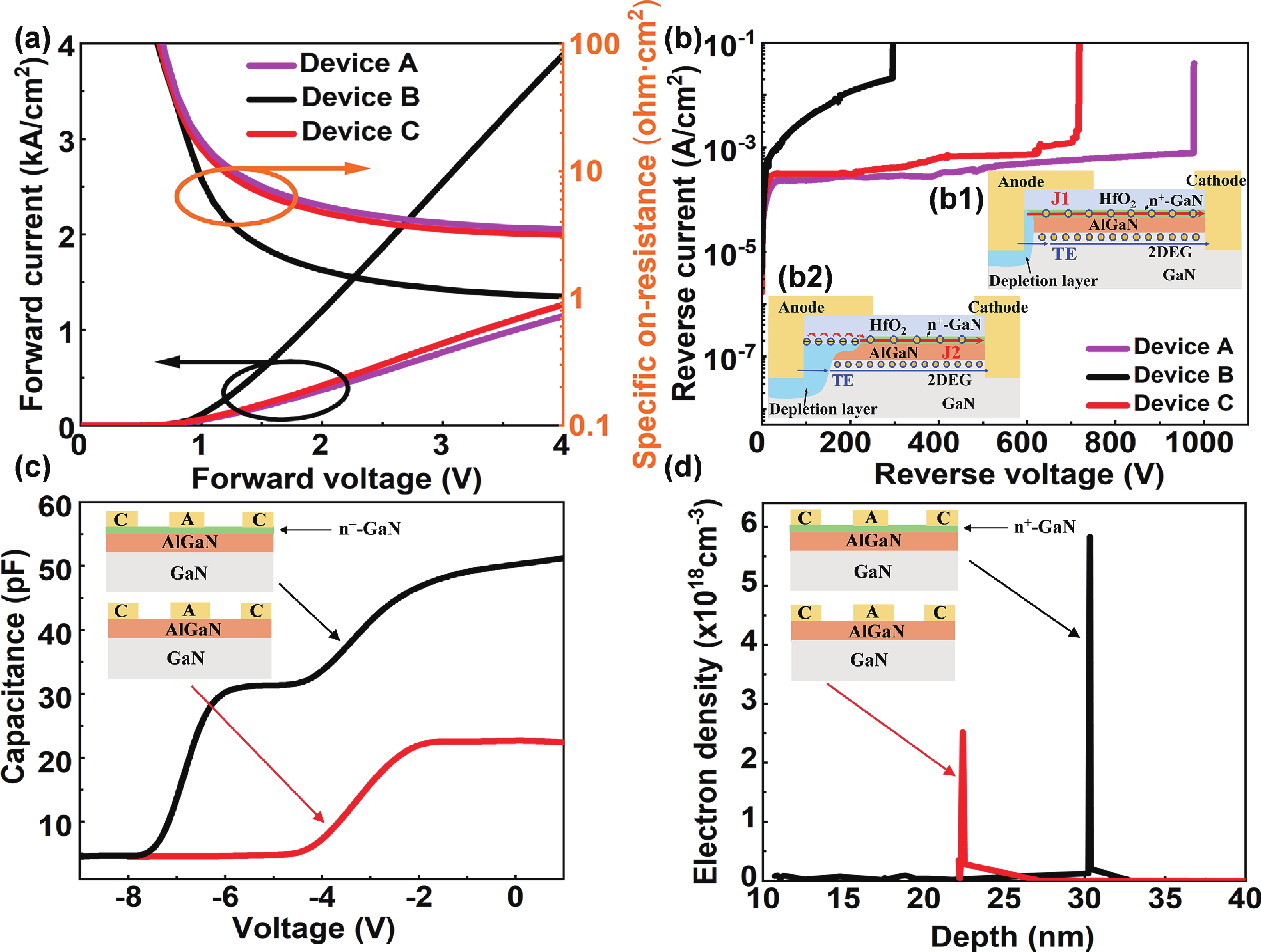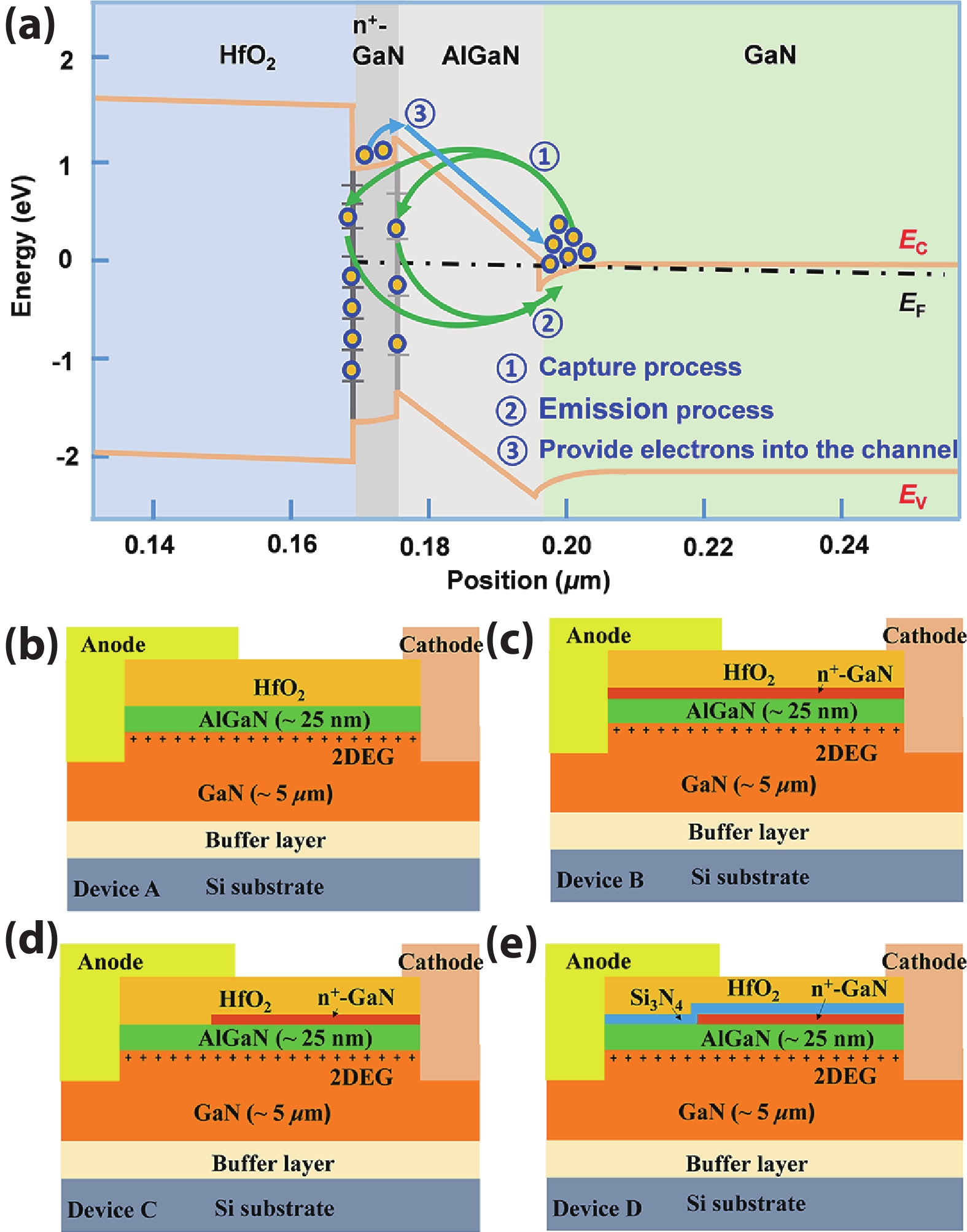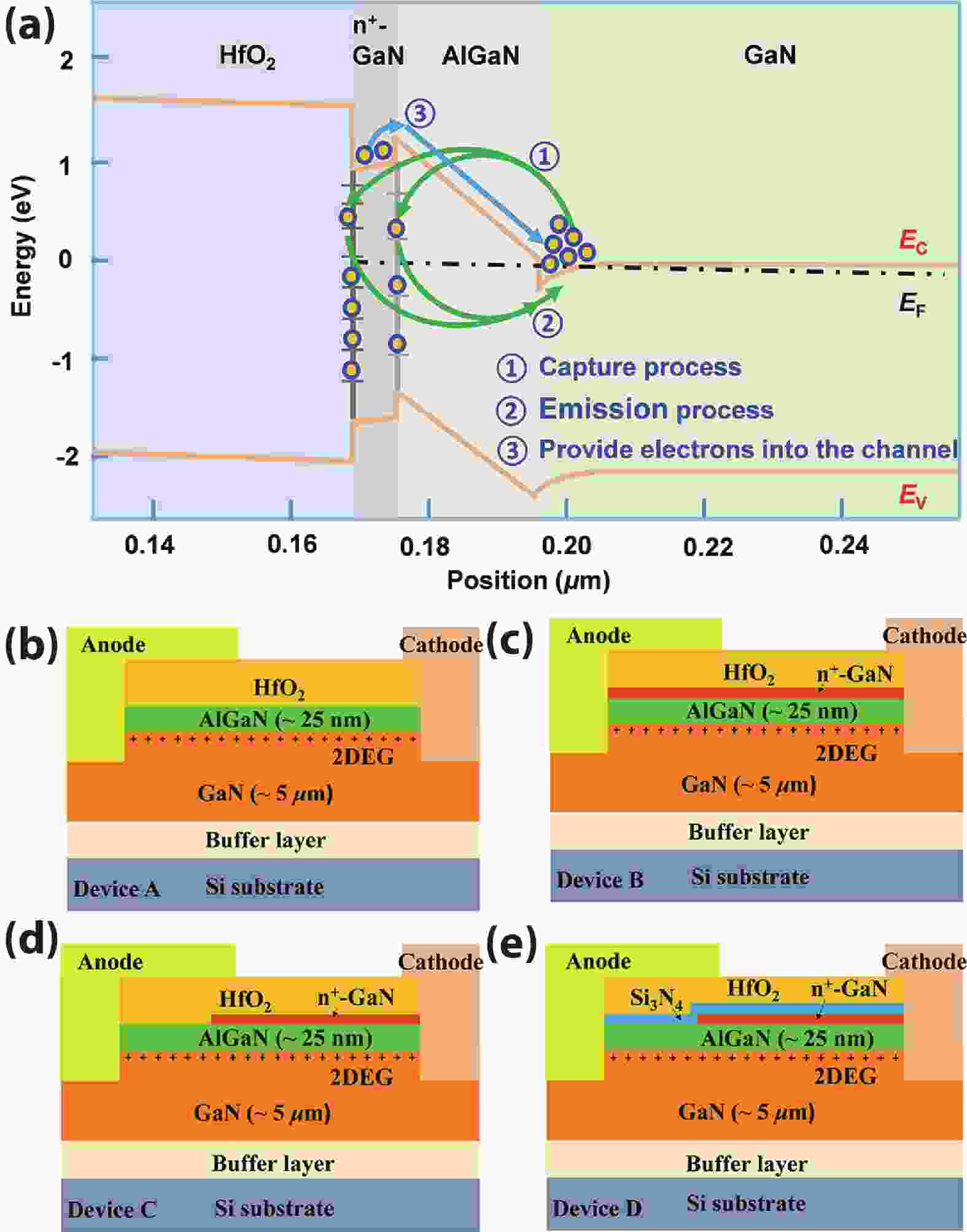 In this work, we design and fabricate AlGaN/GaN-based Schottky barrier diodes (SBDs) on a silicon substrate with a trenched n+-GaN cap layer. With the developed physical models, we find that the n+-GaN cap layer provides more electrons into the AlGaN/GaN channel, which is further confirmed experimentally. When compared with the reference device, this increases the two-dimensional electron gas (2DEG) density by two times and leads to a reduced specific ON-resistance (Ron,sp) of ~2.4 mΩ·cm2. We also adopt the trenched n+-GaN structure such that partial of the n+-GaN is removed by using dry etching process to eliminate the surface electrical conduction when the device is set in the off-state. To suppress the surface defects that are caused by the dry etching process, we also deposit Si3N4 layer prior to the deposition of field plate (FP), and we obtain a reduced leakage current of ~8 × 10−5 A·cm−2 and breakdown voltage (BV) of 876 V. The Baliga’s figure of merit (BFOM) for the proposed structure is increased to ~319 MW·cm−2. Our investigations also find that the pre-deposited Si3N4 layer helps suppress the electron capture and transport processes, which enables the reduced dynamic Ron,sp.