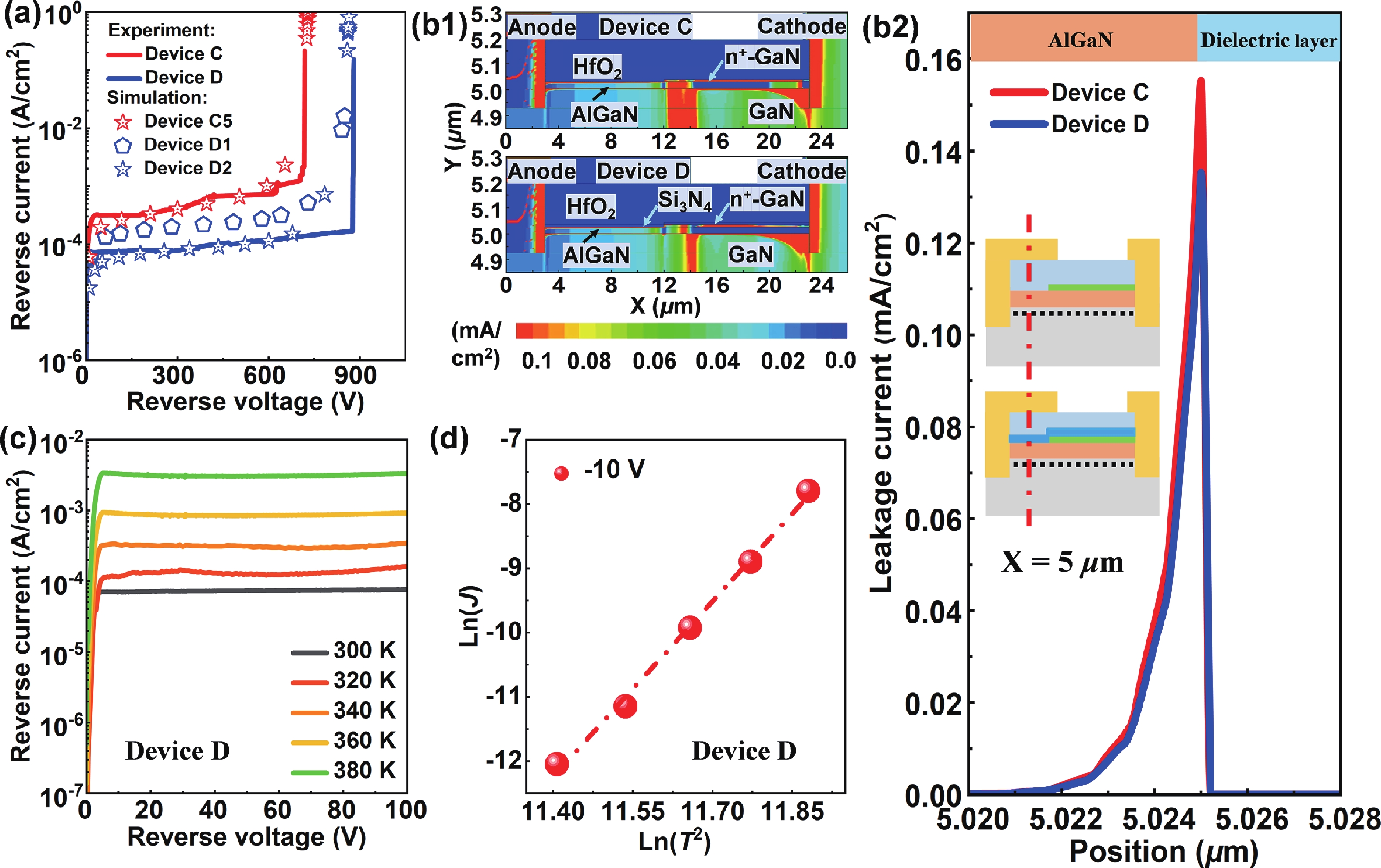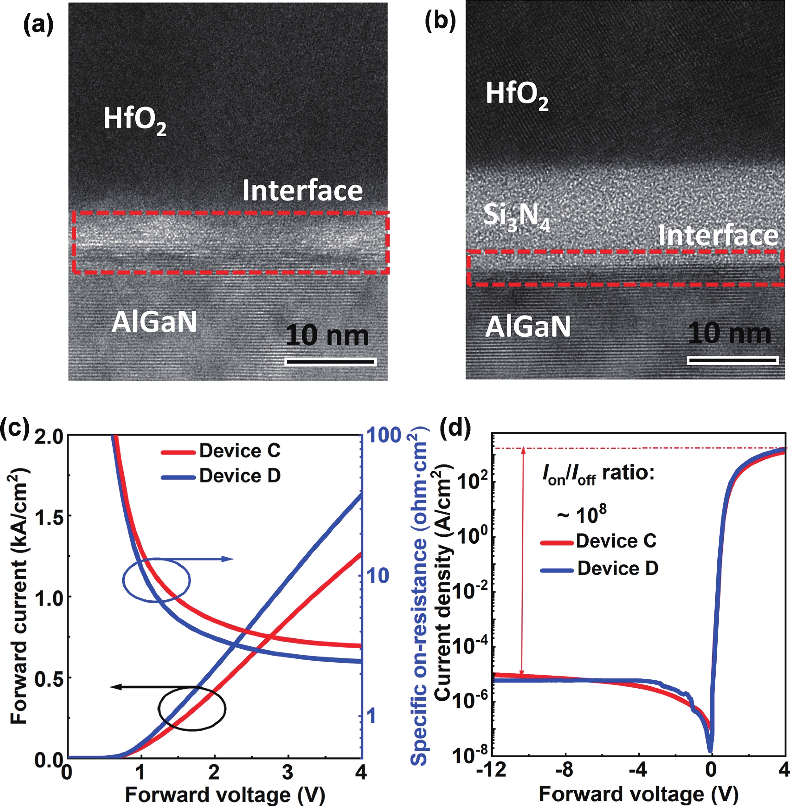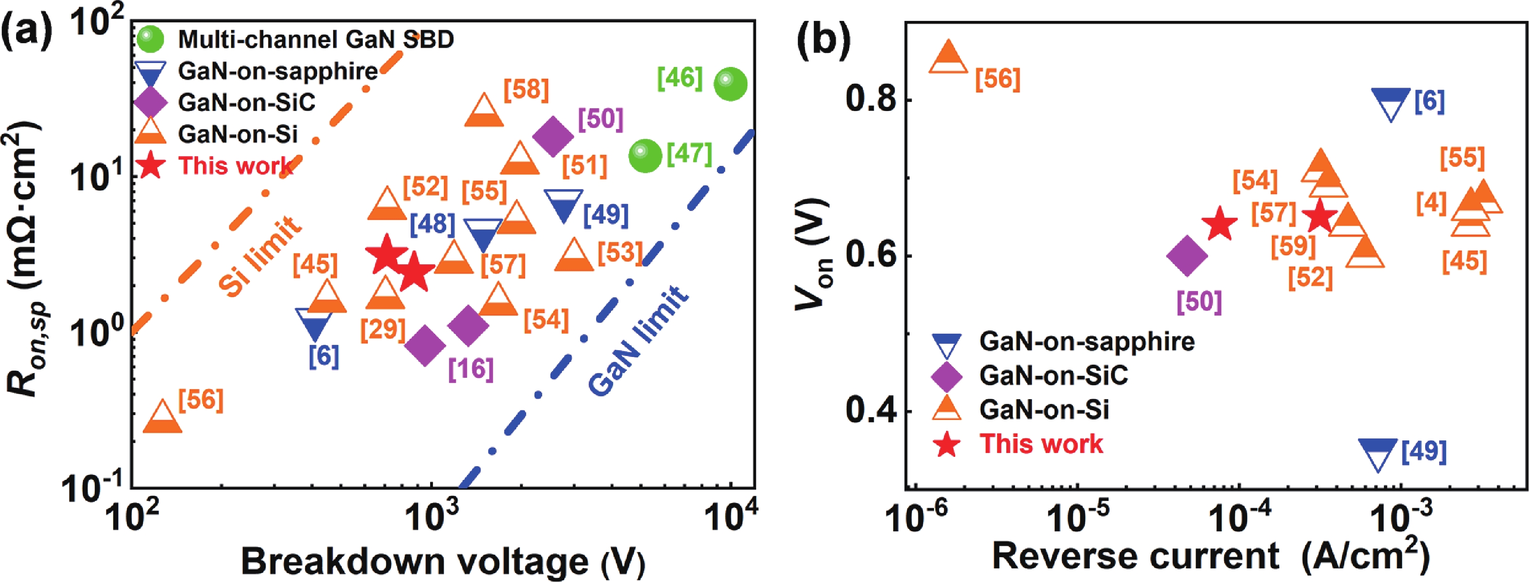 In this work, we design and fabricate AlGaN/GaN-based Schottky barrier diodes (SBDs) on a silicon substrate with a trenched n+-GaN cap layer. With the developed physical models, we find that the n+-GaN cap layer provides more electrons into the AlGaN/GaN channel, which is further confirmed experimentally. When compared with the reference device, this increases the two-dimensional electron gas (2DEG) density by two times and leads to a reduced specific ON-resistance (Ron,sp) of ~2.4 mΩ·cm2. We also adopt the trenched n+-GaN structure such that partial of the n+-GaN is removed by using dry etching process to eliminate the surface electrical conduction when the device is set in the off-state. To suppress the surface defects that are caused by the dry etching process, we also deposit Si3N4 layer prior to the deposition of field plate (FP), and we obtain a reduced leakage current of ~8 × 10−5 A·cm−2 and breakdown voltage (BV) of 876 V. The Baliga’s figure of merit (BFOM) for the proposed structure is increased to ~319 MW·cm−2. Our investigations also find that the pre-deposited Si3N4 layer helps suppress the electron capture and transport processes, which enables the reduced dynamic Ron,sp.
