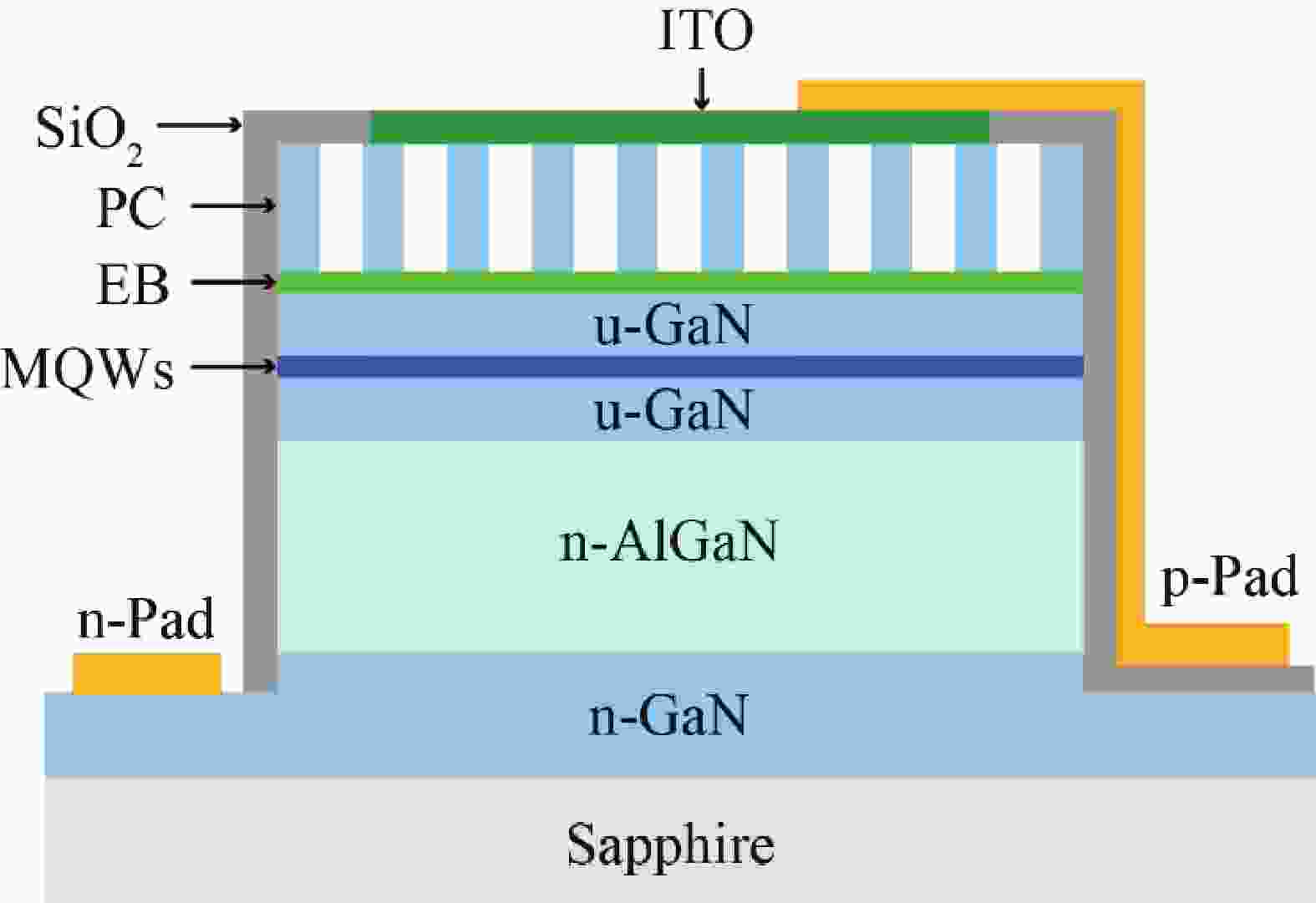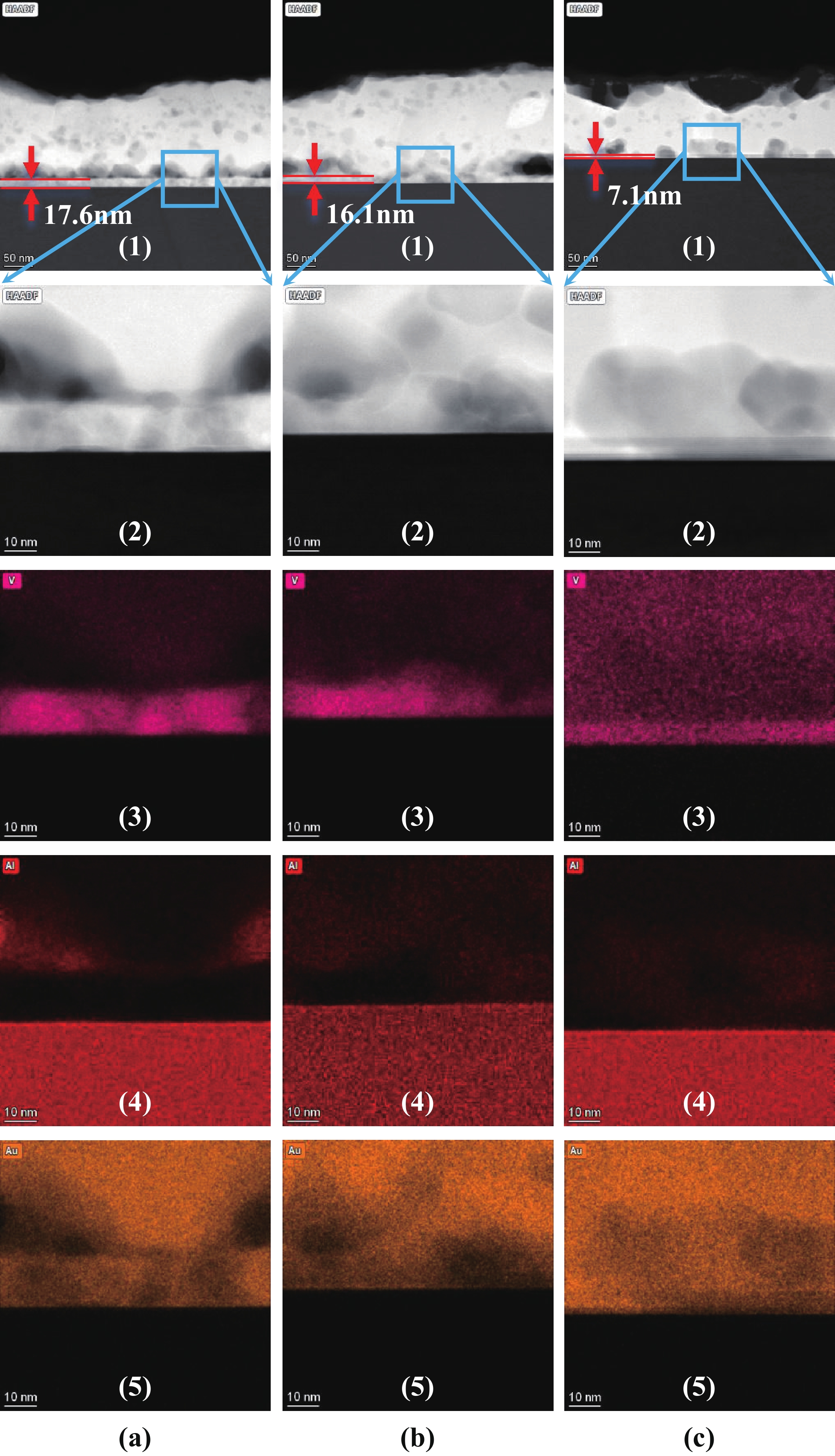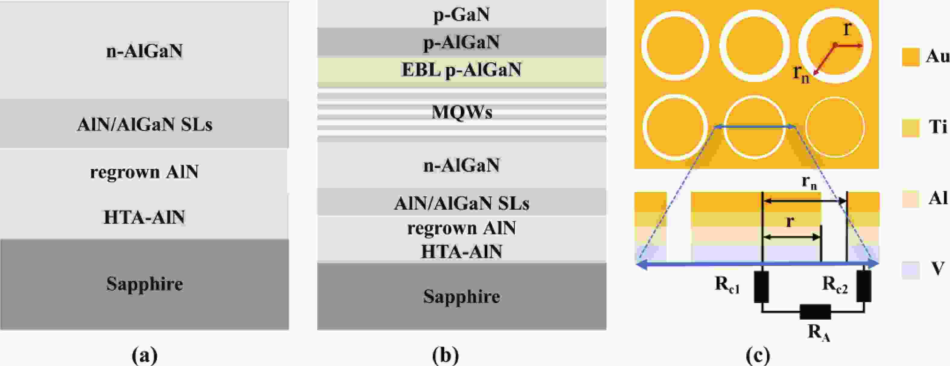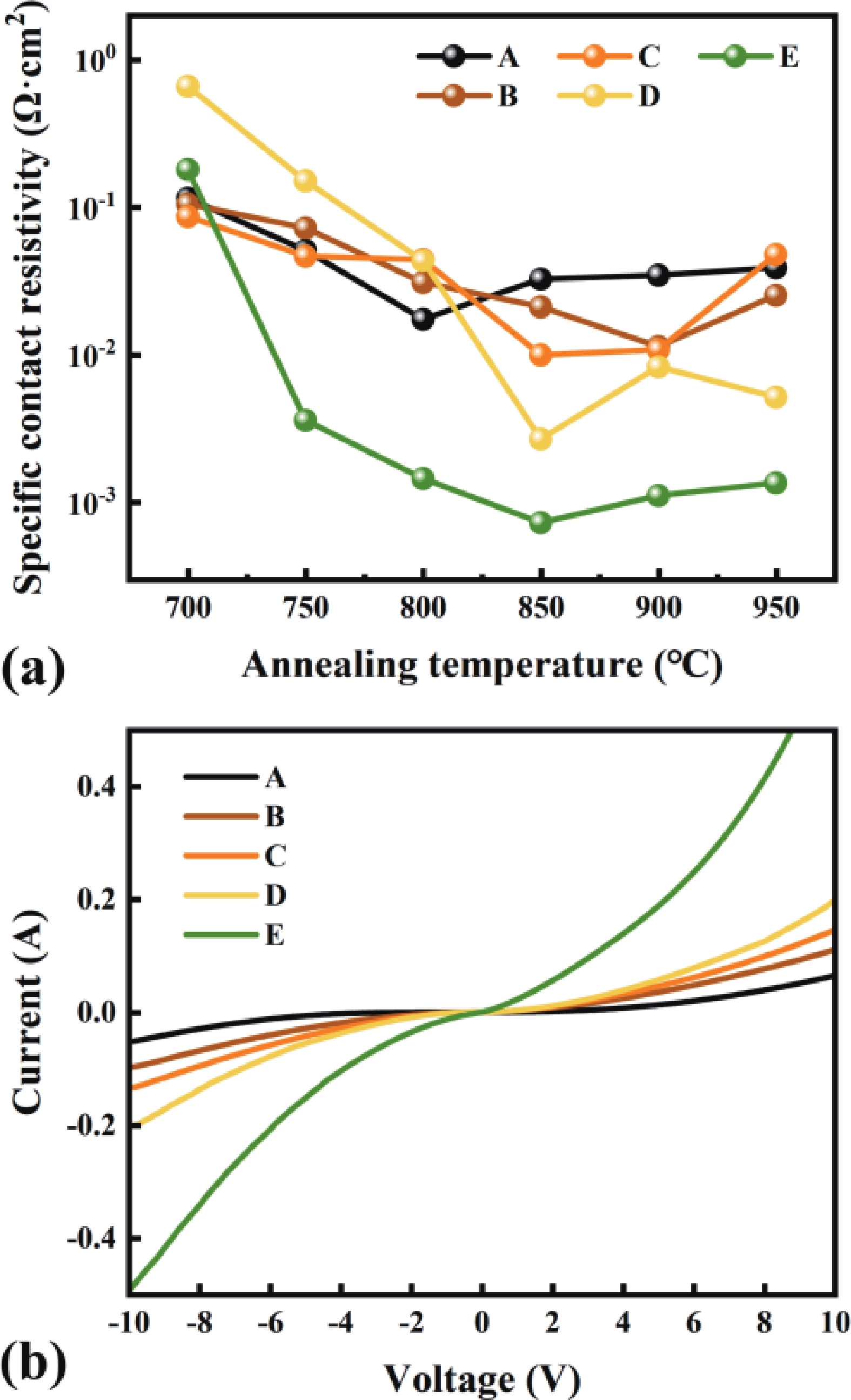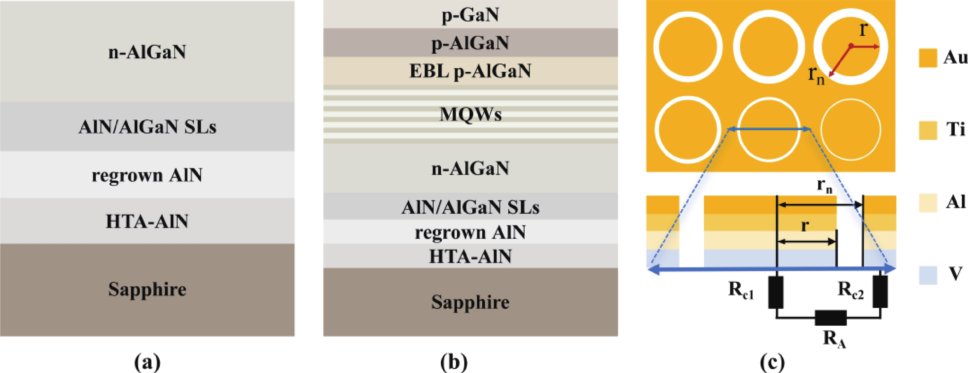 AlGaN-based LEDs with peak wavelength below 240 nm (far-UVC) pose no significant harm to human health, thus highlighting their broader application potential. While, there is a significant Schottky barrier between the n-electrode and Al-rich n-AlGaN, adversely impeding electron injection and resulting in considerable heat generation. Here, we fabricate V-based electrodes of V/Al/Ti/Au on n-AlGaN with Al content over 80% and investigate the relationship between the metal diffusion and contact properties during the high-temperature annealing process. Experiments reveal that decreasing V thickness in the electrode promotes the diffusion of Al towards the surface of n-AlGaN, which facilitates the formation of VN and thus the increase of local electron concentration, resulting in lower specific contact resistivity. Then, increasing the Al thickness inhibits the diffusion of Au to the n-AlGaN surface, suppressing the rise of Schottky barrier. Experimentally, an optimized n-electrode of V(10 nm)/Al(240 nm)/Ti(40 nm)/Au(50 nm) on n-Al0.81Ga0.19N is obtained, realizing an optimal specific contact resistivity of 7.30 × 10−4 Ω·cm2. Based on the optimal n-electrode preparation scheme for Al-rich n-AlGaN, the work voltage of a far-UVC LED with peak wavelength of 233.5 nm is effectively reduced.