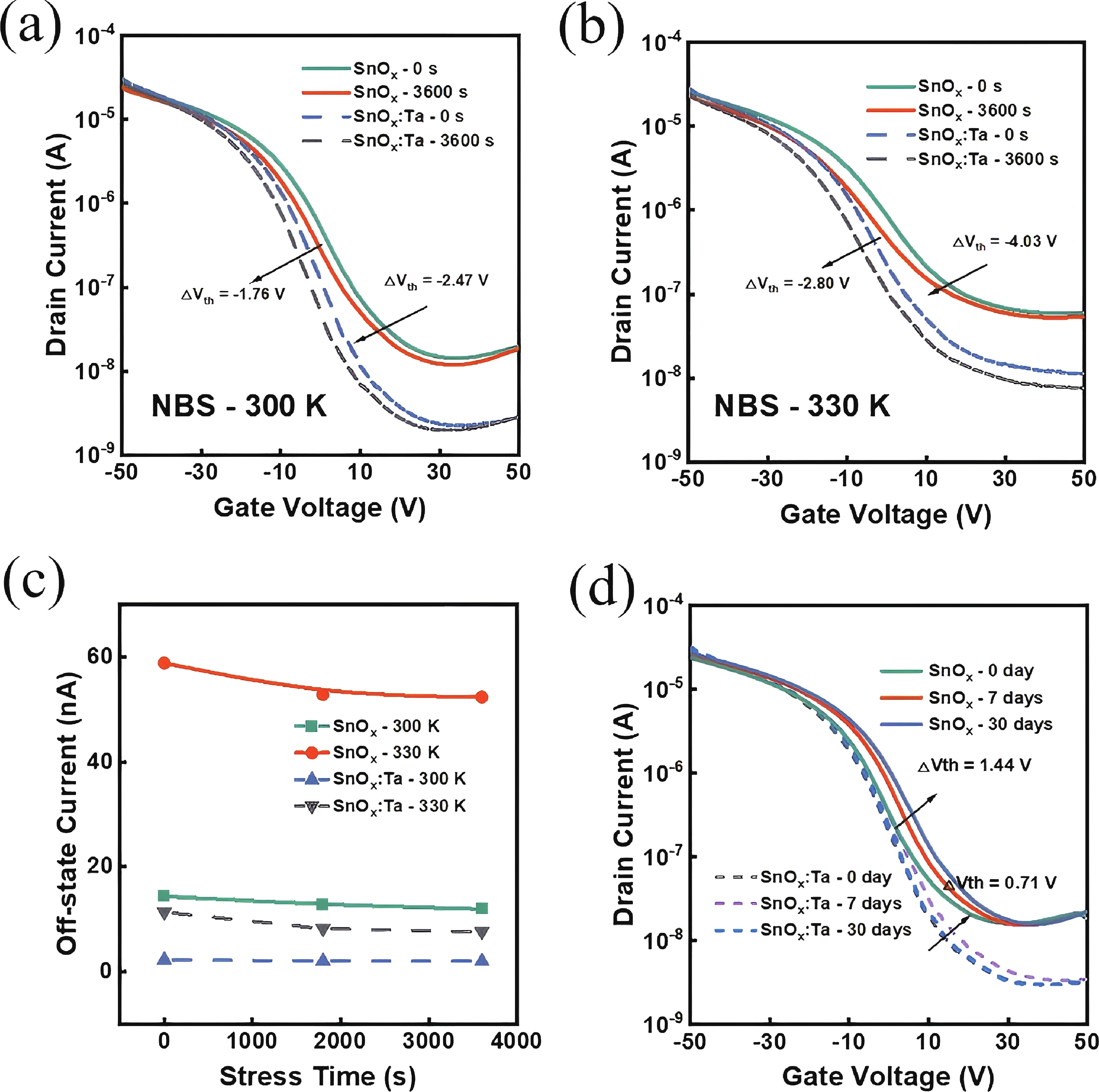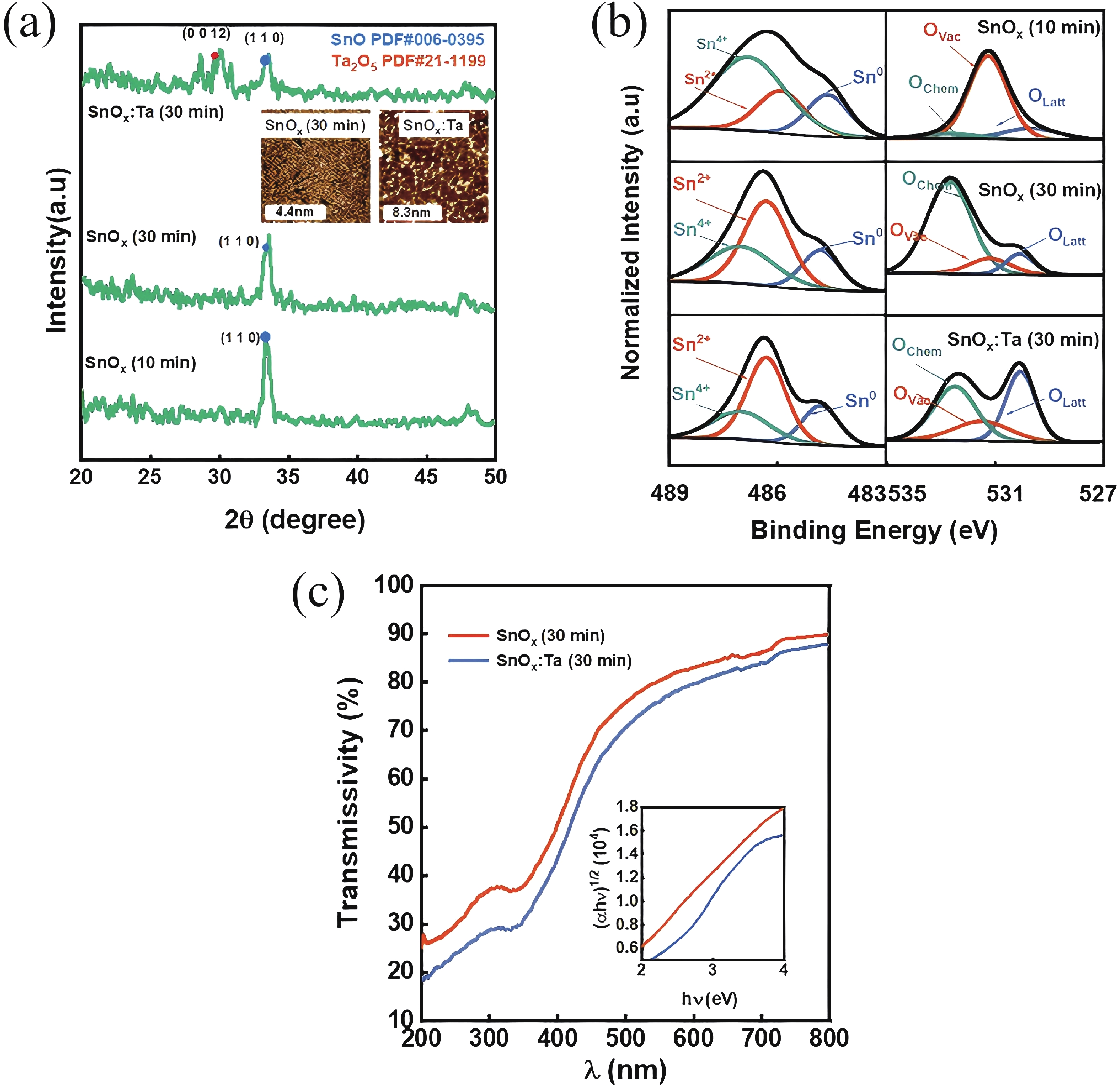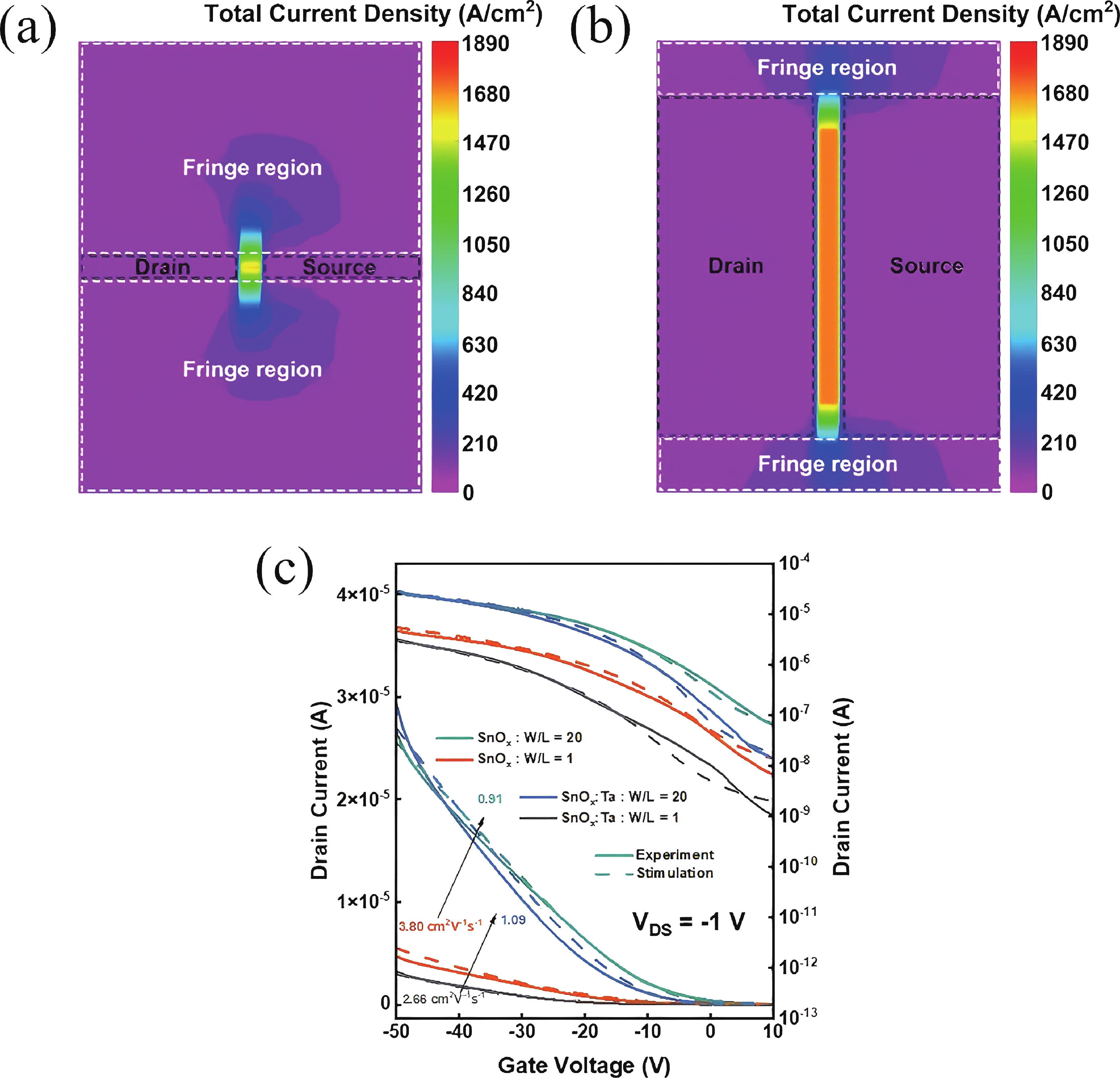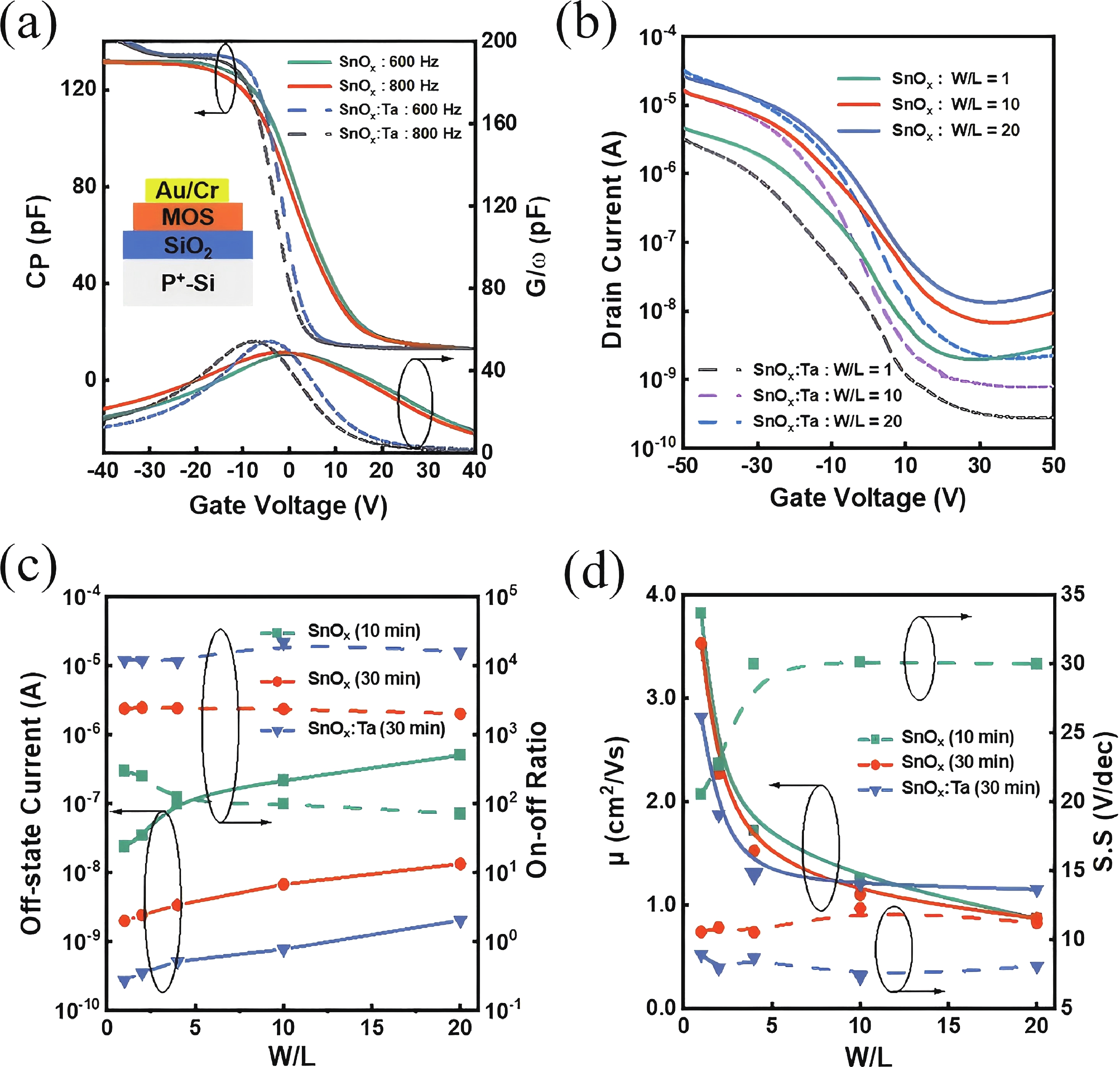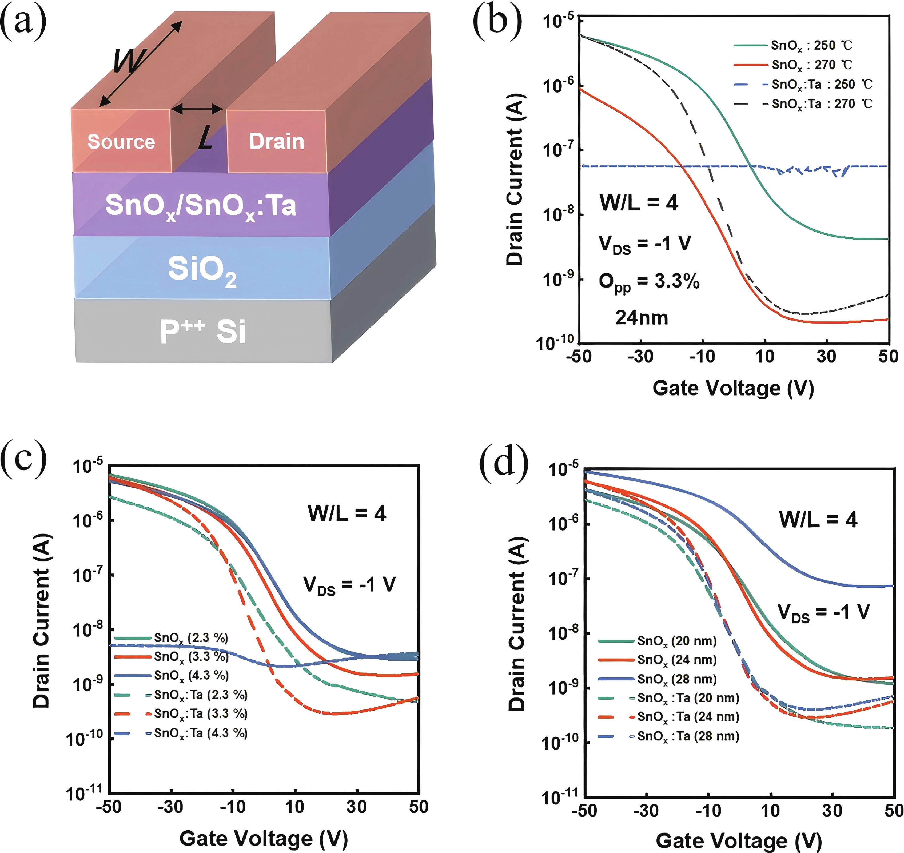In this work, the incorporation of tantalum (Ta) into p-type metal-oxide (SnOx) semiconductor film is investigated to improve the electrical characteristics and suppress the fringe effect of thin film transistors (TFTs). The Ta-doped SnOx (SnOx:Ta) film is deposited by radio-frequency (RF) magnetron sputtering with a Sn:Ta (3 at.%) target and thermally annealed at 270 °C for 30 min. Here, we observe that the SnOx:Ta film presents increased crystallinity, reduced defect density (3.25 × 1012 cm−2·eV−1), and widened bandgap (1.98 eV), in comparison with the undoped SnOx film. As a result, the SnOx:Ta TFTs exhibit a lower off-state current (Ioff), an improved on/off current ratio (2.17 × 104), a remarkably decreased subthreshold swing (SS) by 41%, and enhanced device stability. Additionally, by introducing Ta dopants, the fringe effect as well as the impact of channel width-to-length ratio (W/L) on electrical performances of the p-type oxide TFTs can be effectively suppressed. These results shall contribute to further exploration and development of p-type SnOx TFTs.