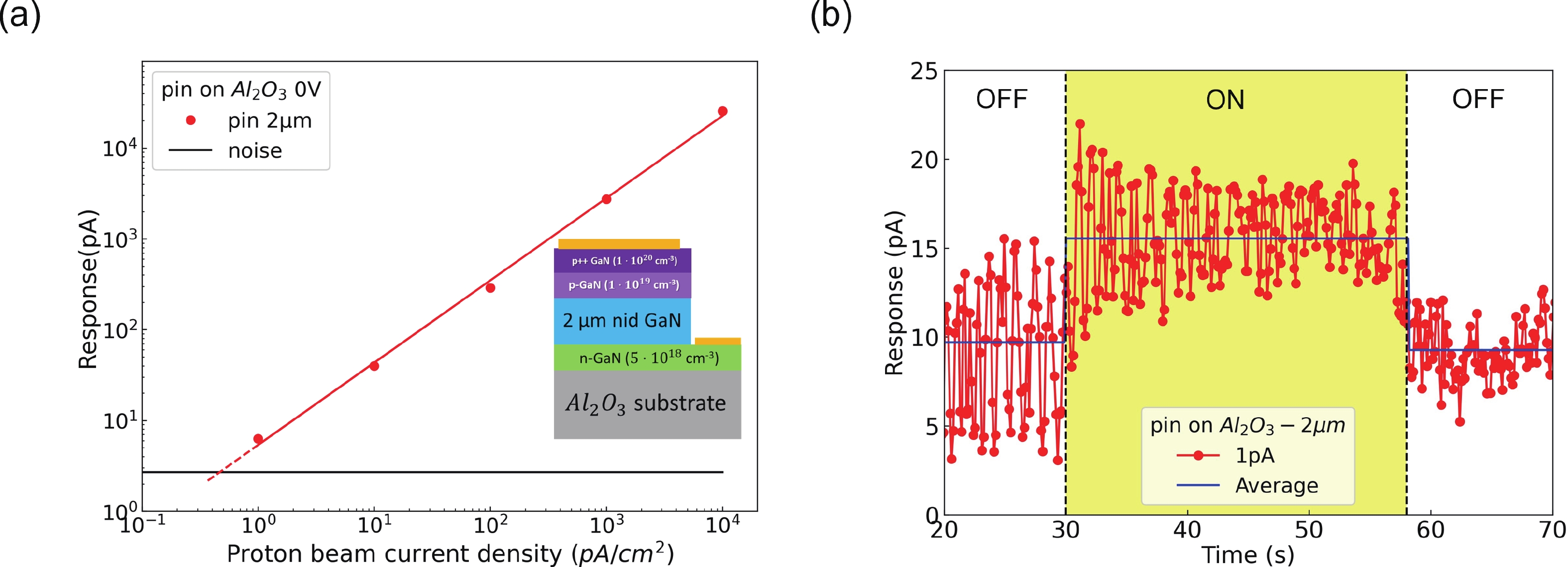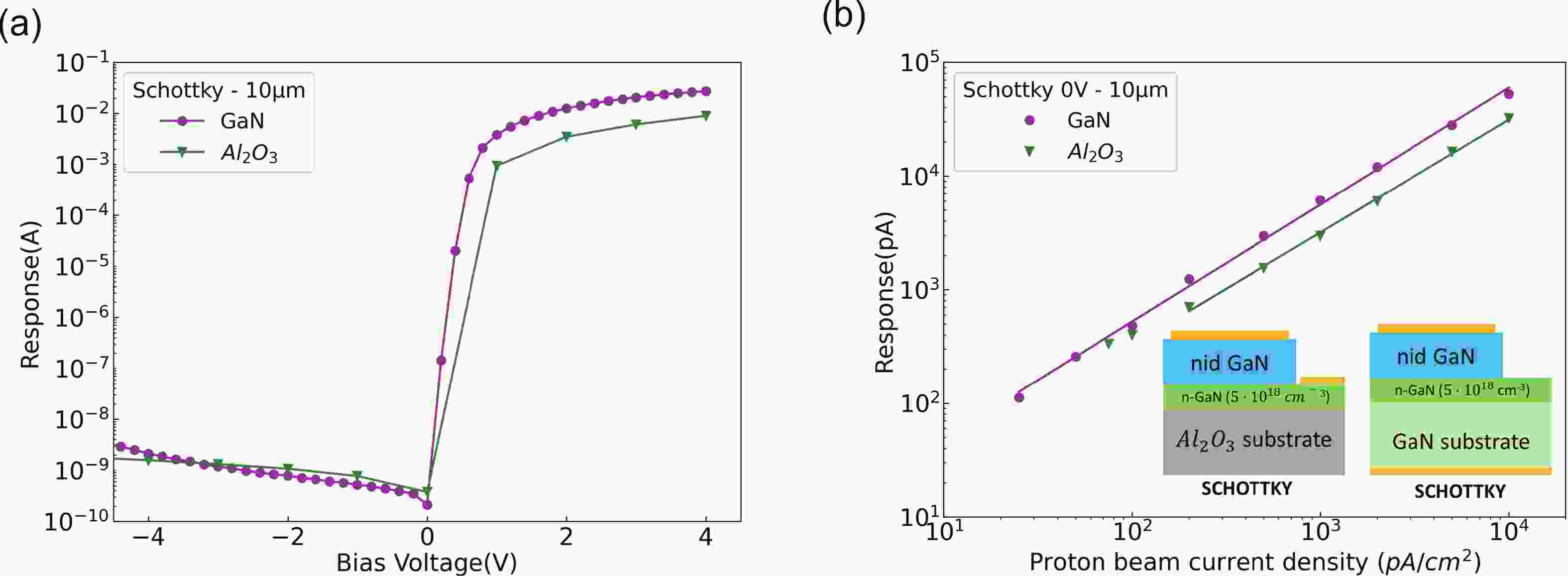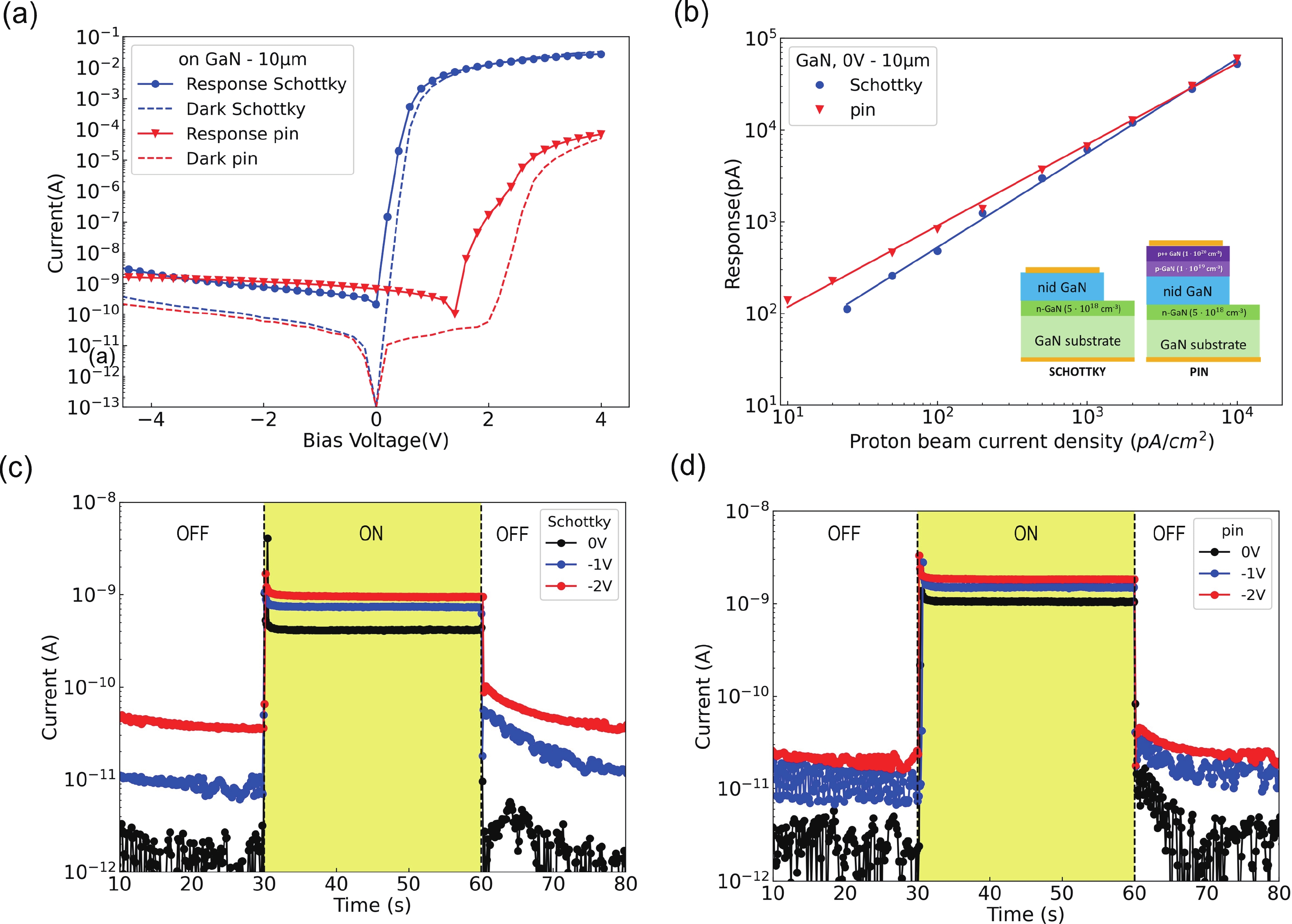 GaN diodes for high energy (64.8 MeV) proton detection were fabricated and investigated. A comparison of the performance of GaN diodes with different structures is presented, with a focus on sapphire and on GaN substrates, Schottky and pin diodes, and different active layer thicknesses. Pin diodes fabricated on a sapphire substrate are the best choice for a GaN proton detector working at 0 V bias. They are sensitive (minimum detectable proton beam <1 pA/cm2), linear as a function of proton current and fast (<1 s). High proton current sensitivity and high spatial resolution of GaN diodes can be exploited in the future for proton imaging of patients in proton therapy.