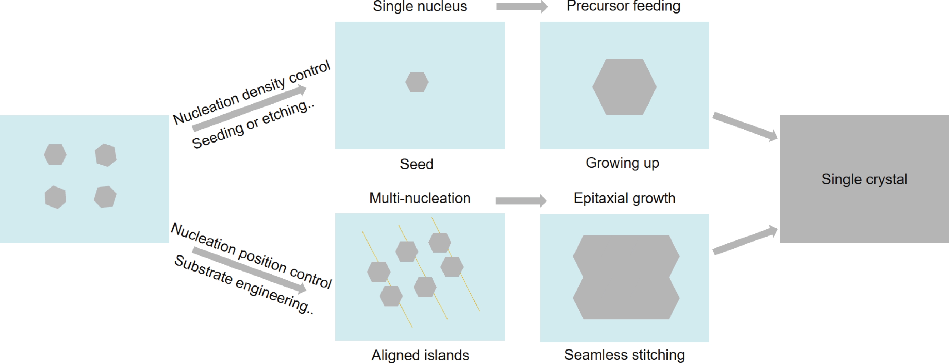 The unique structure and exceptional properties of two-dimensional (2D) materials offer significant potential for transformative advancements in semiconductor industry. Similar to the reliance on wafer-scale single-crystal ingots for silicon-based chips, practical applications of 2D materials at the chip level need large-scale, high-quality production of 2D single crystals. Over the past two decades, the size of 2D single-crystals has been improved to wafer or meter scale, where the nucleation control during the growth process is particularly important. Therefore, it is essential to conduct a comprehensive review of nucleation control to gain fundamental insights into the growth of 2D single-crystal materials. This review mainly focuses on two aspects: controlling nucleation density to enable the growth from a single nucleus, and controlling nucleation position to achieve the unidirectionally aligned islands and subsequent seamless stitching. Finally, we provide an overview and forecast of the strategic pathways for emerging 2D materials.