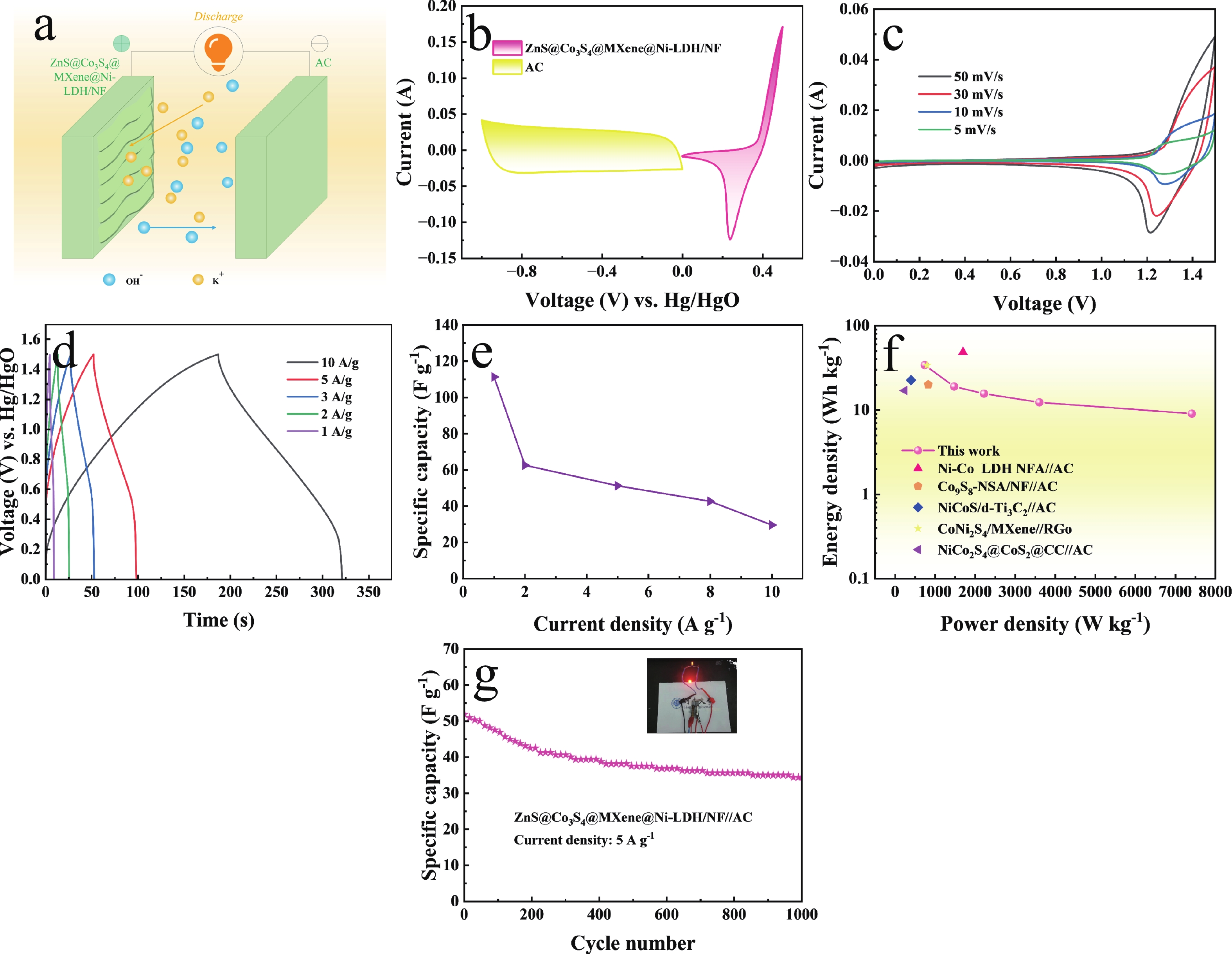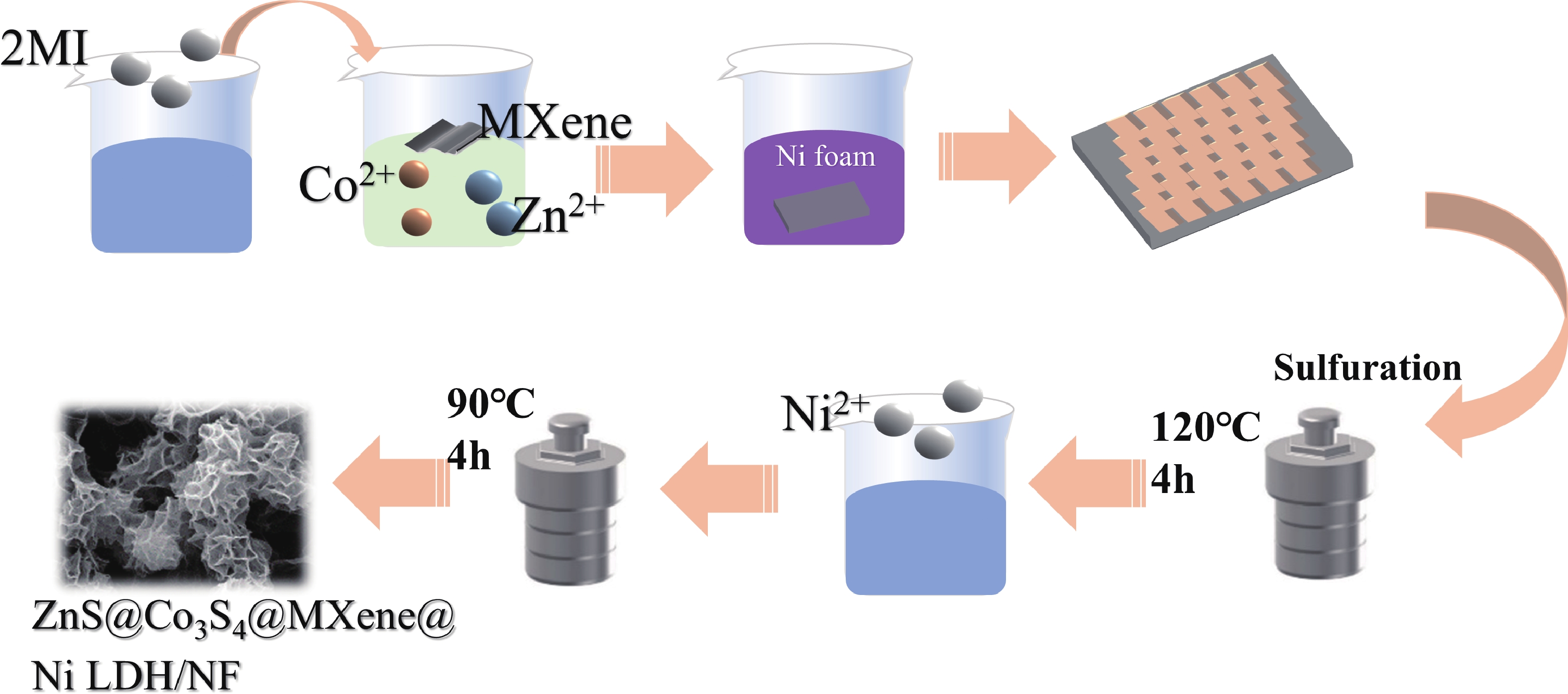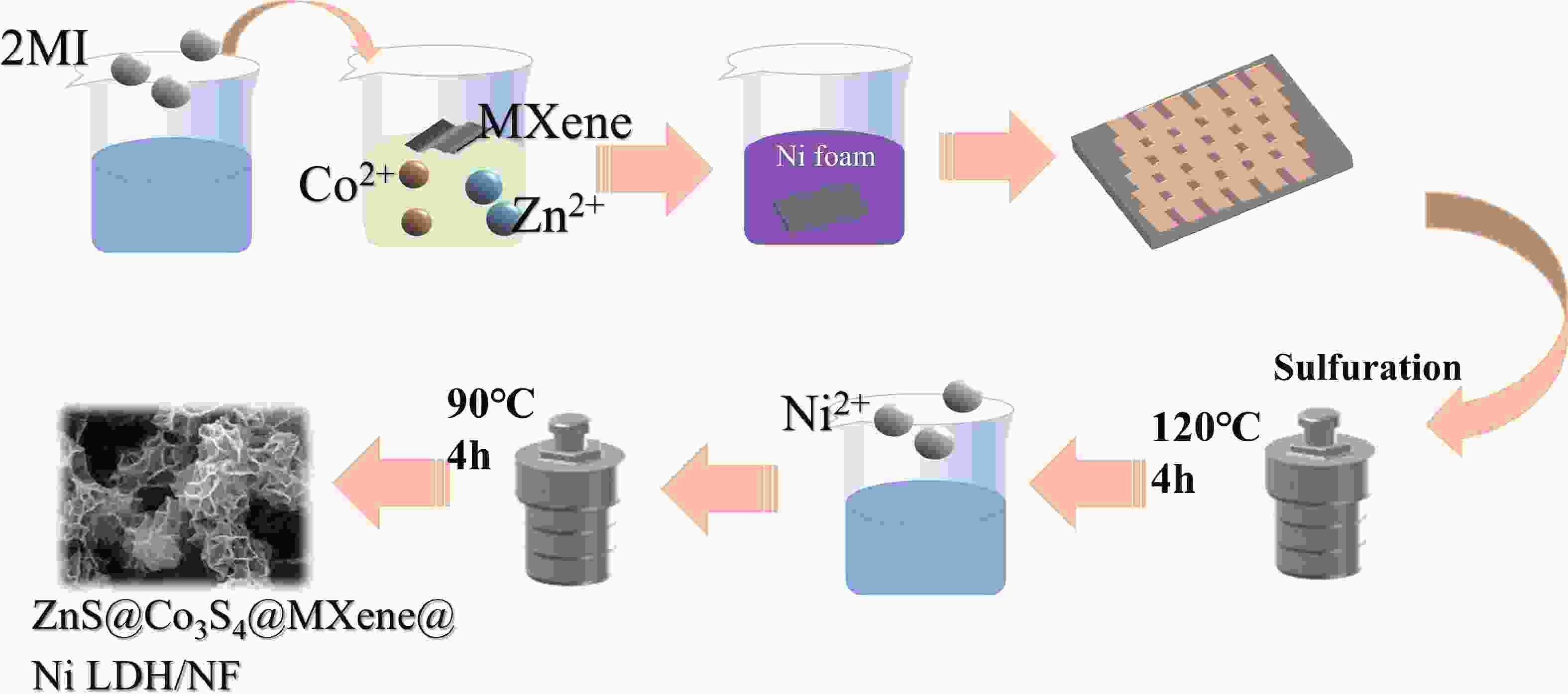 Zeolite imidazolate framework (ZIF)-derived bimetallic sulfides and layered double hydroxides (LDHs) have emerged as promising electrode materials for supercapacitors, owing to their porous layered structures, high electrochemical activity, tunable molecular architectures, low cost, and high specific capacitance. In this study, a unique composite material comprising ZIF-derived ZnCo bimetallic sulfide and LDH with a honeycomb-like structure was in situ grown on nickel foil (NF) via a controlled self-sacrificial template strategy. In contrast to previous reports, the resulting ZnS@Co3S4@MXene@Ni-LDH/NF composite integrates the advantages of MXene, LDH, and sulfides, leading to significantly enhanced conductivity, structural stability, and catalytic activity. The ZnS@Co3S4@MXene@Ni-LDH/NF electrode exhibits a uniform network structure with a thickness of approximately 1 µm coated on NF, and delivers a high specific capacitance of 1356.1 F·g−1 at a current density of 2 A·g−1. Furthermore, an asymmetric supercapacitor assembled with ZnS@Co3S4@MXene@Ni-LDH/NF as the positive electrode and activated carbon as the negative electrode achieves a high energy density of 34.08 Wh·kg−1 and a power density of 742.3 W·kg−1 at 1 A·g−1. This device successfully powers LED lights for 5 min, demonstrating its practical applicability. These results underscore the outstanding electrochemical performance of the ZnS@Co3S4@MXene@Ni-LDH/NF electrode, highlighting its potential for applications in supercapacitors and related energy storage fields.
