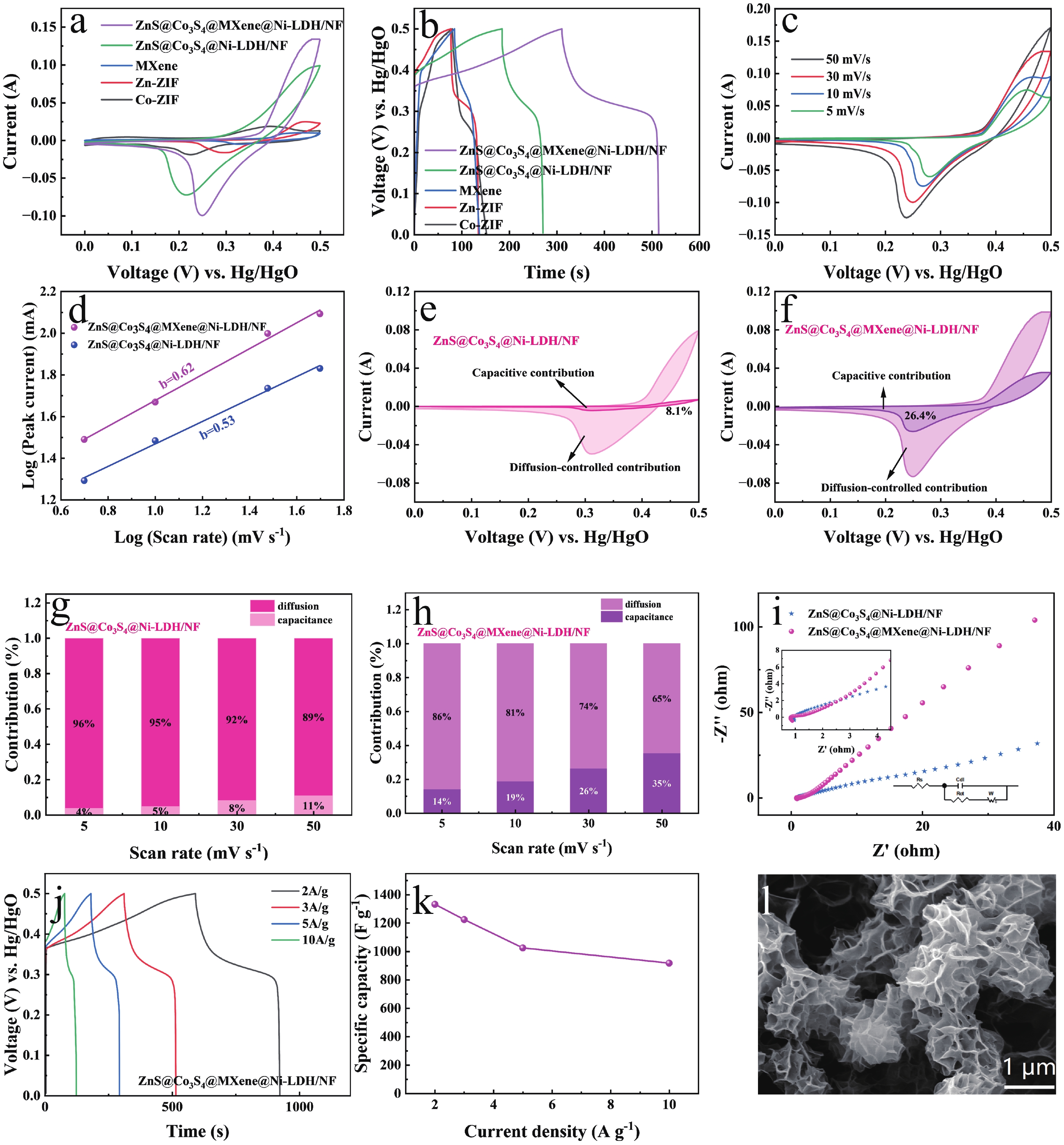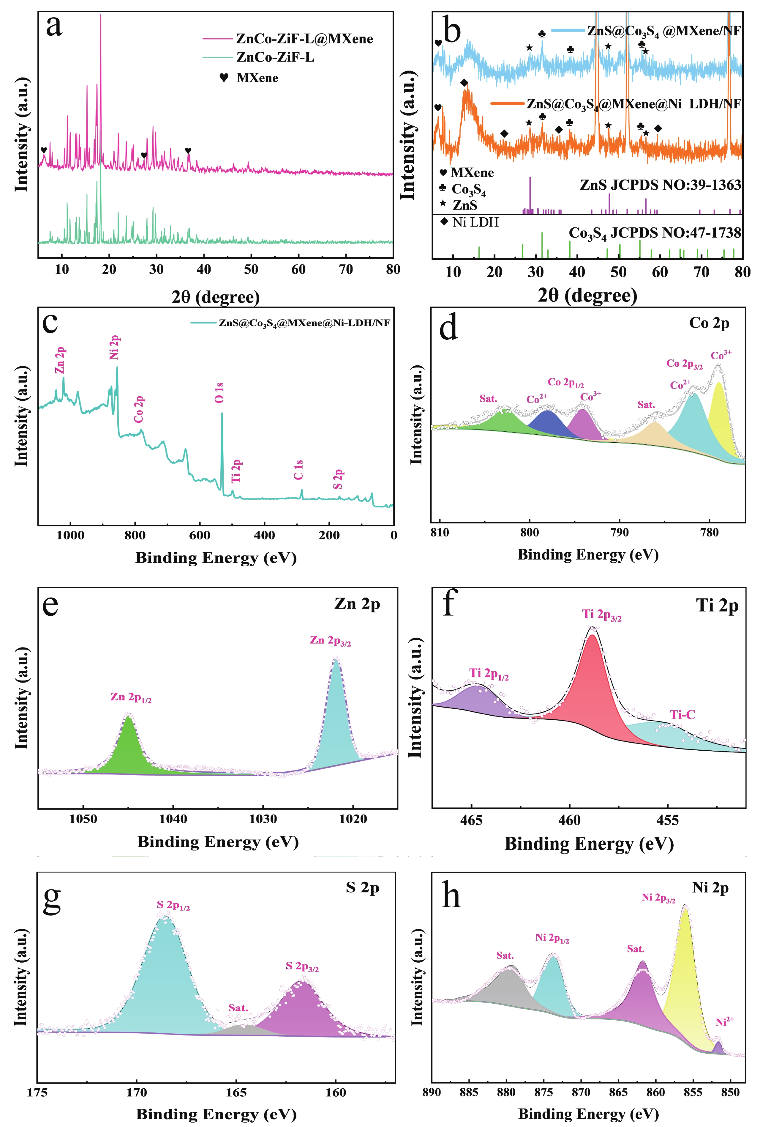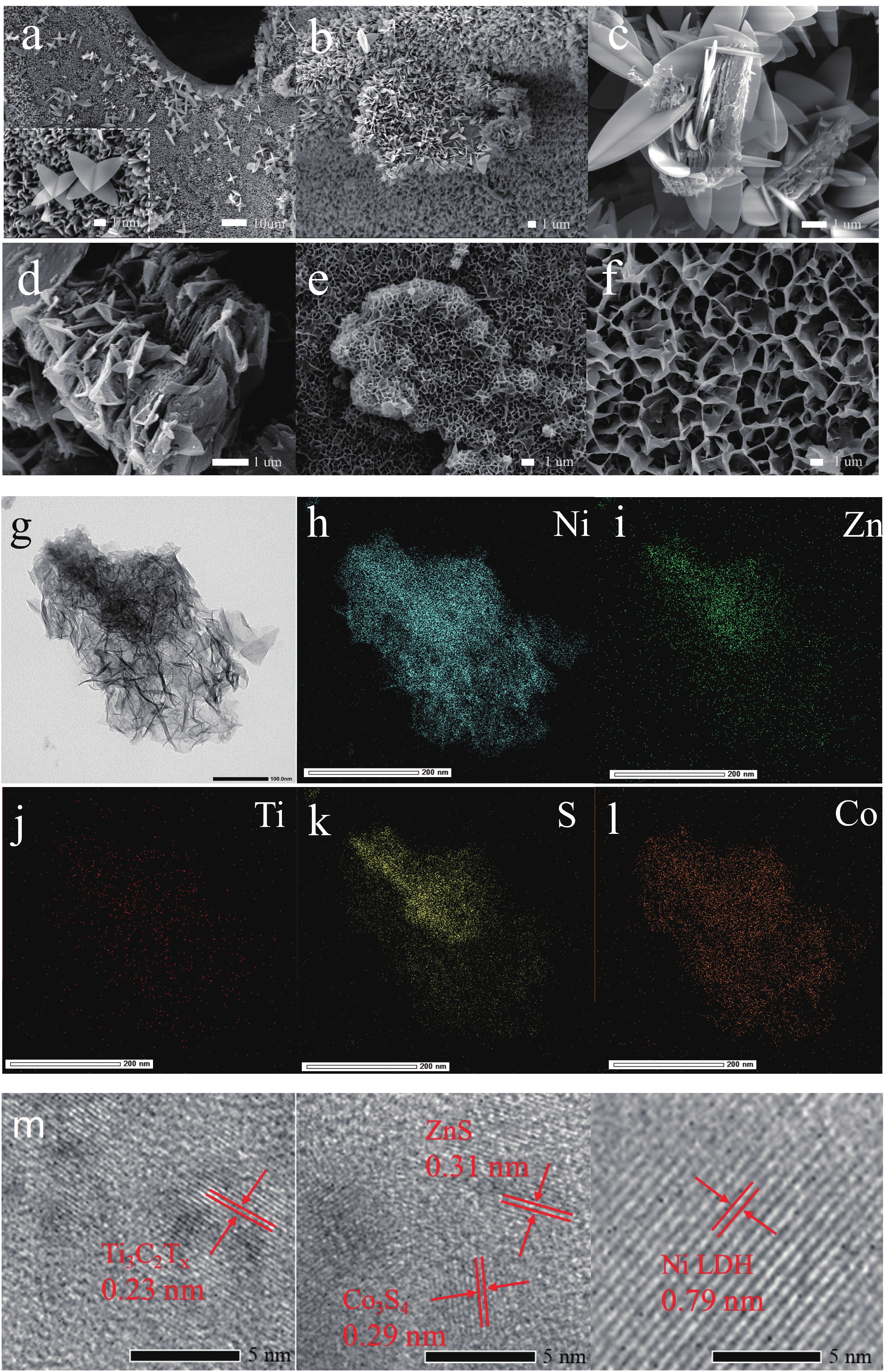 Zeolite imidazolate framework (ZIF)-derived bimetallic sulfides and layered double hydroxides (LDHs) have emerged as promising electrode materials for supercapacitors, owing to their porous layered structures, high electrochemical activity, tunable molecular architectures, low cost, and high specific capacitance. In this study, a unique composite material comprising ZIF-derived ZnCo bimetallic sulfide and LDH with a honeycomb-like structure was in situ grown on nickel foil (NF) via a controlled self-sacrificial template strategy. In contrast to previous reports, the resulting ZnS@Co3S4@MXene@Ni-LDH/NF composite integrates the advantages of MXene, LDH, and sulfides, leading to significantly enhanced conductivity, structural stability, and catalytic activity. The ZnS@Co3S4@MXene@Ni-LDH/NF electrode exhibits a uniform network structure with a thickness of approximately 1 µm coated on NF, and delivers a high specific capacitance of 1356.1 F·g−1 at a current density of 2 A·g−1. Furthermore, an asymmetric supercapacitor assembled with ZnS@Co3S4@MXene@Ni-LDH/NF as the positive electrode and activated carbon as the negative electrode achieves a high energy density of 34.08 Wh·kg−1 and a power density of 742.3 W·kg−1 at 1 A·g−1. This device successfully powers LED lights for 5 min, demonstrating its practical applicability. These results underscore the outstanding electrochemical performance of the ZnS@Co3S4@MXene@Ni-LDH/NF electrode, highlighting its potential for applications in supercapacitors and related energy storage fields.