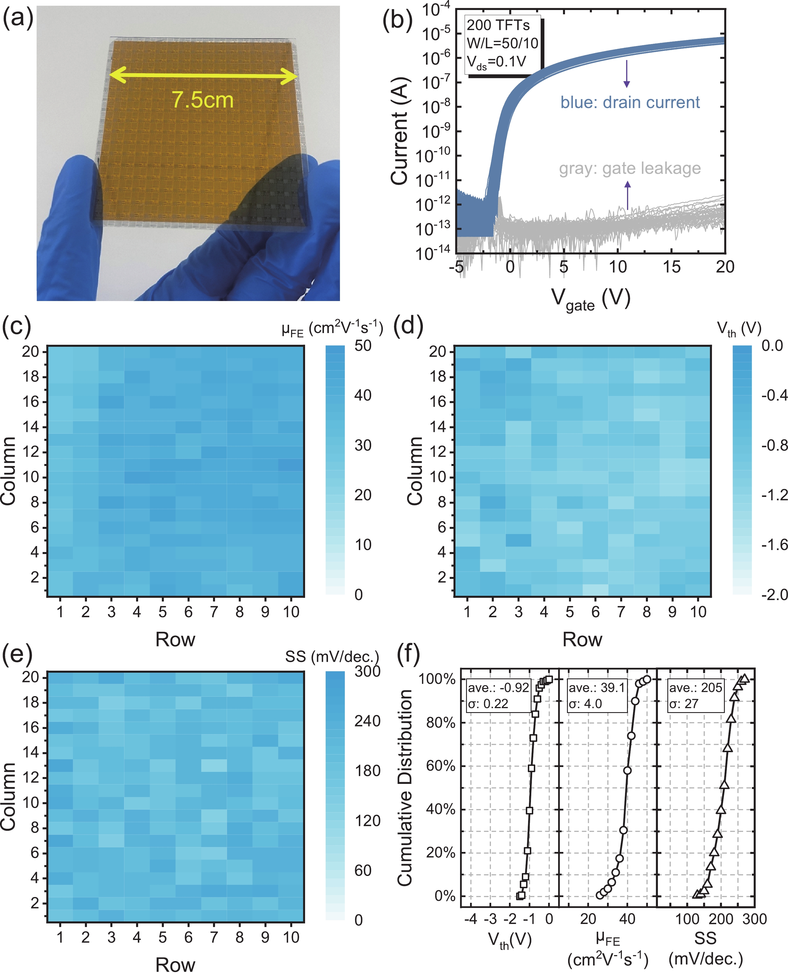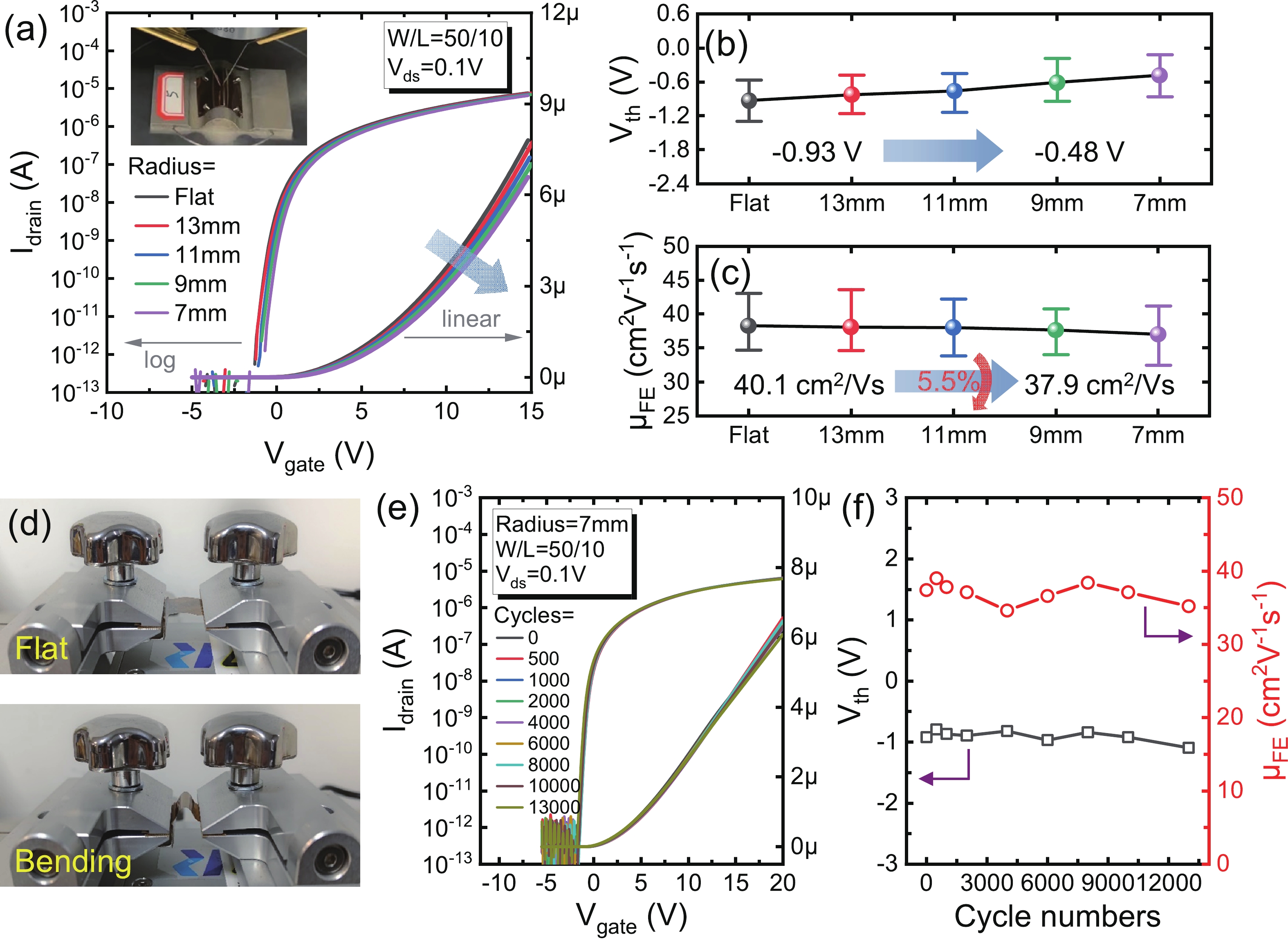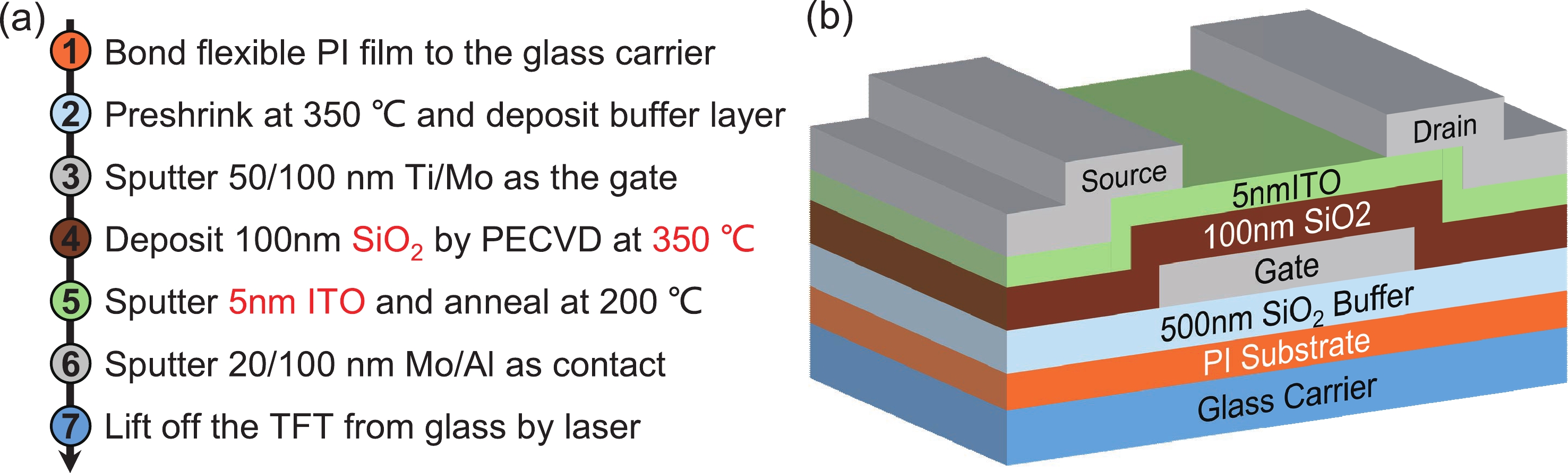 The increasing pursuit of ultra-high resolution displays has driven the demand for thin film transistors (TFTs) with higher mobility, especially on flexible substrates. In this work, we developed indium tin oxide (ITO) TFTs on flexible substrates for the first time and achieved a remarkable average mobility of 39.1 cm2·V−1·s−1, via mass-production compatible processes utilizing SiO2 gate dielectric. Benefiting from the ultra-flat surface and extremely low coefficient of thermal expansion (CTE) of our PI substrate, the ITO TFTs exhibit excellent large-scale uniformity. Additionally, the TFTs generate minor variations of −5.5% and +0.45 V in mobility and threshold voltage under a bending radius of 7 mm, respectively. They stay fully functional even after a dynamic bending test up to 13 000 cycles, observing no obvious degradation in mobility and threshold voltage. The reliable mechanical flexibility and robust bending durability demonstrate their great potential for ultra-high resolution flexible displays in the future.