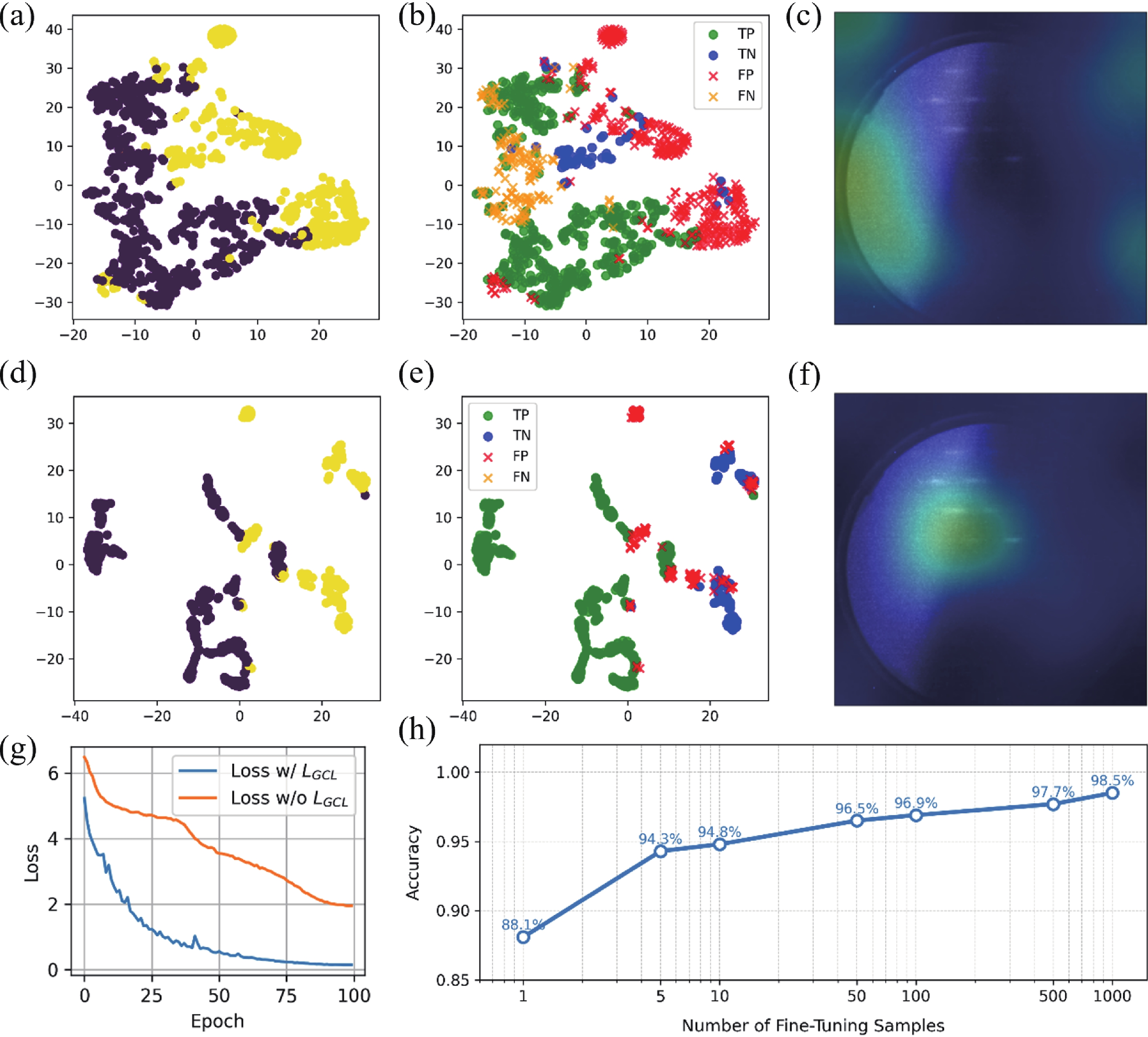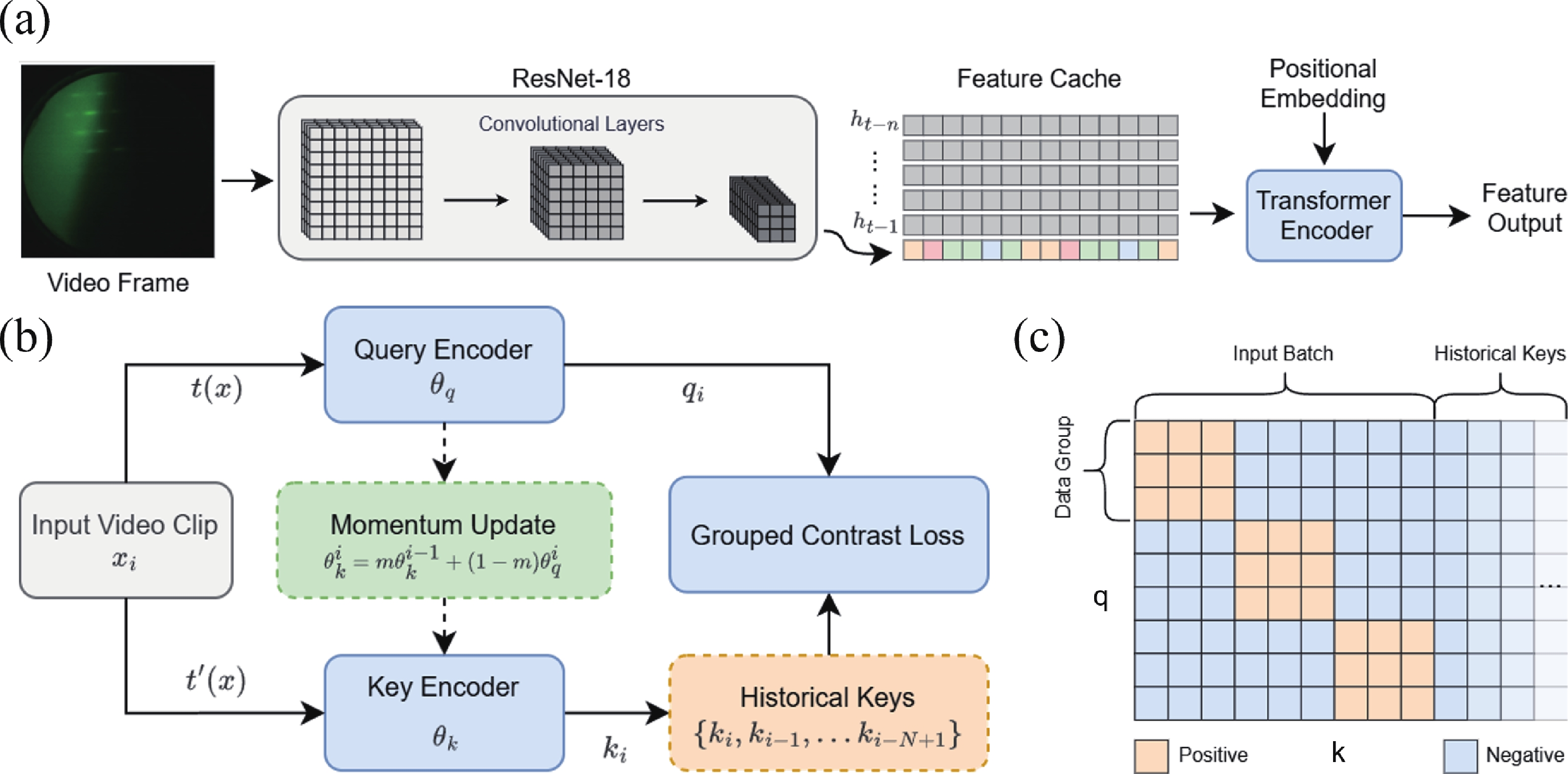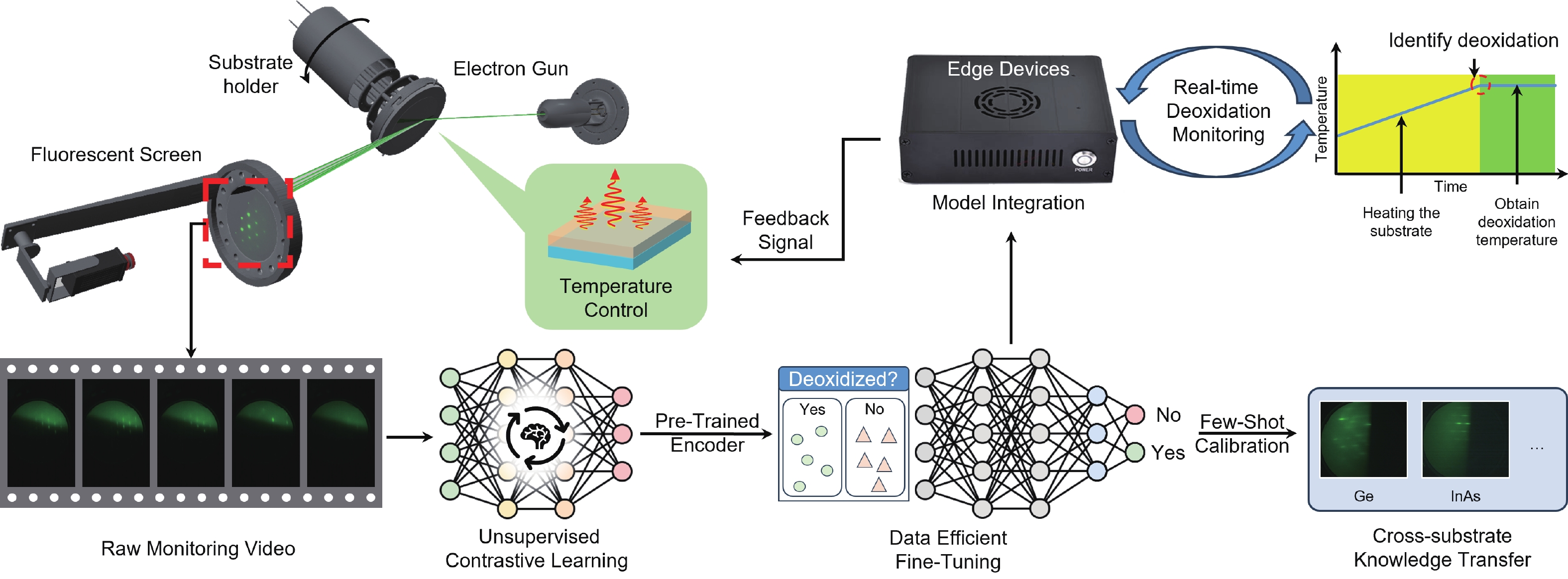 Accurate temperature control and effective oxide removal are essential for achieving high-quality epitaxial growth in molecular beam epitaxy (MBE). However, traditional methods often rely on manual identification of reflection high-energy electron diffraction (RHEED) patterns. This process is heavily influenced by the grower’s experience, leading to issues with reproducibility and limiting the potential for automation. In this report, we propose an unsupervised learning framework for real-time RHEED analysis during the deoxidation process. By incorporating temporal similarity constraints into contrastive learning, our model generates smooth and interpretable feature trajectories that illustrate transitions in the deoxidation state, thus eliminating the need for manual labeling. The model, pre-trained using grouped contrastive loss, shows significant improvement in RHEED feature boundary discrimination and localization of critical regions. We evaluated its generalizability through two transfer learning strategies: calibration-free clustering and few-shot fine-tuning. The pre-trained model achieved a clustering accuracy of 88.1% for GaAs deoxidation samples without additional labels and reached an accuracy of 94.3% to 95.5% after fine-tuning with just five sample pairs across GaAs, Ge, and InAs substrates. This framework is optimized for resource-constrained edge devices, allowing for real-time, plug-and-play integration with existing MBE systems and swift adaptation across various materials and equipment. This work paves the way for greater automation and improved reproducibility in semiconductor manufacturing.