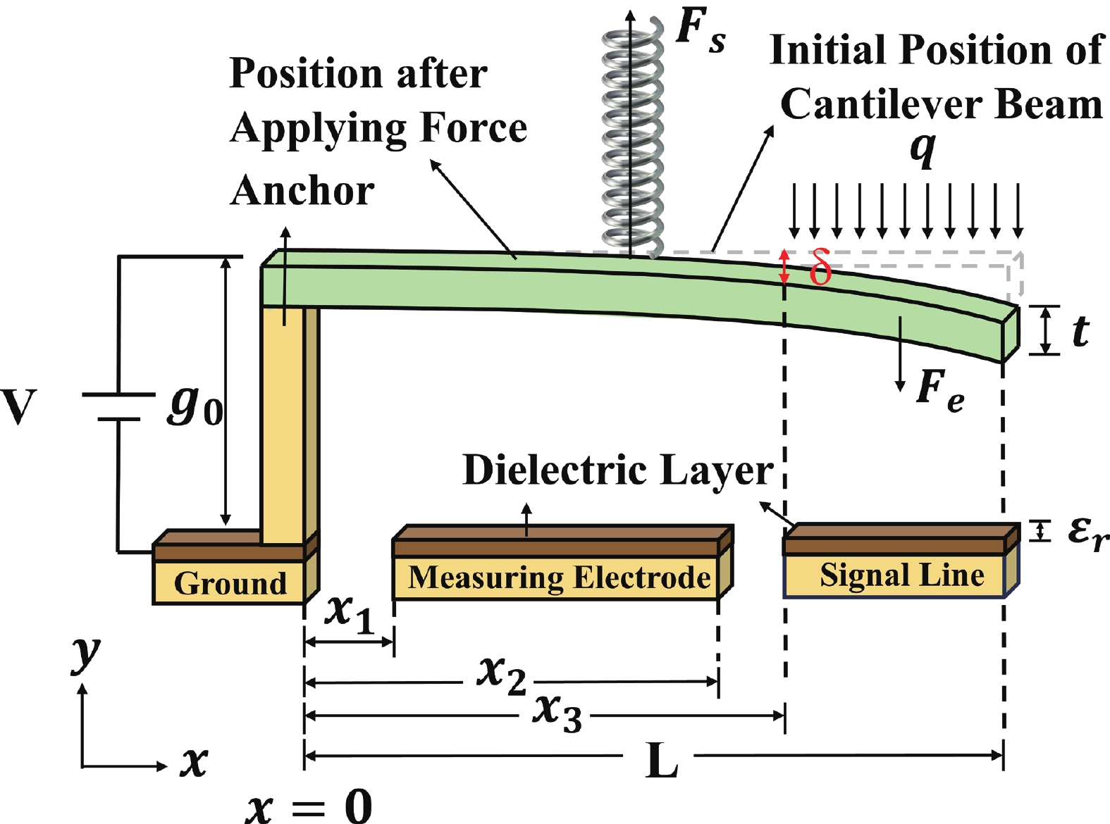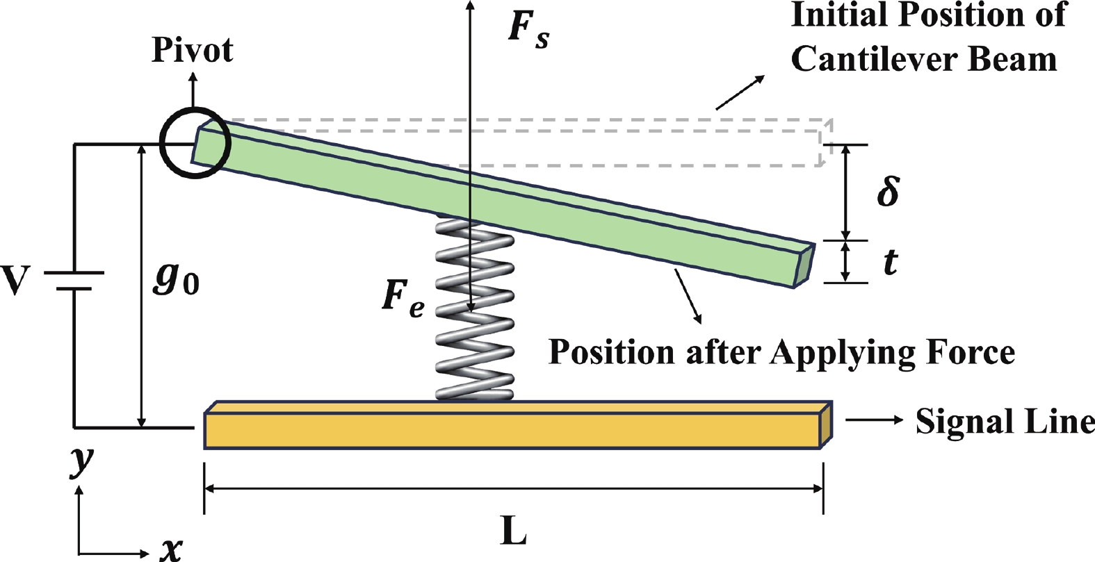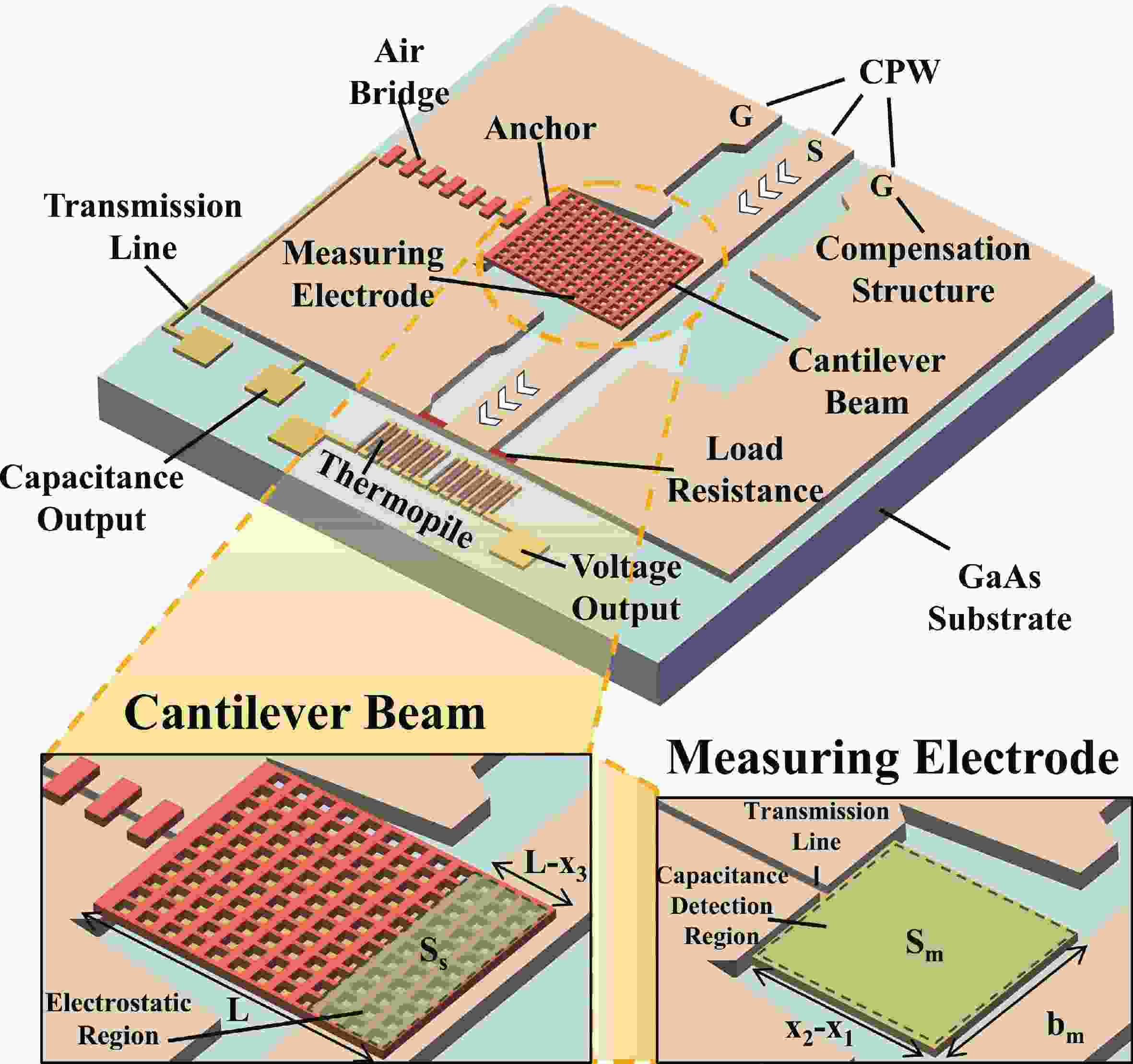 To improve the theoretical prediction accuracy of static mechanical quantities in MEMS cantilever beams for microwave power detection chips, a distributed static model is proposed based on the deflection equation. An analytical framework is established through the precise characterization of cantilever beam bending. The framework can accurately extract key electromechanical parameters, and the correlation between these parameters and geometric changes is systematically studied. Results show that the pull-in voltage increases with the gap but decreases with the length. The predicted pull-in voltage indicates a relative error of only 6.5% between the distributed static model and the simulation, which is significantly lower than that of the other two models. The overload power and sensitivity are also analyzed to facilitate performance trade-offs in chip design. The measured return loss varies between −66.46 and −10.56 dB over the 8−12 GHz frequency band, exhibiting a characteristic V-shaped trend. Moreover, the measured sensitivity of 66.5 fF/W closely matches the theoretical value of 69.3 fF/W, showing a relative error of 5.6%. These findings confirm that the distributed model outperforms the other two in terms of both accuracy and physical realism, thereby providing important reference for the design of microwave power detection chips.
