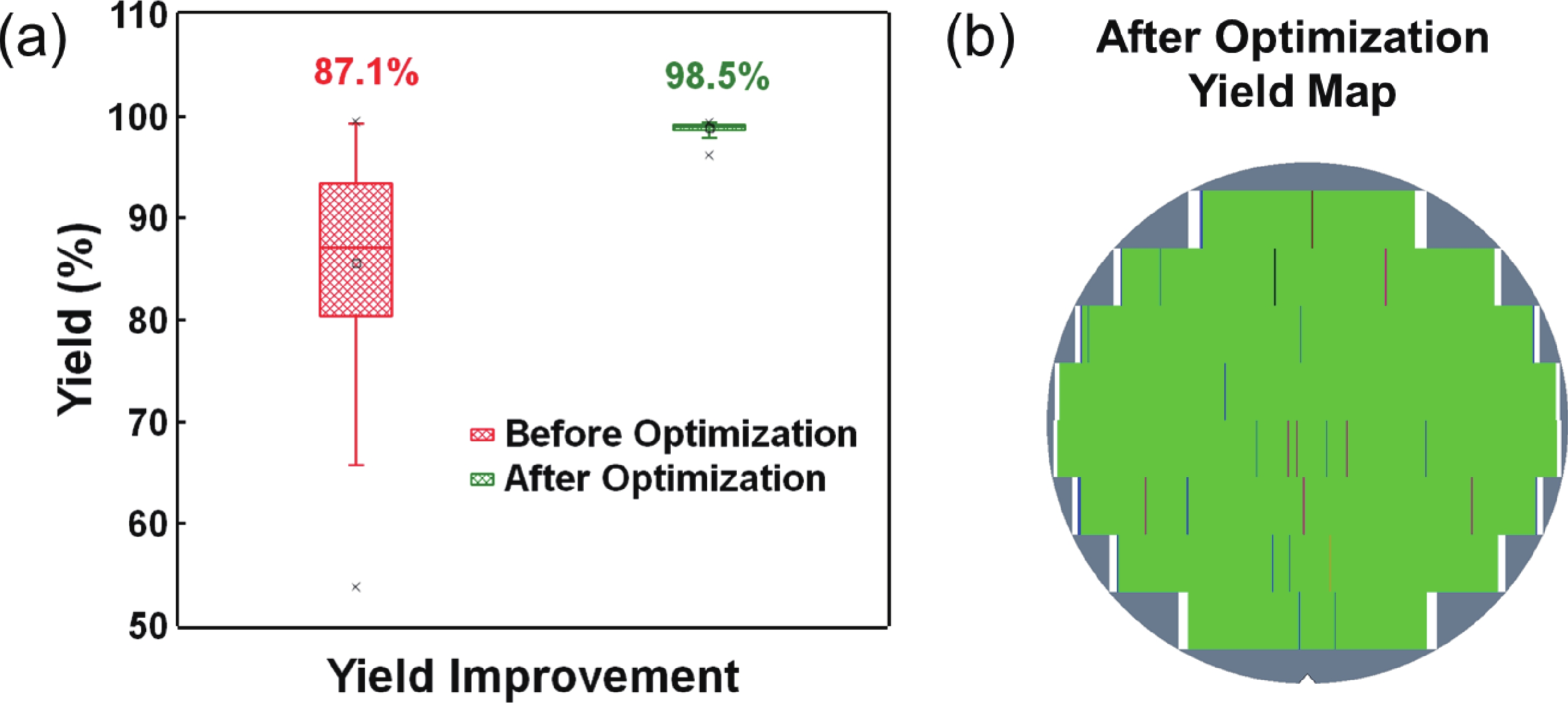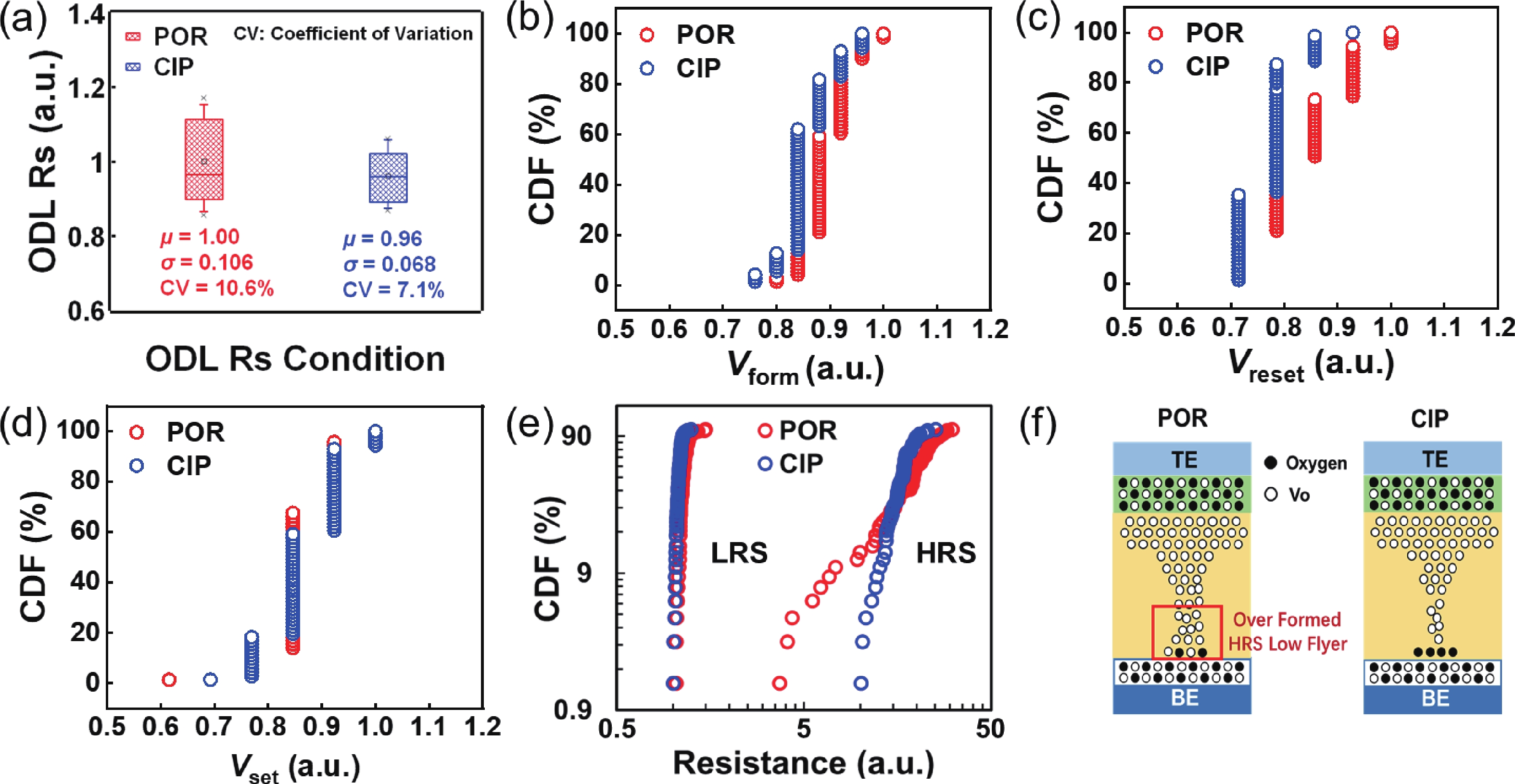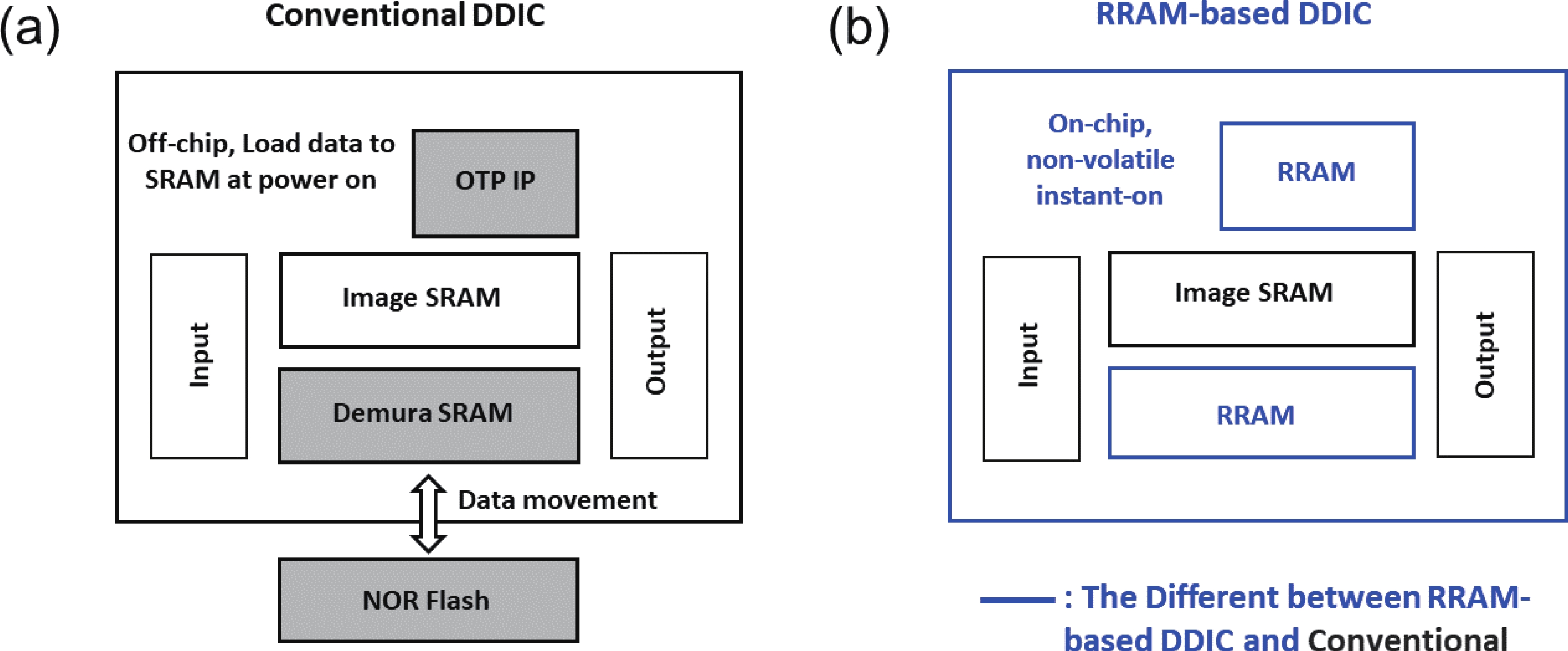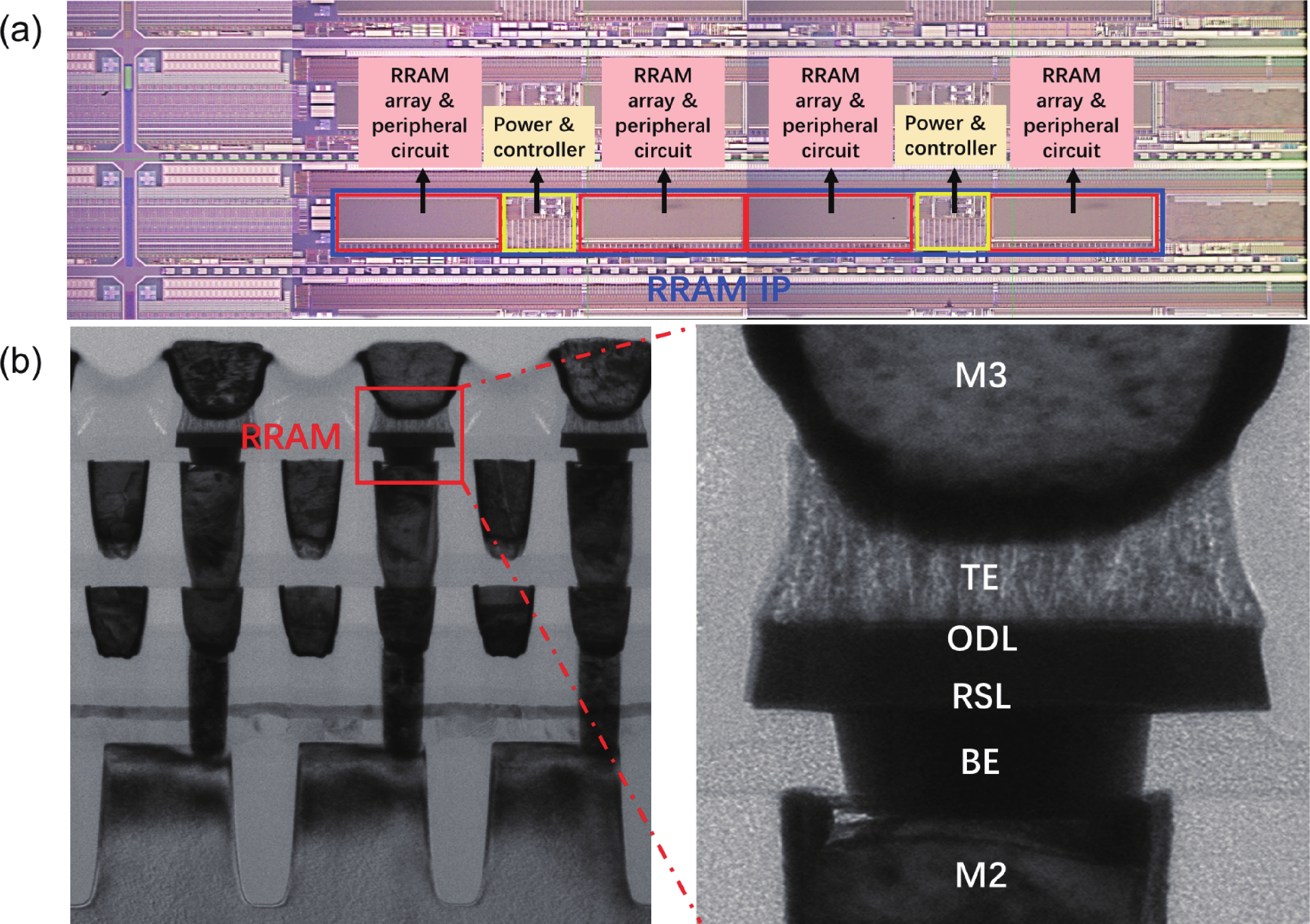 To address the challenges of complexity, power consumption, and cost constraints in traditional display driver integrated circuits (DDICs) caused by external NOR Flash and SRAM, this work proposes an embedded resistive random-access memory (RRAM) integration solution based on a 40 nm high-voltage CMOS logic platform. Targeting the yield fluctuations and stability challenges during RRAM mass production, systematic process optimizations are implemented to achieve synergistic improvements in RRAM performance and yield. Through modifications to the film sputtering and pre-deposition treatment, the within-wafer resistance uniformity (RSU) of the oxygen-deficient layer (ODL) thin film is improved from 11% to 8%, while inter-wafer process stability variation reduces from 23% to below 6%. Consequently, the yield of 8 Mb RRAM embedded mass production products increases from 87% to 98.5%. In terms of device performance, the RRAM demonstrates a fast 4.8 ns read speed, exceptional read disturb immunity of 3 × 108 cycles at 95 °C, 103 write/erase endurance cycles for the 1 Mb cells, and data retention of 12.5 years at 125 °C. Post high-temperature operating life (HTOL) testing exhibits stable high/low resistance window. This study provides process optimization strategies and a reliability assurance framework for the mass production of highly integrated, low-power embedded RRAM display driver IC.