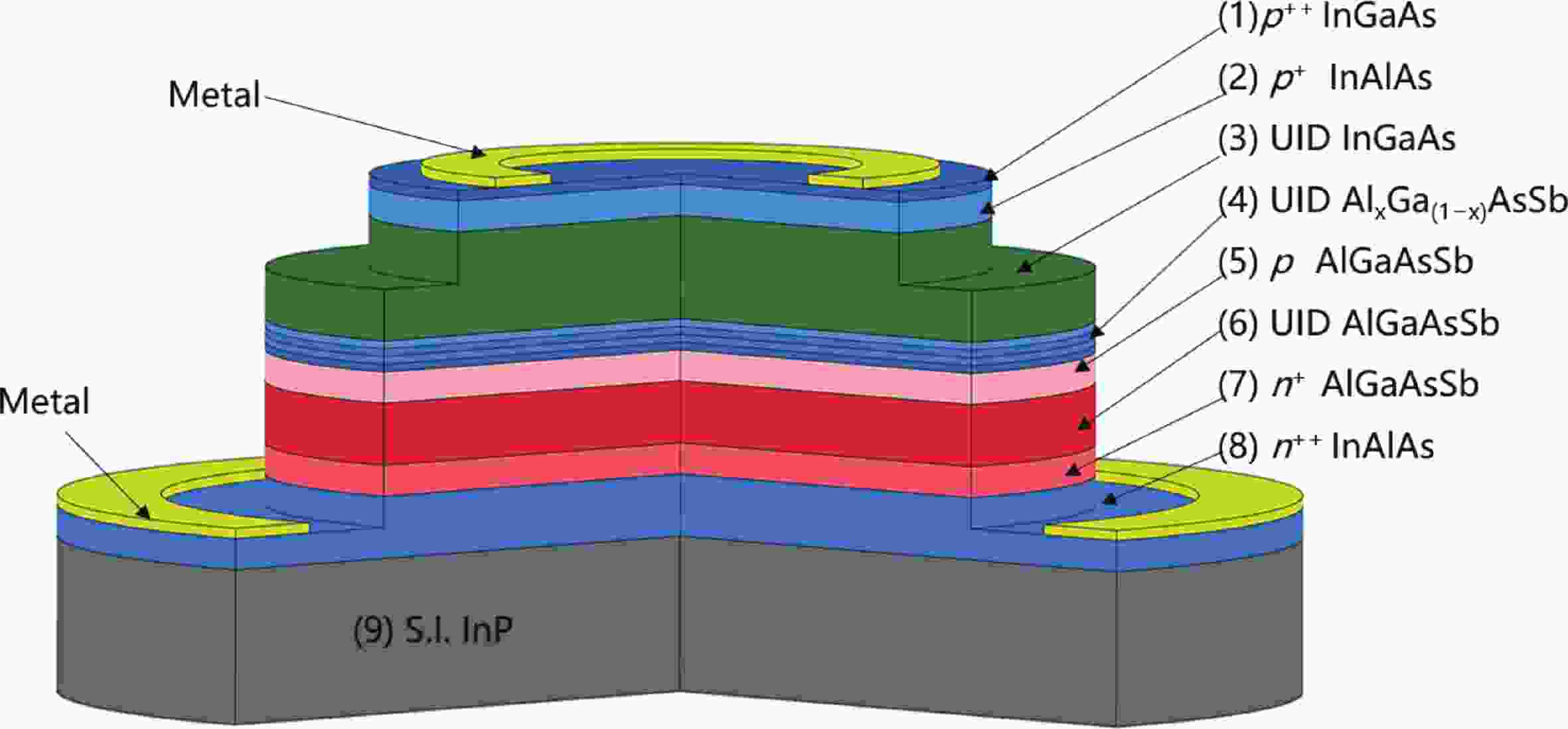 Avalanche photodiode (APD) is a kind of photodetector with important applications in optical communication, light detection and ranging (LIDAR) and other fields. APDs fabricated using the recently developed AlGaAsSb as the multiplication material exhibit excellent noise performance. In this work, we report a low-noise separate absorption, grading, charge, and multiplication (SAGCM) InGaAs/AlGaAsSb APD operating at 1550 nm. A double-mesa structure was fabricated to reduce the dark current. Numerical simulations were conducted to compare two different mesa-structured APDs. By analyzing the electric field distribution, it was found that the electric field at the edge of the multiplication region in the double-mesa APD is nearly 100 kV/cm lower than that of the single-mesa structure. Experimental results demonstrate that after device punch-through, the double-mesa APD’s dark current can be reduced by up to four times compared to the single-mesa APD. Quantitative analysis of the dark current components in the AlGaAsSb APD further confirms that the low sidewall electric field in the double-mesa structure effectively suppresses the trap-assisted tunneling. Additionally, noise measurements indicate a k-value of approximately 0.014, which is significantly lower than that of traditional multiplication materials. This work provides preliminary validation for further performance improvements in low noise and low dark current AlGaAsSb APDs.