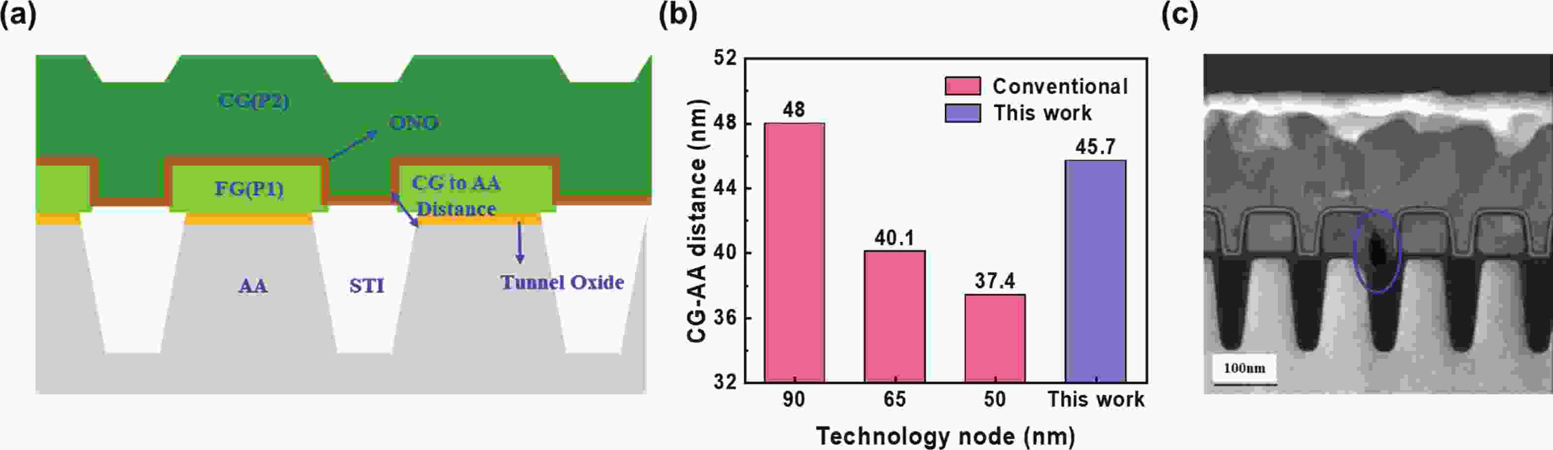 Along with NOR flash cell scaling down, dielectric burnout has gradually become one of the most important factors which affects product reliability, especially for high dropout voltage films. In this study, we demonstrate a reliability-enhanced NOR flash cell in 50 nm node technology through structural optimization of floating gate (FG) dimensions and active area profile. By synergistically increasing FG thickness, reducing FG width, and tuning cell-open depth, the control gate-to-active area corner distance expands by 22%, suppressing peak electric fields by 29% vertically and 18% horizontally. This structural innovation achieves: (1) 100× reduction in early-cycle burnout failures, (2) 7.38× time dependent dielectric breakdown lifetime improvement, while maintaining data retention and accelerating programming/erasing speeds by 15.4%/7.3%. The enhanced reliability enables 97.5% reduction in Fowler−Nordheim stress time during characterization program testing, providing a cost-effective solution for automotive-grade flash memories.