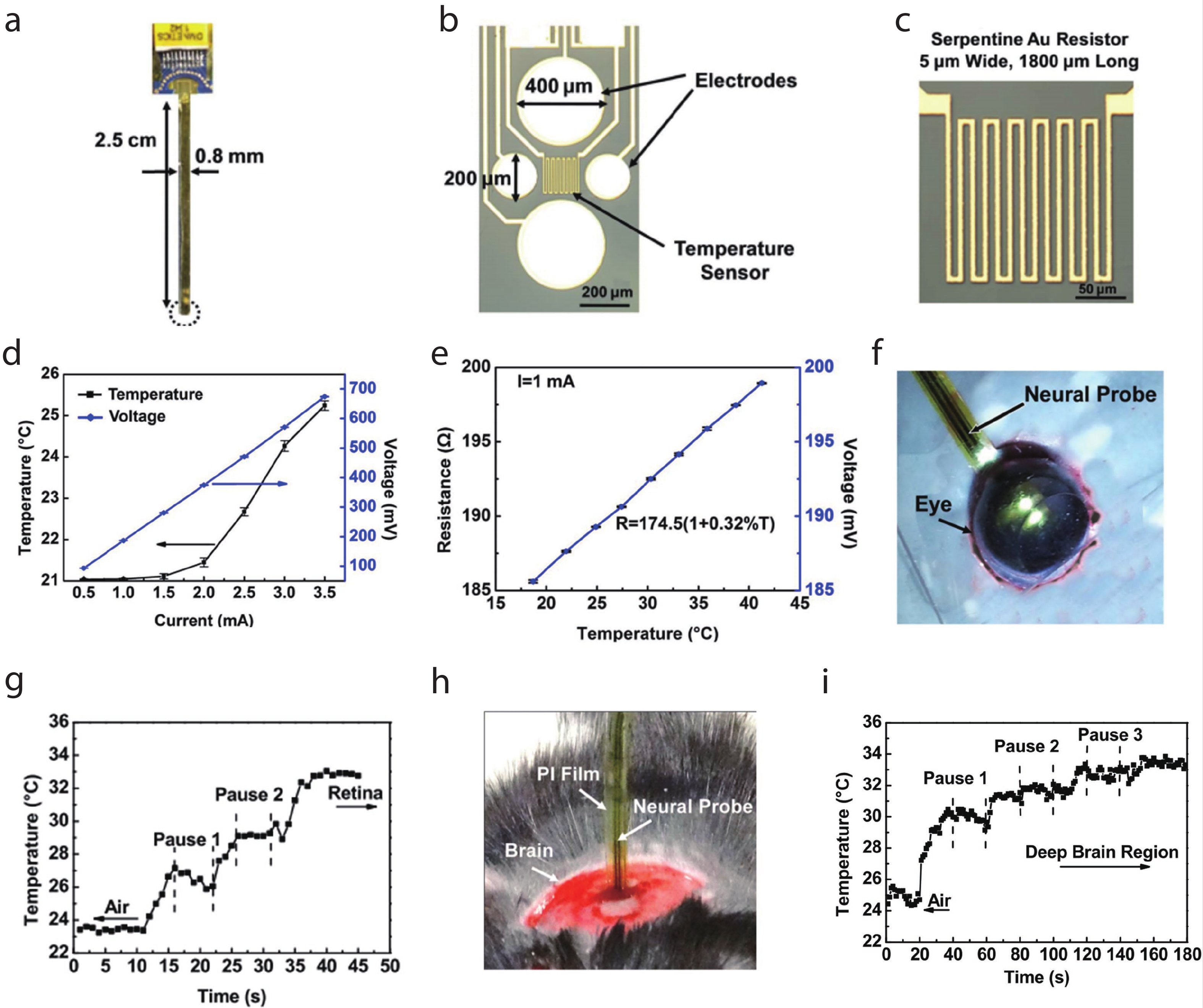 Fig. 1.  (Color online) Implantable, biocompatible Au resistive temperature sensors. (a) A flexible implantable neural probe on a polyimide (PI) substrate, attached to printed circuit boards (PCBs) with connectors. (b) A detailed view of the probe tip, containing electrodes and temperature sensors. (c) Temperature sensor made of a serpentine gold wire 5 μm wide and 1800 μm long. (d) The temperature and voltage responses of the temperature sensor when a 1 mA current is applied. (e) The resistive temperature sensor exhibits a linear relationship between resistance and voltage under a 1 mA current, with a temperature coefficient of 0.32%. (f) Optical image of the neural probe implanted in the retina, monitoring temperature changes during insertion. (g) Temperature changes during probe implantation in the retina. (h) Optical image of the neural probe implanted in the deep brain region. (i) Temperature changes during probe implantation were monitored in the deep brain. Reproduced with permission from Ref. [25]. Copyright (2017) IEEE.