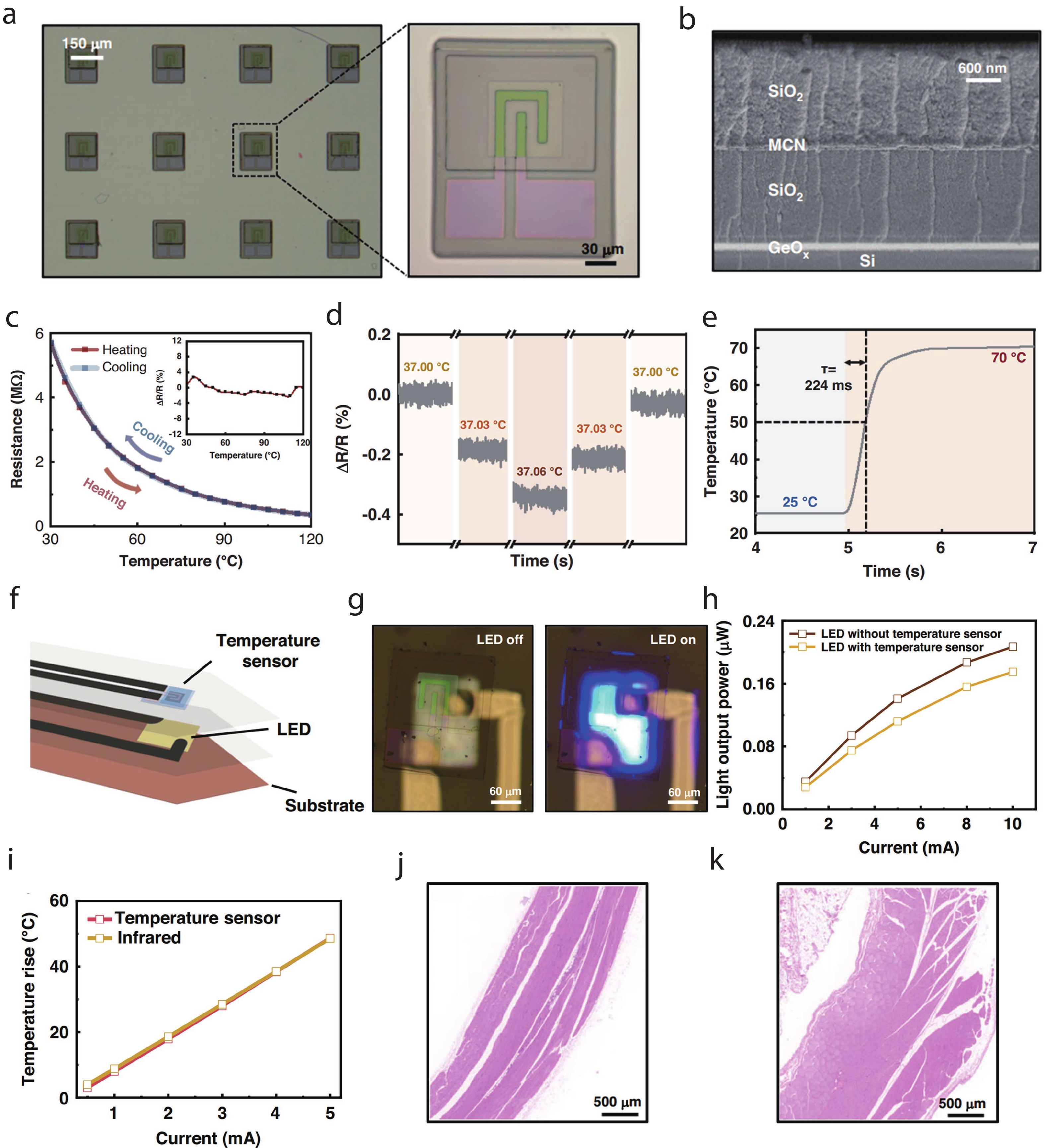 Fig. 3.  (Color online) Implantable, biocompatible, transparent temperature sensor based on a Mn–Co–Ni–O nanofilm. (a) Optical image of the Mn–Co–Ni–O nanofilm temperature sensors on a Si substrate. (b) Scanning electron microscopy (SEM) image of a sandwich-structured thin-film temperature sensor on a Si substrate with a total thickness of approximately 4.1 µm. (c) Resistance variation with temperature for the Mn–Co–Ni–O (MCN) transparent temperature sensor. (d) Resolution test for the freestanding MCN transparent temperature sensor, demonstrating the ability to detect a small temperature change of 0.03 °C. (e) Response time of the MCN transparent temperature sensor is 224 ms when transitioning from 25 to 70 °C. (f) Schematic illustrations of the microscale LED probe integrated with the MCN transparent temperature sensor. (g) Optical image of the microscale LED probe integrated with the MCN transparent temperature sensor, showing blue light from the LED penetrating through the sensor. (h) Luminous power of LEDs with and without integrated temperature sensors as a function of input current. (i) Measurement of the increase in temperature of the LED surface under different injection currents by the MCN transparent temperature sensor and an infrared camera. (j) Hematoxylin and eosin (H&E)-stained histological section image of the control group, showing the back region of a rat without implantation. (k) Histological section image of the tissue surrounding the sensor after 21 days of implantation in the back region of a rat. Reproduced with permission from Ref. [38]. Copyright (2024) Nature Publishing Group.