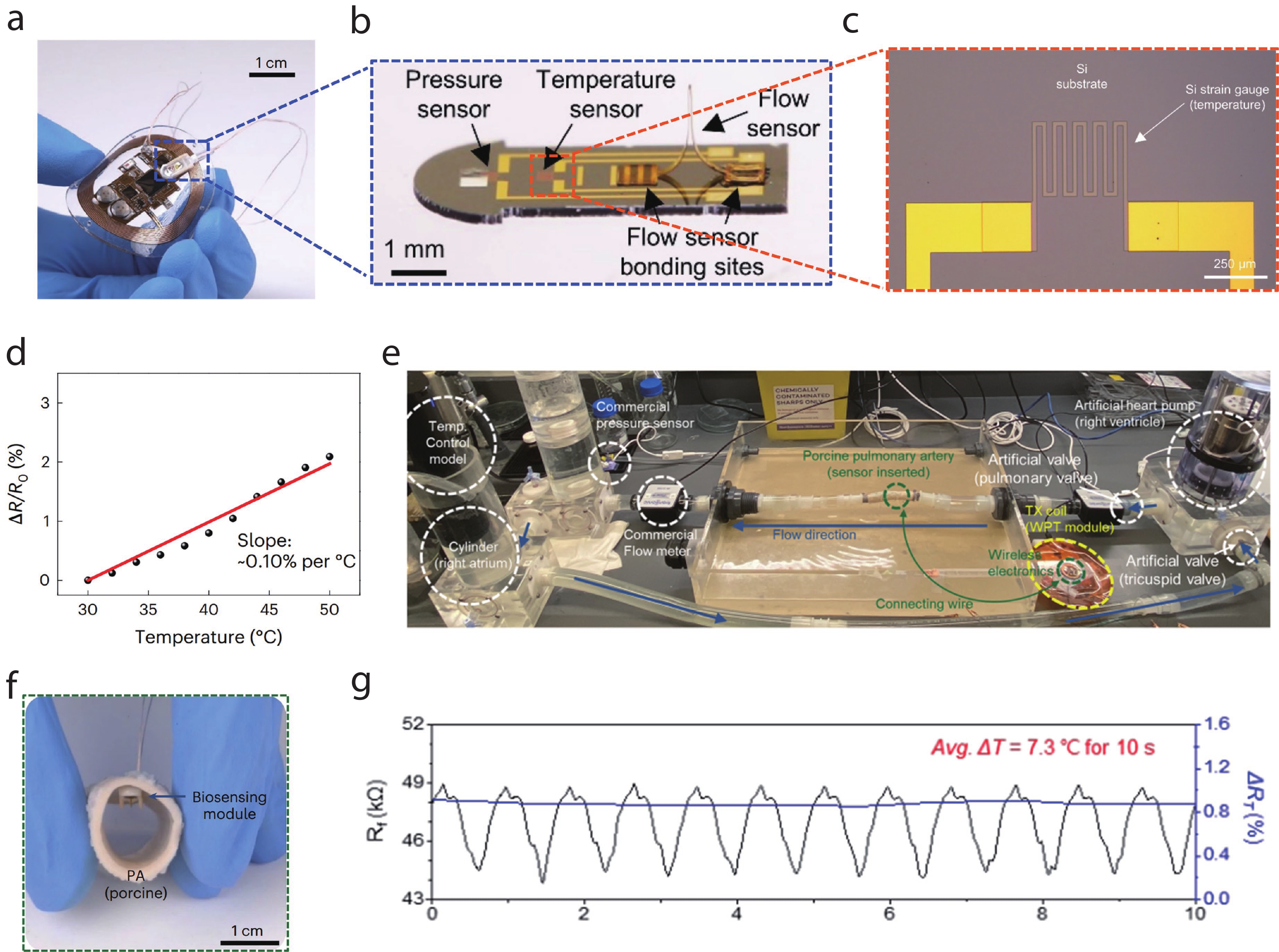 Fig. 4.  (Color online) Biocompatible, battery-less wireless implantable temperature sensor based on silicon nanomembrane (Si-NM). (a) Optical image of the soft, flexible wireless electronics module interconnected with the biosensing module via insulated, flexible fine wires (blue dotted box). (b) Optical images of biosensing modules with pressure, temperature, and flow sensors. (c) Silicon serpentine strain gauges on a flat substrate for temperature monitoring. (d) Measured resistance change (∆R/R0) response of approximately 0.10% °C–1 in the temperature sensor when exposed to temperature changes from 30 to 50 °C. (e) Optical image of the artificial heart system, including two cylinders with mechanical pumps simulating the right ventricle (RV) and right atrium (RA), two prosthetic heart valves mimicking the pulmonary valve (PV) and tricuspid valve (TV), a temperature control module, and commercial sensors. (f) Optical image of the sensing module inserted into the pulmonary arteries (PA) extracted from a pig. (g) Simultaneous measurements of flow sensor resistance (Rf, black) and normalized resistance change of the temperature sensor (ΔRT, blue) using the artificial heart system. Reproduced with permission from Ref. [41]. Copyright (2023) Nature Publishing Group.