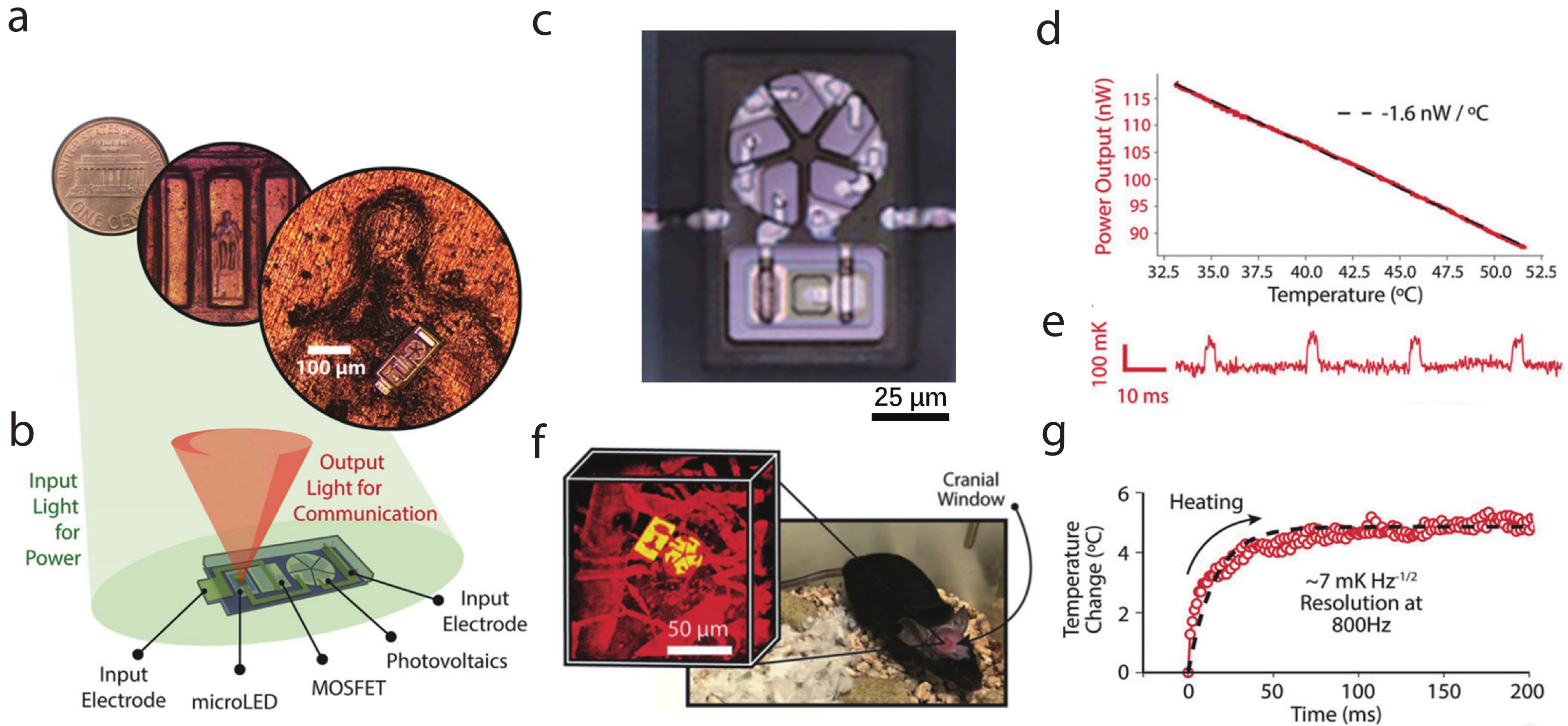 Fig. 5.  (Color online) Implantable optical wireless integrated circuit temperature sensor based on silicon and Ⅲ−Ⅴ semiconductors. (a) Optical micrograph of a voltage-sensing optical wireless integrated circuit (OWIC) on the back of a penny. (b) Schematic of the OWIC in operation, illustrating the integration of optical communication, power, and electronics into a fully integrated microscopic sensor package. (c) Optical image of the setup used for temperature measurement of the OWIC sensor. (d) Graph depicting the characteristics of optical power output as a function of temperature. (e) Measurement of small, rapid temperature changes induced by a resistive element adjacent to the OWIC temperature sensor. (f) 3D reconstruction of the implanted OWIC and vasculature in a mouse brain, with blood vessels labeled using fluorescein and imaged via three-photon microscopy (1320 nm excitation, red), while the implanted OWIC is visualized through label-free third harmonic generation (yellow). (g) In vivo optical recording of temperature from the OWIC sensor, as input power heats the device and surrounding tissue. Reproduced with permission from Ref. [46]. Copyright (2020) National Academy of Sciences.