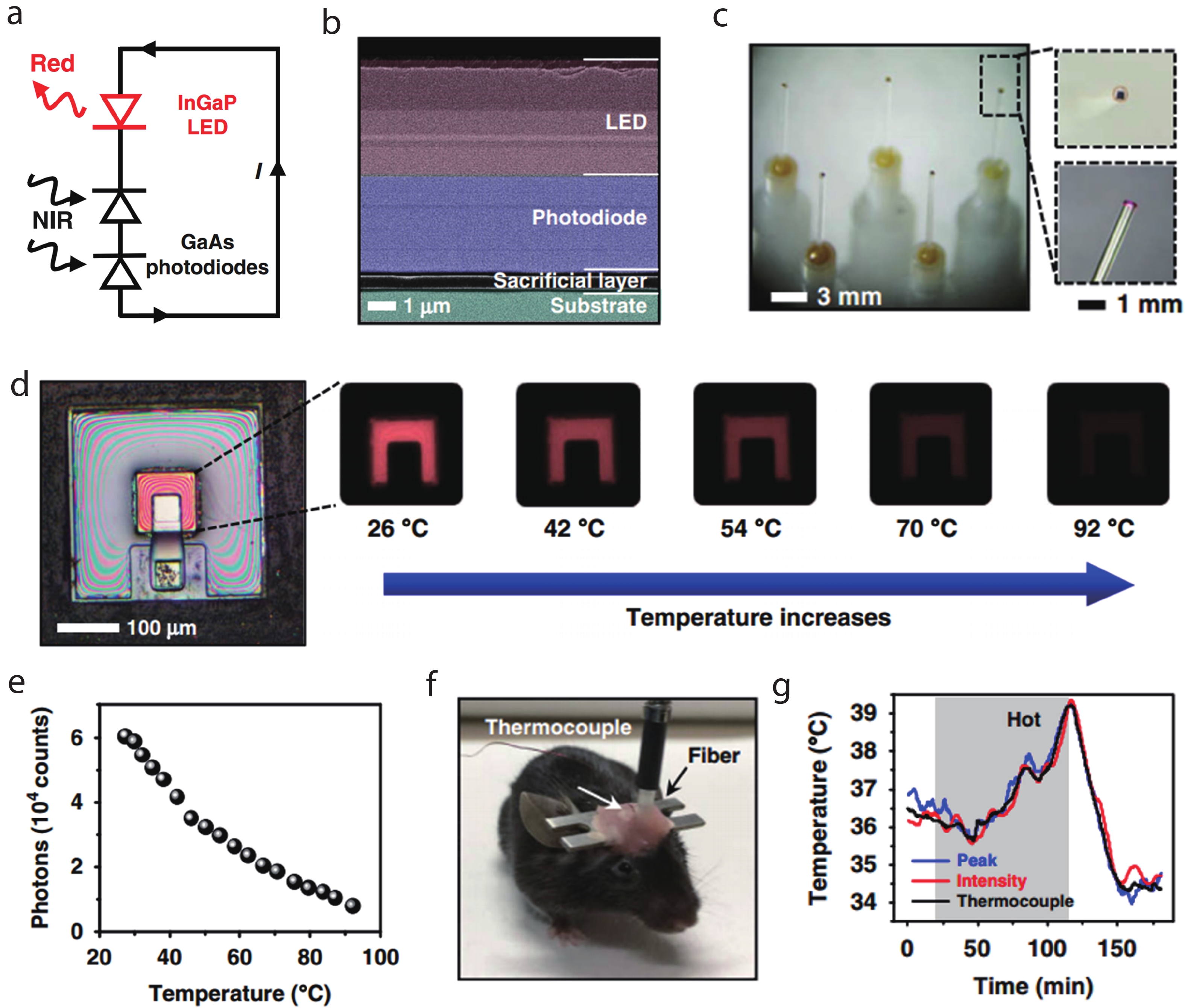 Fig. 6.  (Color online) Implantable optoelectronic upconversion temperature sensor based on Ⅲ−Ⅴ semiconductors. (a) Circuit schematic diagram of the optoelectronic temperature sensor, featuring an InGaP red LED and a GaAs double junction photodiode connected in series. (b) Scanning electron microscopy (SEM) image detailing the design of the optoelectronic upconversion device. (c) Optical image of upconversion devices transferred onto the tips of fibers (diameter approximately 600 µm), with insets providing a zoomed-in view of the fiber tips with a red-emitting device excited by coupled near-infrared light. (d) Microscopic top view of an upconversion device for temperature sensing under infrared excitation, along with the photoluminescence (PL) emissions of the device as temperature varies from 26 to 92 °C. (e) Relationship between PL intensity and temperature, measured by counting the average number of captured photons with an imaging sensor. (f) Optical image of a mouse with an implanted fiber sensor and thermocouple in the brain for temperature sensing. (g) Dynamic temperature signals obtained in the mouse brain compared to results recorded simultaneously with thermocouples, with the shaded gray region indicating when the mouse was placed in a hot environment (~40 °C). Reproduced with permission from [51]. Copyright (2022) Nature Publishing Group.