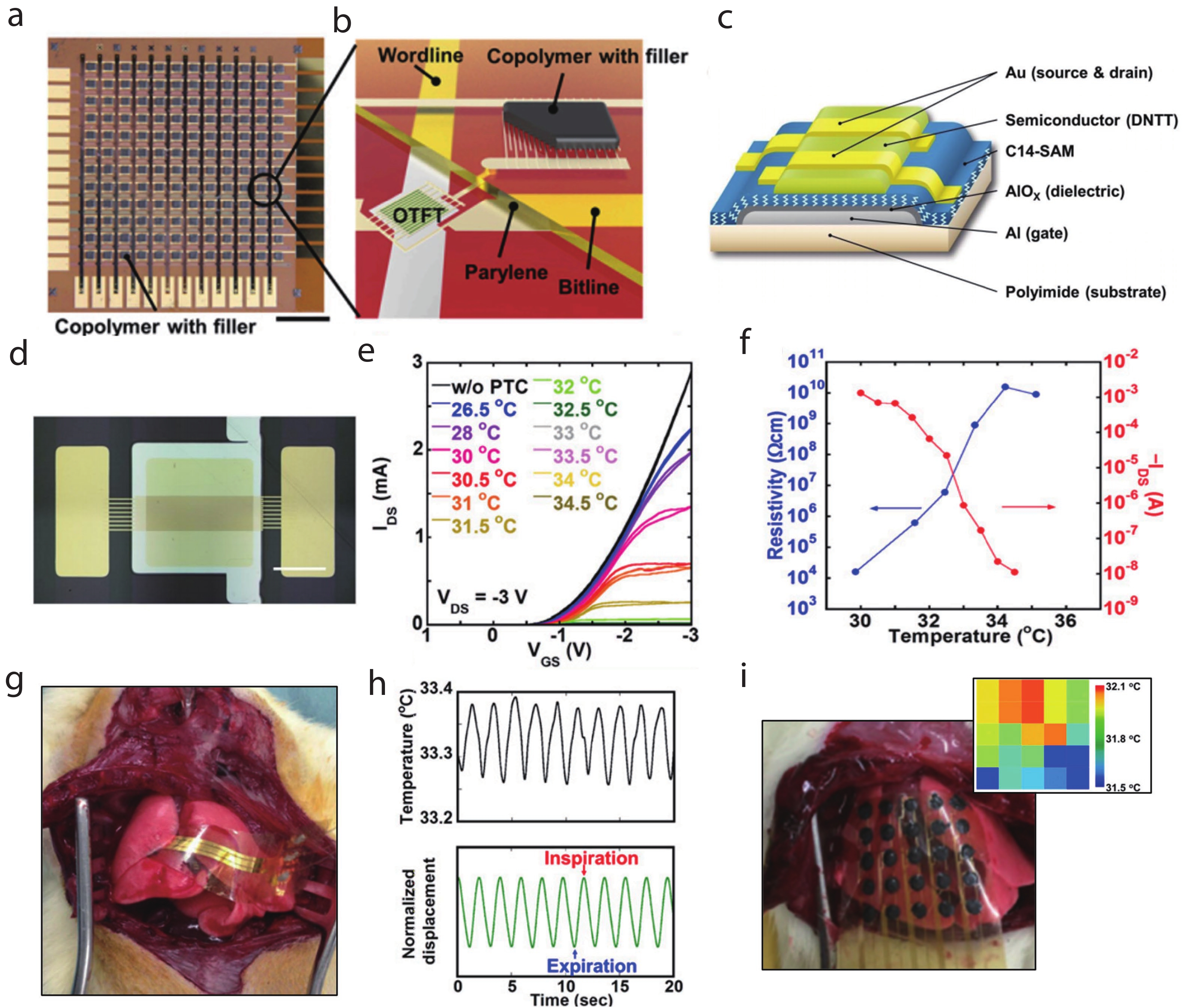 Fig. 7.  (Color online) Implantable physiological temperature sensor for organic semiconductor-based materials. (a) Image of a flexible 12 × 12 temperature sensor sheet (scale bar: 1 cm). (b) Cross-sectional illustration of a flexible large-area active-matrix sensor array with 12 × 12 temperature pixels. (c) Structure of the organic transistor, featuring a gate dielectric made of an anodized aluminum oxide layer and a phosphonic acid self-assembled monolayer (SAM); a 30 nm thick layer of dinaphtho[2, 3-b:2'9, 3'-f]thieno[3, 2-b]thiophene (DNTT) serves as the air-stable organic semiconductor forming the channel layer. (d) Optical image of the organic transistor. (e) Temperature dependence of the electrical characteristics after integrating the temperature sensor with the organic transistor. (f) Temperature dependence of the resistivity of the temperature sensor and the on-current of the organic transistor with the integrated temperature sensor. (g) Temperature measurement of respiratory lung tissue, illustrating heat exchange between the lung tissue and air. (h) Time course of the living lung's temperature (black: temperature output from the sensor, green: displacement of the lung surface). (i) Temperature mapping measurement of a rat lung using a 5 × 5 array of temperature sensors. Reproduced with permission from Ref. [55]. Copyright (2015) National Academy of Sciences.