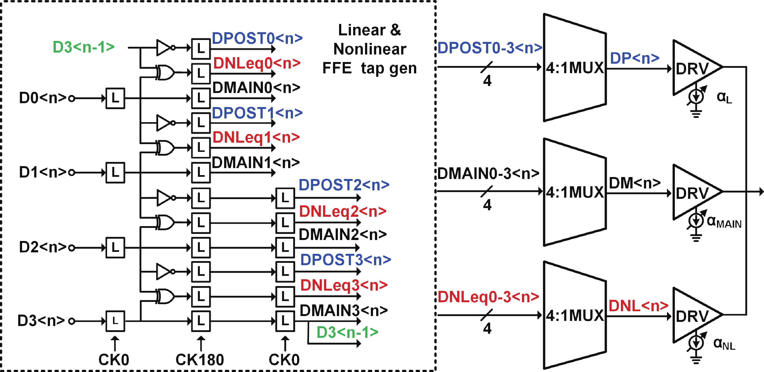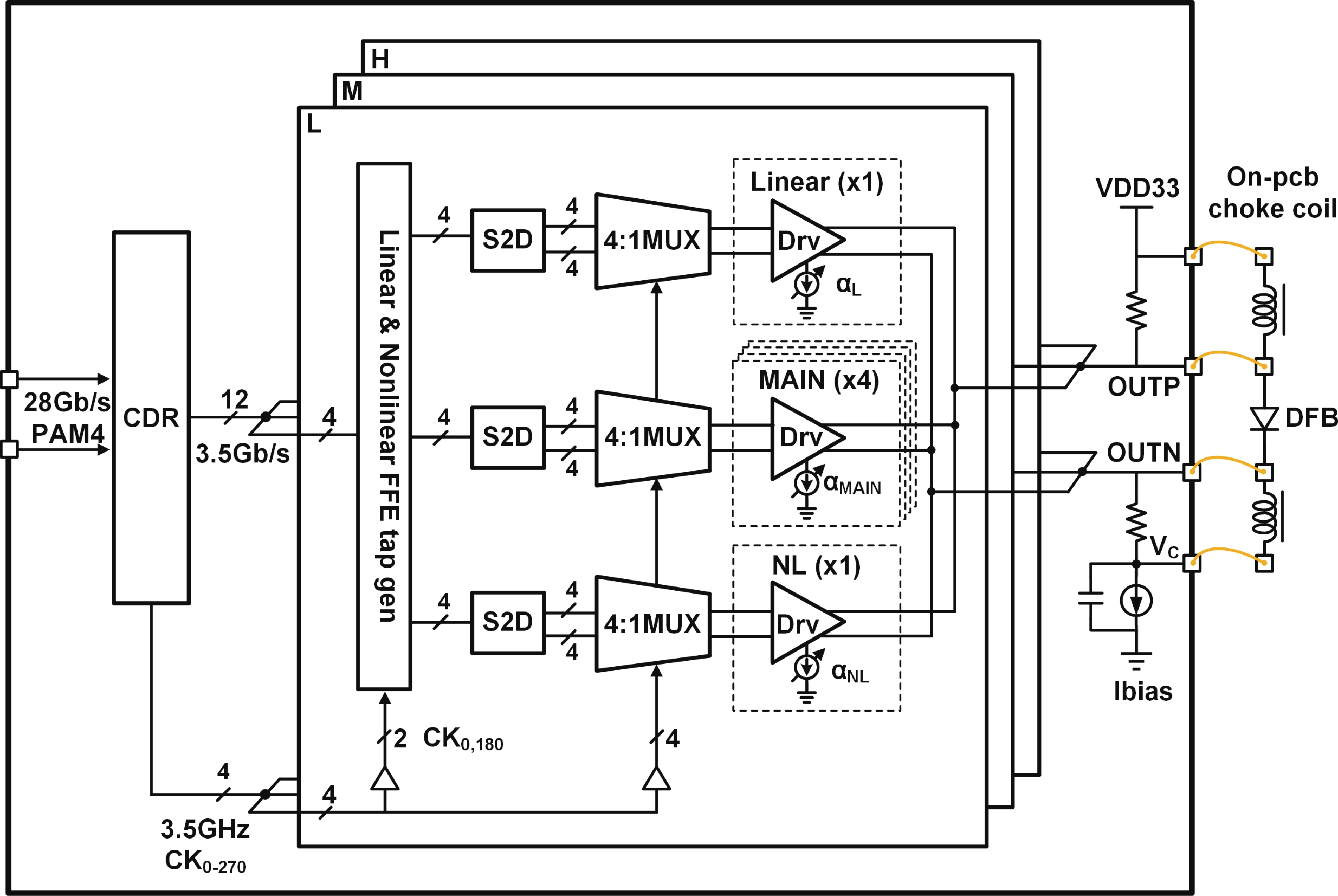 This paper presents a 4-level pulse amplitude modulation (PAM-4) distributed feedback (DFB) laser driver. The driver adopts a digital slicing architecture to achieve high linearity by adjusting the weights of three thermometer-coded main paths. An efficient-biased output stage structure is proposed to reduce power consumption while avoiding the degradation of output node bandwidth typically induced by parasitic capacitance in high-current bias path. A two-tap linear and nonlinear feed-forward equalizer (FFE) is implemented in the digital domain to extend bandwidth limitations and compensate for the dynamic nonlinearity of the DFB laser. The nonlinear FFE is realized at the cost of lower power consumption and smaller area by utilizing the simultaneity of low-speed parallel data. The chip is fabricated in 28 nm CMOS process. Measurement results indicate that, with a laser bias current of 40 mA, a modulation current of 20 mApp, and an operating rate of 32 Gb/s PAM-4, the overall power consumption of the chip is 372 mW, corresponding to an energy efficiency of 11.6 pJ/b. -