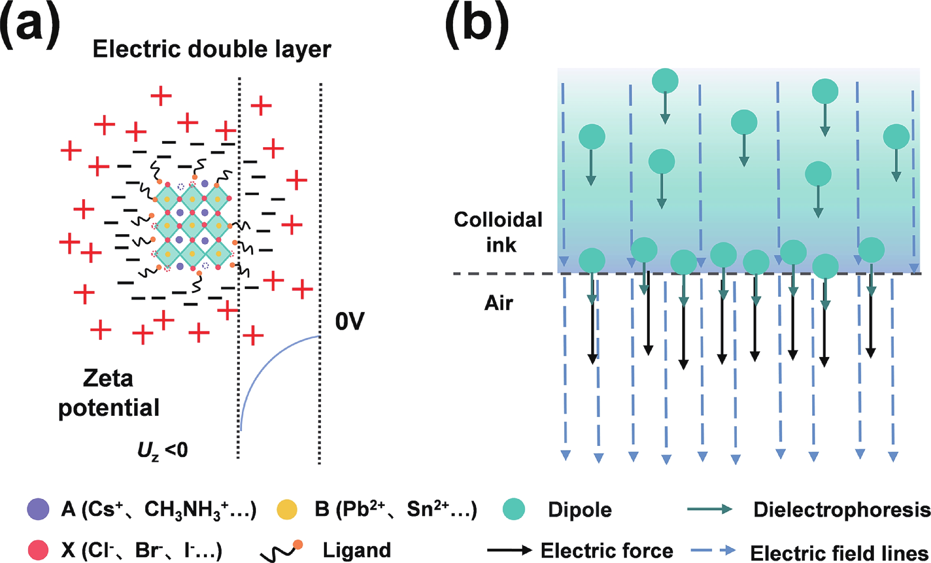 Electrohydrodynamic (EHD) inkjet printing has emerged as a powerful micro-/nanofabrication technique for high-resolution perovskite quantum dot (PeQD) color-conversion layers, offering precise control over pixel morphology, dimensions, and composition. This review systematically examines the mechanisms of cone-jet and electrostatic-attraction modes in EHD printing, highlighting recent advances in PeQD ink design, solvent and ligand engineering, and printing parameter optimization. Perovskite precursor and colloidal inks are discussed in detail, emphasizing strategies to enhance droplet ejection stability, suppress coffee-ring effects, and achieve uniform, high-luminescence pixels. Ligand exchange, dual-ligand passivation, and core−shell or polymer encapsulation are shown to effectively mitigate ion migration, surface defects, and environmental degradation, thereby improving photoluminescence efficiency and stability. Multi-channel and multi-nozzle EHD printing systems enable dynamic halide composition control and parallel RGB pixel deposition, facilitating ultrahigh-resolution patterning down to submicron feature sizes. Finally, the review highlights future directions, including synergistic PeQD material synthesis, advanced ink formulation, scalable high-throughput printing, and integration of PeQD color-conversion pixels into full-color micro-LED displays with minimal crosstalk and robust operational stability. These developments collectively demonstrate the immense potential of EHD inkjet printing for next-generation high-performance display technologies. -
