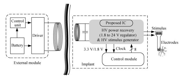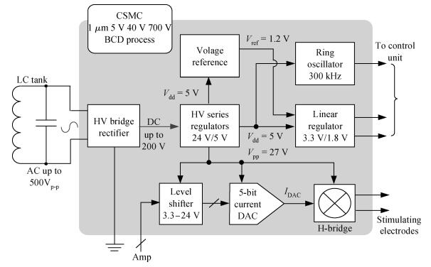 This paper present a highly-integrated neurostimulator with an on-chip inductive power-recovery frontend and high-voltage stimulus generator. In particular, the power-recovery frontend includes a high-voltage full-wave rectifier (up to 100 V AC input), high-voltage series regulators (24/5 V outputs) and a linear regulator (1.8/3.3 V output) with bandgap voltage reference. With the high voltage output of the series regulator, the proposed neurostimulator could deliver a considerably large current in high electrode-tissue contact impedance. This neurostimulator has been fabricated in a CSMC 1 μm 5/40/700 V BCD process and the total silicon area including pads is 5.8 mm2. Preliminary tests are successful as the neurostimulator shows good stability under a 13.56 MHz AC supply. Compared to previously reported works, our design has advantages of a wide induced voltage range (26-100 V), high output voltage (up to 24 V) and high-level integration, which are suitable for implantable neurostimulators. -
