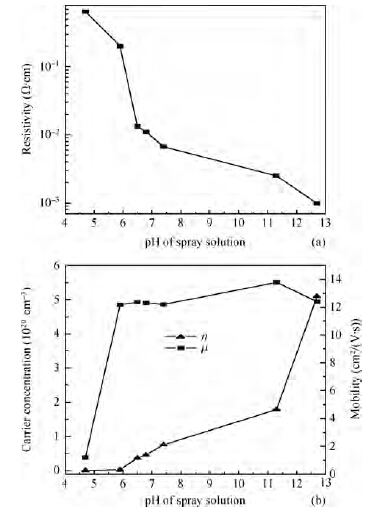 Highly conducting transparent cadmium oxide thin films were prepared by the conventional spray pyrolysis technique. The pH of the spray solution is varied by adding ammonia/hydrochloric acid. The effect of pH on the morphology, crystallinity and optoelectronic properties of these films is studied. The structural analysis showed all the films in the cubic phase. For the films with pH <7 (acidic condition), the preferred orientation is along the (111) direction and for those with pH >7 (alkaline condition), the preferred orientation is along the (200) direction. A lowest resistivity of 9.9 × 10-4 Ω · cm (with carrier concentration = 5.1 × 1020 cm-3, mobility = 12.4 cm2/(V· s)) is observed for pH ≈ 12. The resistivity is tuned almost by three orders of magnitude by controlling the bath pH with optical transmittance more than 70%. Thus, the electrical conductivity of CdO films could be easily tuned by simply varying the pH of the spray solution without compromising the optical transparency.-
