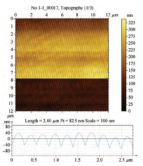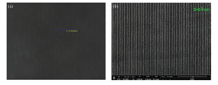 The second-order Bragg grating structure of an 808 nm distributed feedback semiconductor laser diode was designed and optimized. The grating with a period of 240 nm was fabricated on GaAs substrate by holographic photolithography and wet etching. Images of optical microscopy, scanning electron microscopy and atomic force microscopy show that the grating has a period of 240 nm, duty cycle of 0.25, depth of 80 nm, with perfect surface morphology, good fringe continuity and uniformity. -