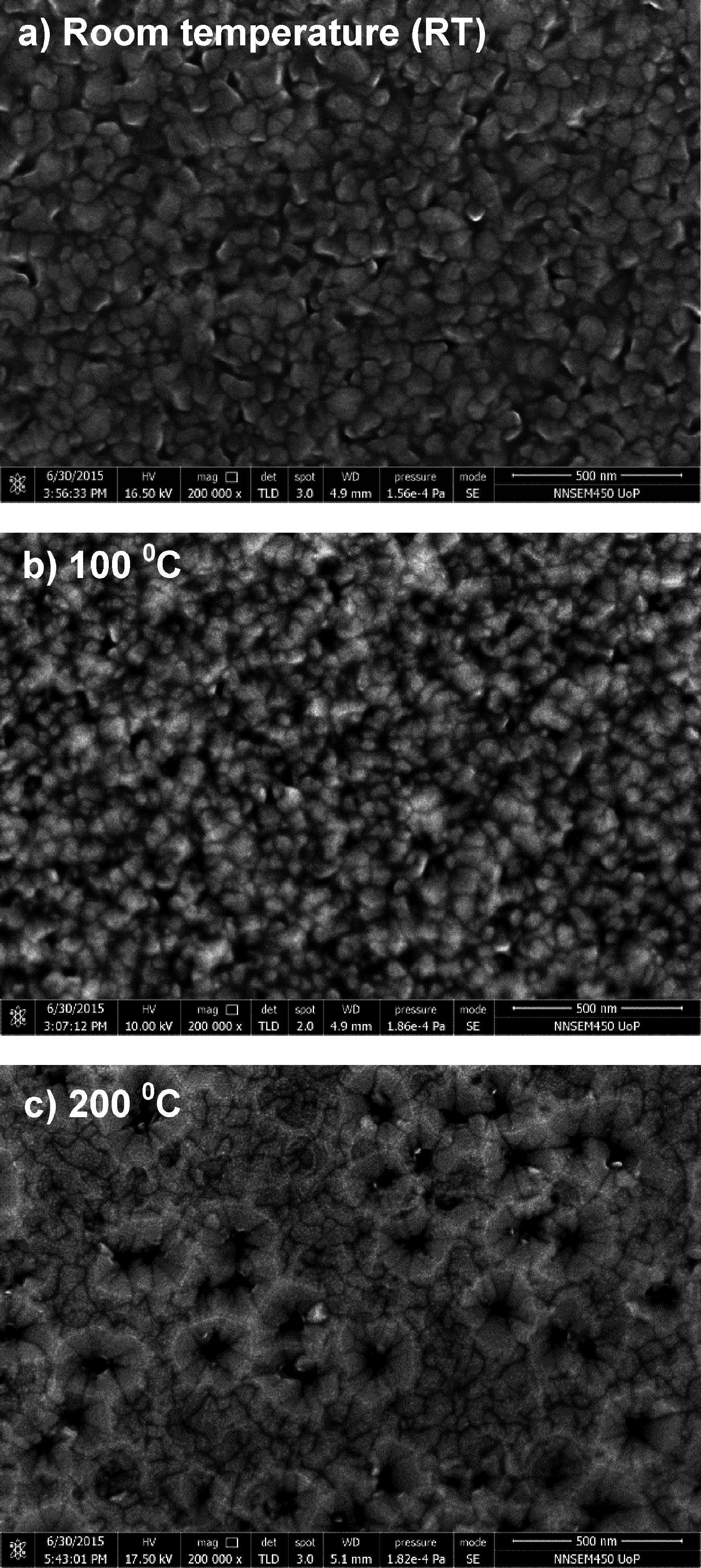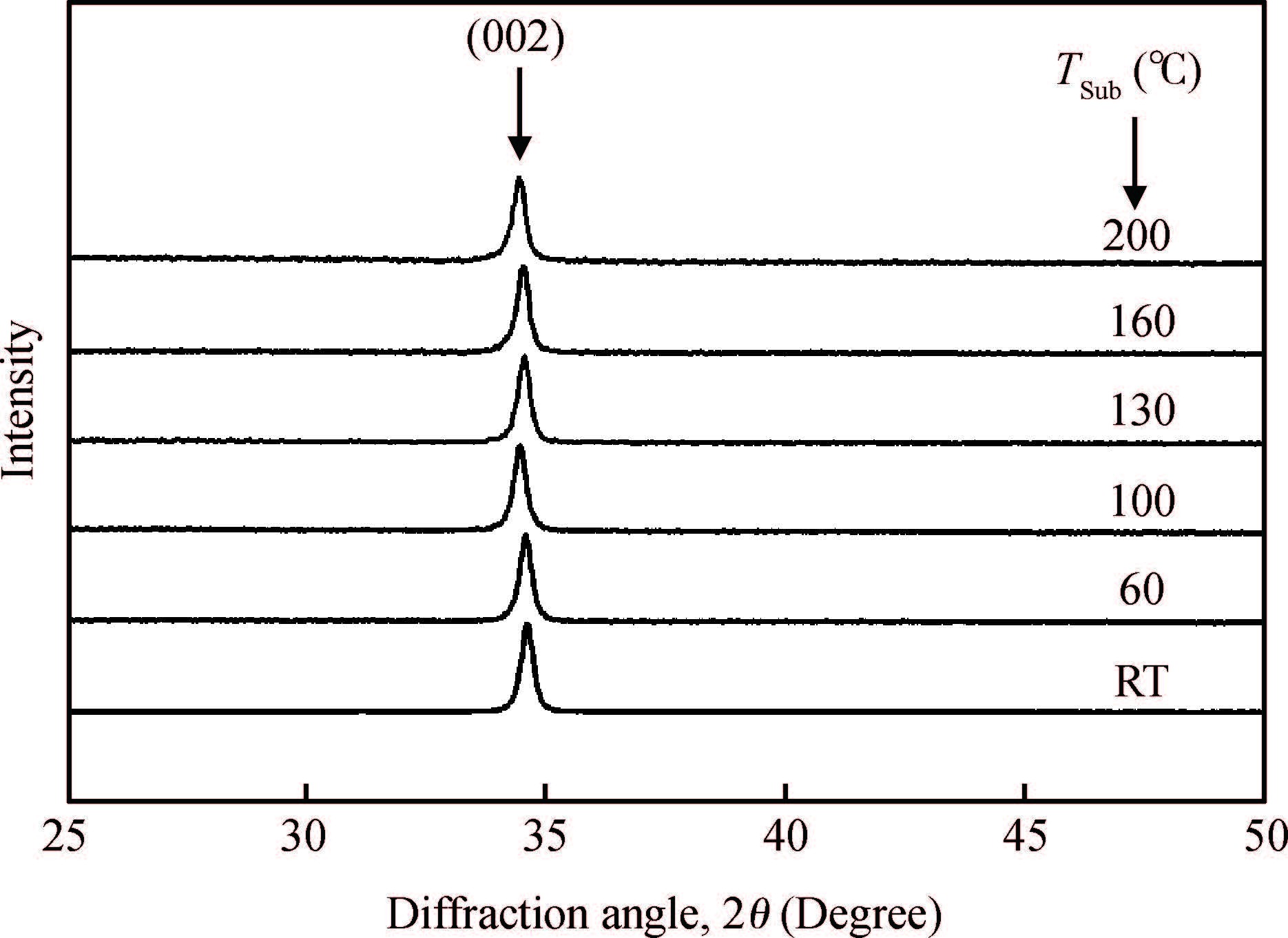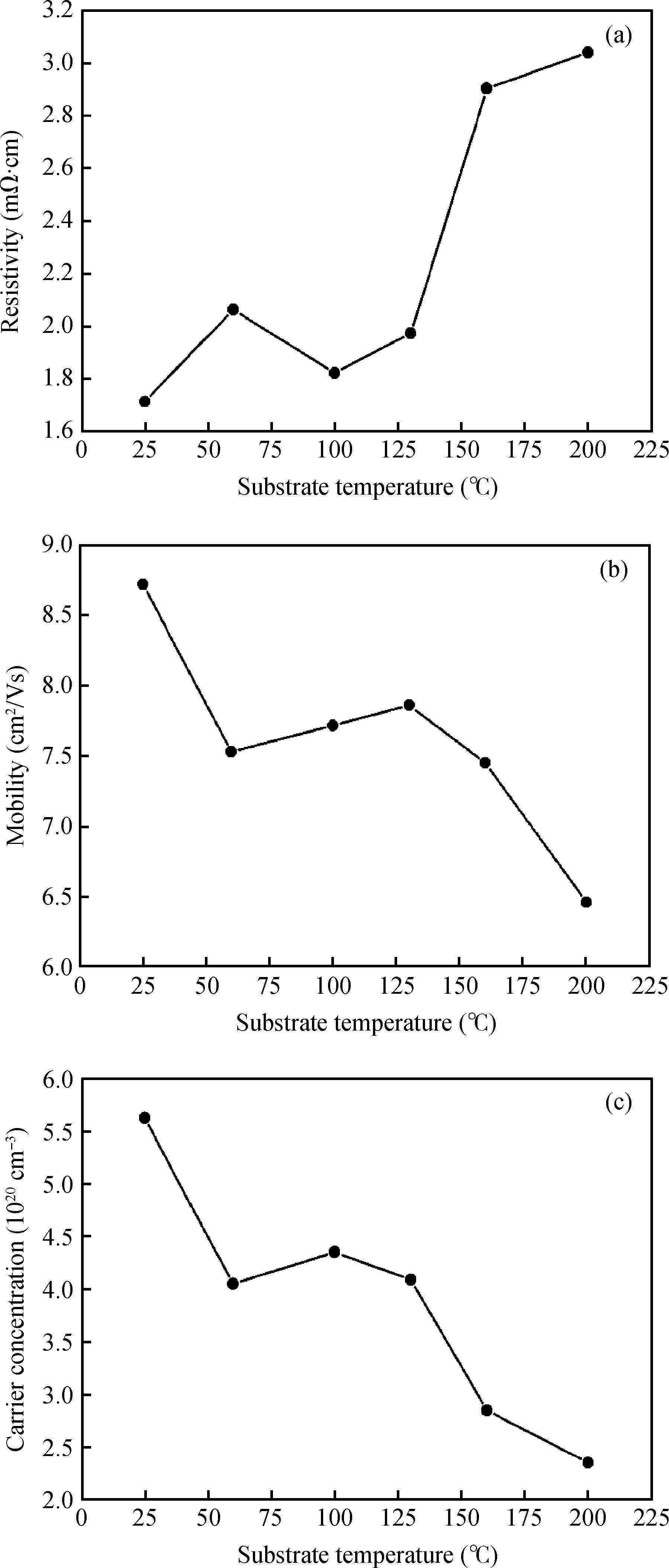 Transparent and conducting Al-doped ZnO (ZnO:Al) films were prepared on glass substrate using the RF sputtering method at different substrate temperatures from room temperature (RT) to 200℃. The structural, morphological, electrical and optical properties of these films were investigated using a variety of characterization techniques such as low angle XRD, Raman spectroscopy, X-ray photoelectron spectroscopy (XPS), field-emission scanning electron microscopy (FE-SEM), Hall measurement and UV-visible spectroscopy. The electrical properties showed that films deposited at RT have the lowest resistivity and it increases with an increase in the substrate temperature whereas carrier mobility and concentration decrease with an increase in substrate temperature. Low angle XRD and Raman spectroscopy analysis reavealed that films are highly crystalline with a hexagonal wurtzite structure and a preferred orientation along the c-axis. The FE-SEM analysis showed that the surface morphology of films is strongly dependent on the substrate temperature. The band gap decreases from 3.36 to 3.29 eV as the substrate temperature is increased from RT to 200℃. The fundamental absorption edge in the UV region shifts towards a longer wavelength with an increase in substrate temperature and be attributed to the Burstein-Moss shift. The synthesized films showed an average transmission (>85%) in the visible region, which signifies that synthesized ZnO:Al films can be suitable for display devices and solar cells as transparent electrodes.-