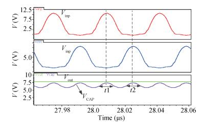 A common-gate bootstrapped CMOS rectifier dedicated for VHF (very high frequency) isolated DC-DC converter is proposed.It uses common-gate bootstrapped technique to compensate the power loss due to the threshold voltage, and to solve the reflux problem in the conventional rectifier circuit.As a result, it improves the power conversion efficiency (PCE) and voltage conversion ratio (VCR).The design saves almost 90% of the area compared to a previously reported double capacitor structure.In addition, we compare the previous rectifier with the proposed common-gate bootstrapped rectifier in the case of the same area; simulation results show that the PCE and VCR of the proposed structure are superior to other structures.The proposed common-gate bootstrapped rectifier was fabricated by using CSMC 0.5 μm BCD process.The measured maximum PCE is 86% and VCR achieves 77% at the operating frequency of 20 MHz.The average PCE is about 79% and average VCR achieves 71% in the frequency range of 30-70 MHz.Measured PCE and VCR have been improved compared to previous results. -