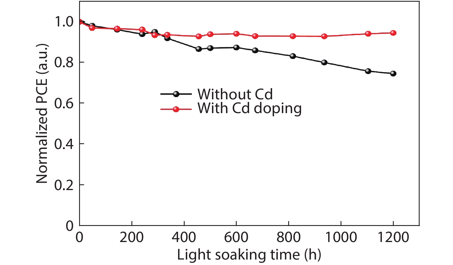 Although perovskite solar cells containing methylamine cation can show high power conversion efficiency, stability is a concern. Here, methylamine-free perovskite material CsxFA1–xPbI3 was synthesized by a one-step method. In addition, we incorporated smaller cadmium ions into mixed perovskite lattice to partially replace Pb ions to address the excessive internal strain in perovskite structure. We have found that the introduction of Cd can improve the crystallinity and the charge carrier lifetime of perovskite films. Consequently, a power conversion efficiency as high as 20.59% was achieved. More importantly, the devices retained 94% of their initial efficiency under 1200 h of continuous illumination.-