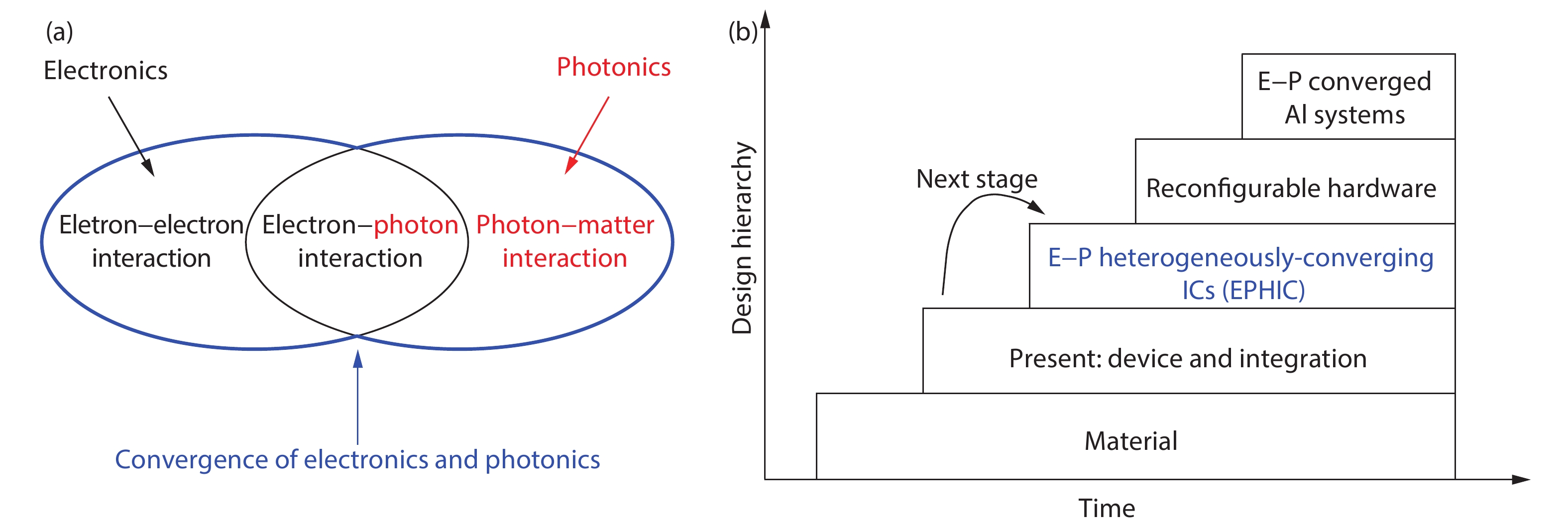 Fig. 1.  (Color online) (a) The convergence of electronics and photonics. (b) Design hierarchy of electronic-photonic convergence[2].