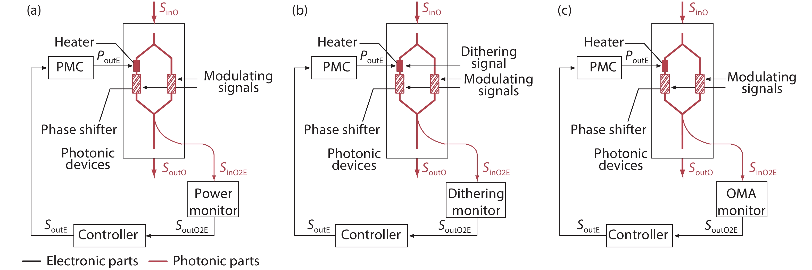 Fig. 11.  Bias control schemes. (a) Output power monitor method. (b) Dithering method. (c) OMA monitor methods.