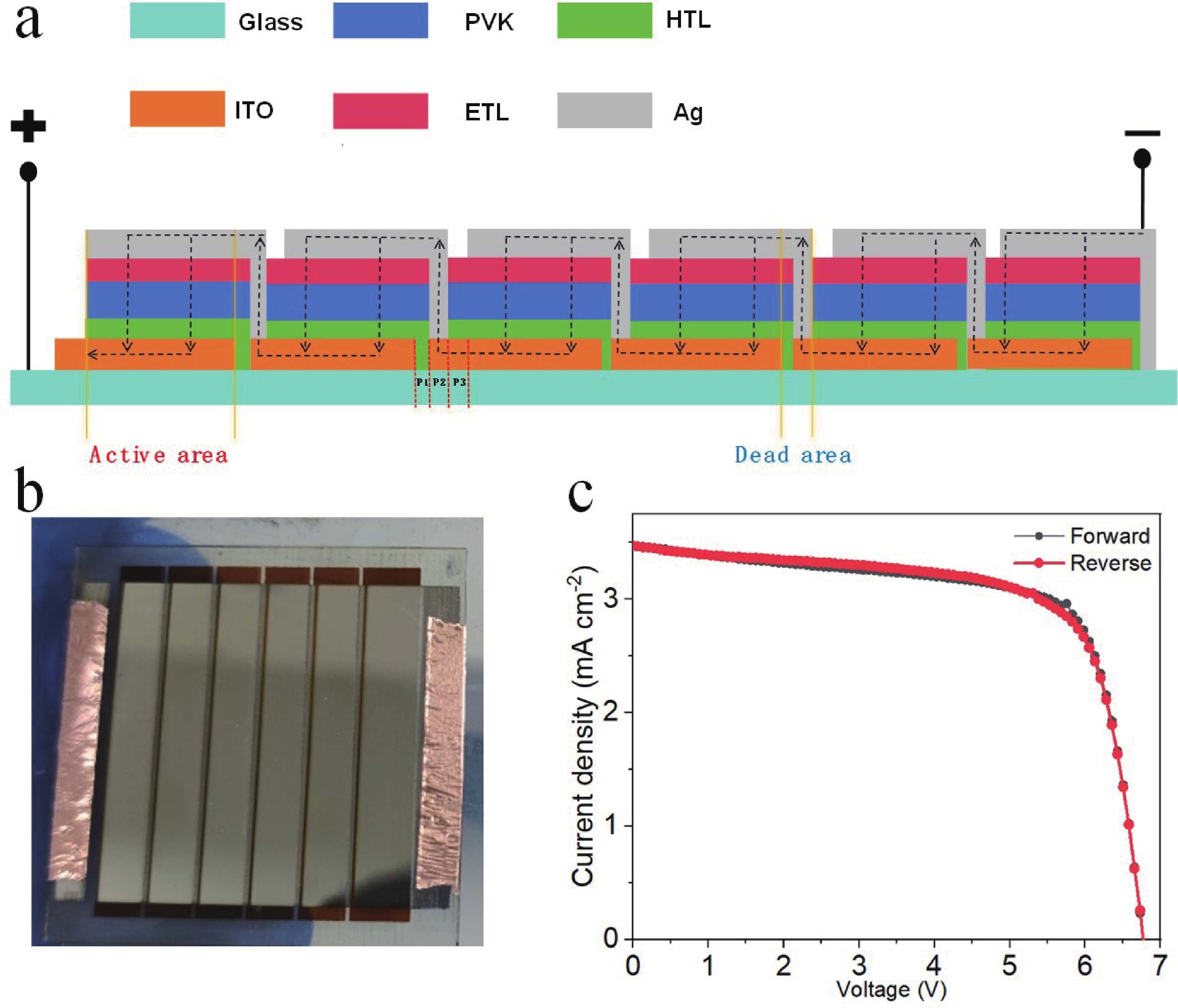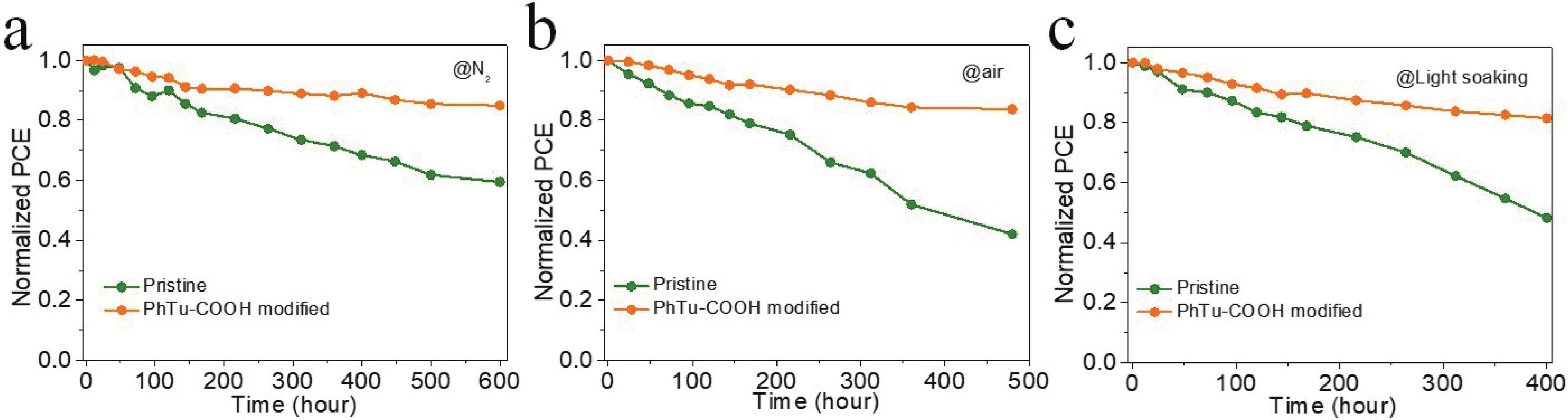 Although the certified power conversion efficiency (PCE) of single-junction perovskite solar cells (PSCs) has achieved a high level of 27%, approaching the single-crystalline silicon solar cells, the device stability remains an urgent issue to be resolved for the commercialization. Defect passivation emerged as a viable approach to enhance the operational stability of the solar devices. Herein, phenylthiourea (PhTu) derivatives are selected as effective passivation agents to enhance the optoelectronic properties of printed methylammonium lead iodide (MAPbI3) films. It is demonstrated that incorporating a small amount of 1-(4-carboxyphenyl)-2-thiourea (PhTu-COOH) significantly reduces the trap-state density and leads to longer carrier lifetime of the perovskite films. As a result, the inverted solar device made of PhTu-COOH-modified MAPbI3 perovskite film shows remarkably improved efficiency (from 17.29% to 20.22%) and obviously increased open-circuit voltage (VOC) (from 1.043 to 1.143 V), as compared with the pristine device. Moreover, the PhTu-COOH-modified PSCs exhibit enhanced operational stability due to the significantly reduced trap-state density. Finally, the optimized solar module fabricated with an active area of 11.28 cm2 delivers a high PCE of 17.07% with negligible VOC loss, demonstrating the feasibility of the blade-coating method for large-area perovskite film deposition.